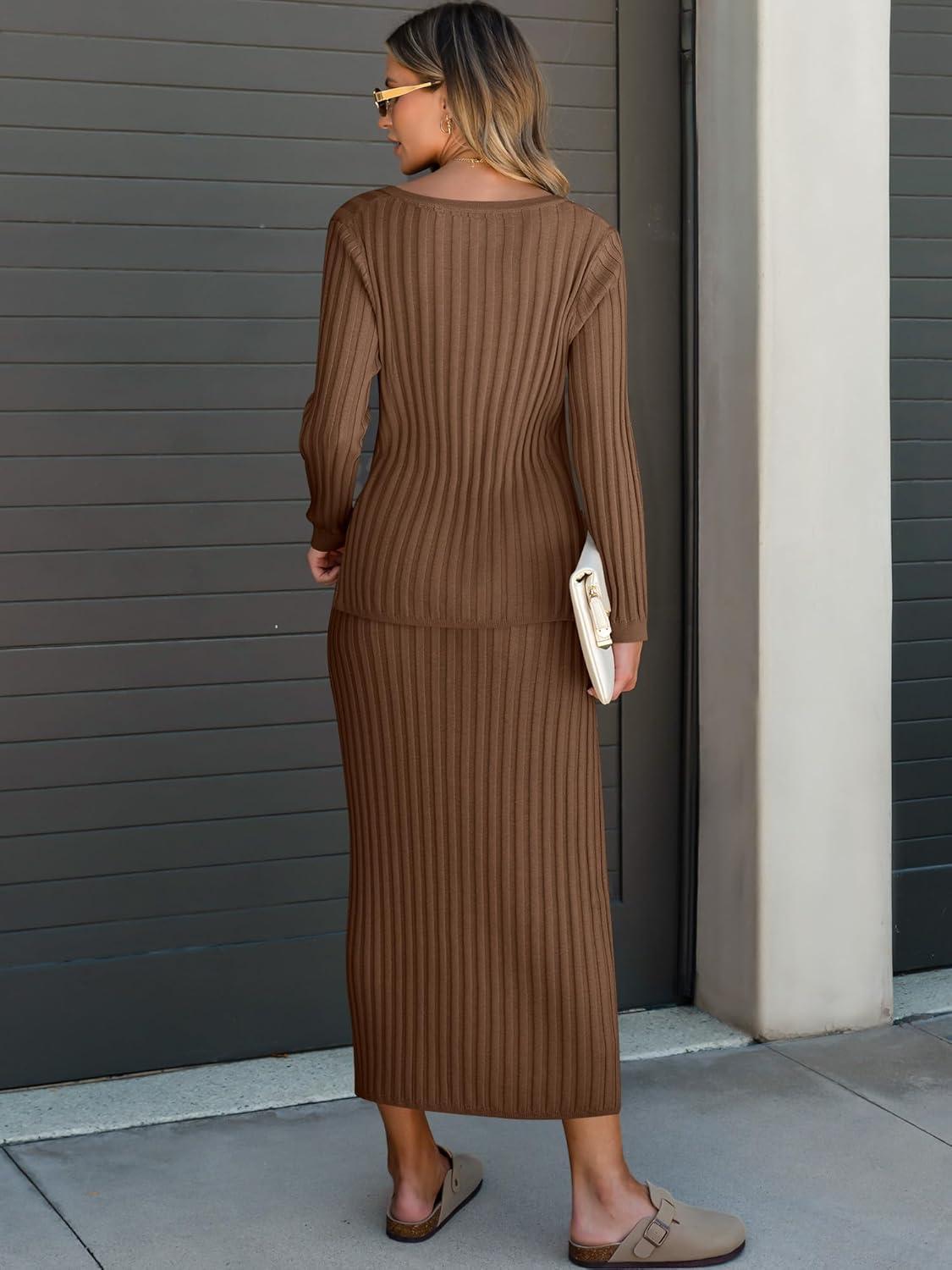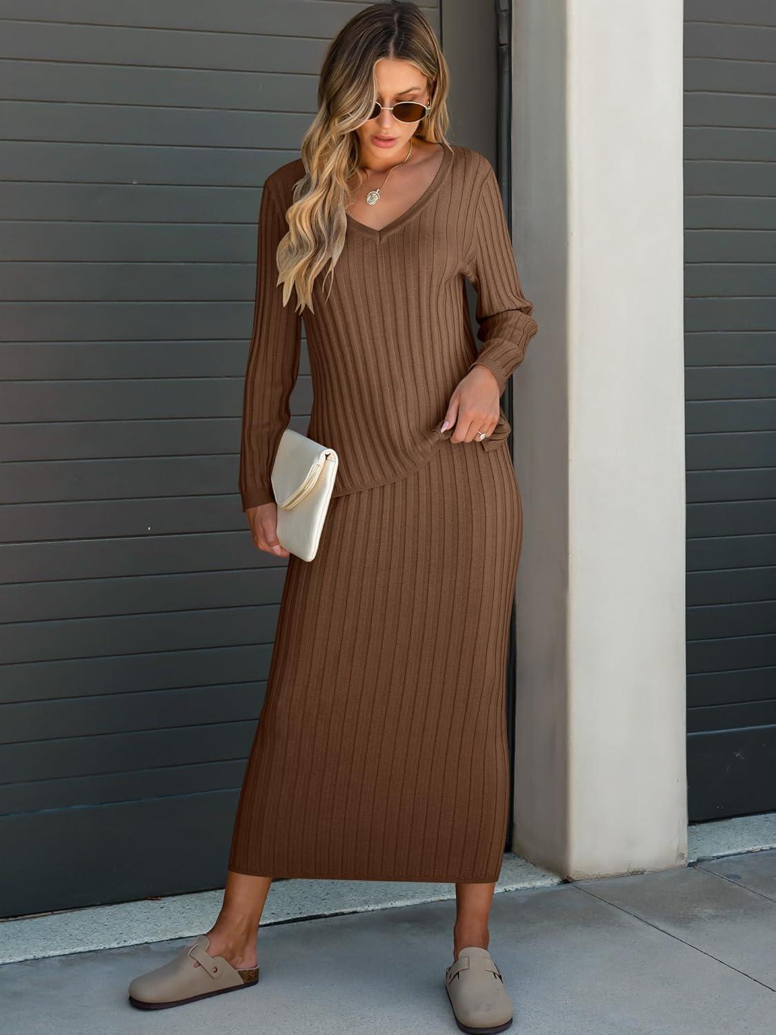 ANRABESS Women’s 2 Piece Outfits Sweater Skirt Sets Casual Long Sleeve V Neck Ribbed Knit Tops Midi Dress 2025 Fall Fashion(Brown)