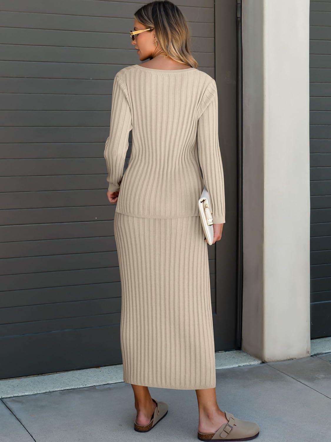 ANRABESS Women's 2 Piece Outfits Sweater Skirt Sets Casual Long Sleeve V Neck Ribbed Knit Tops Midi Dress 2025 Fall Fashion(Khaki)