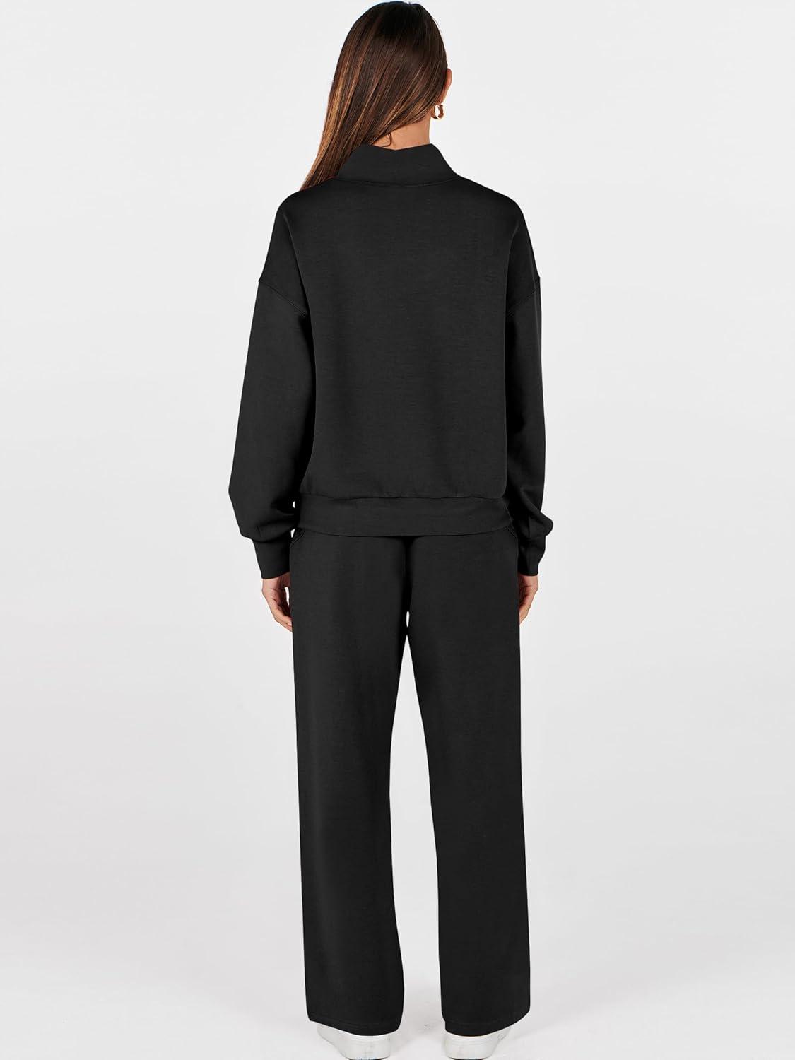 ANRABESS Womens 2 Piece Outfits Sweatsuit Set 2025 Fall Drawstring Sweatshirt Wide Leg Sweatpant Lounge Set Tracksuit(Black)