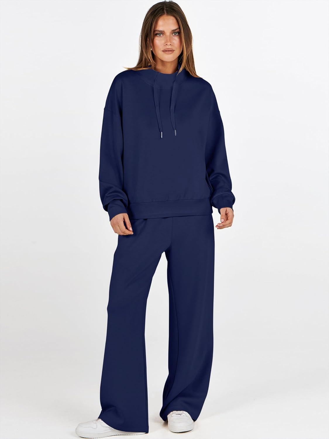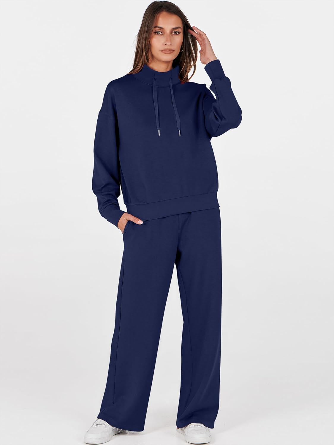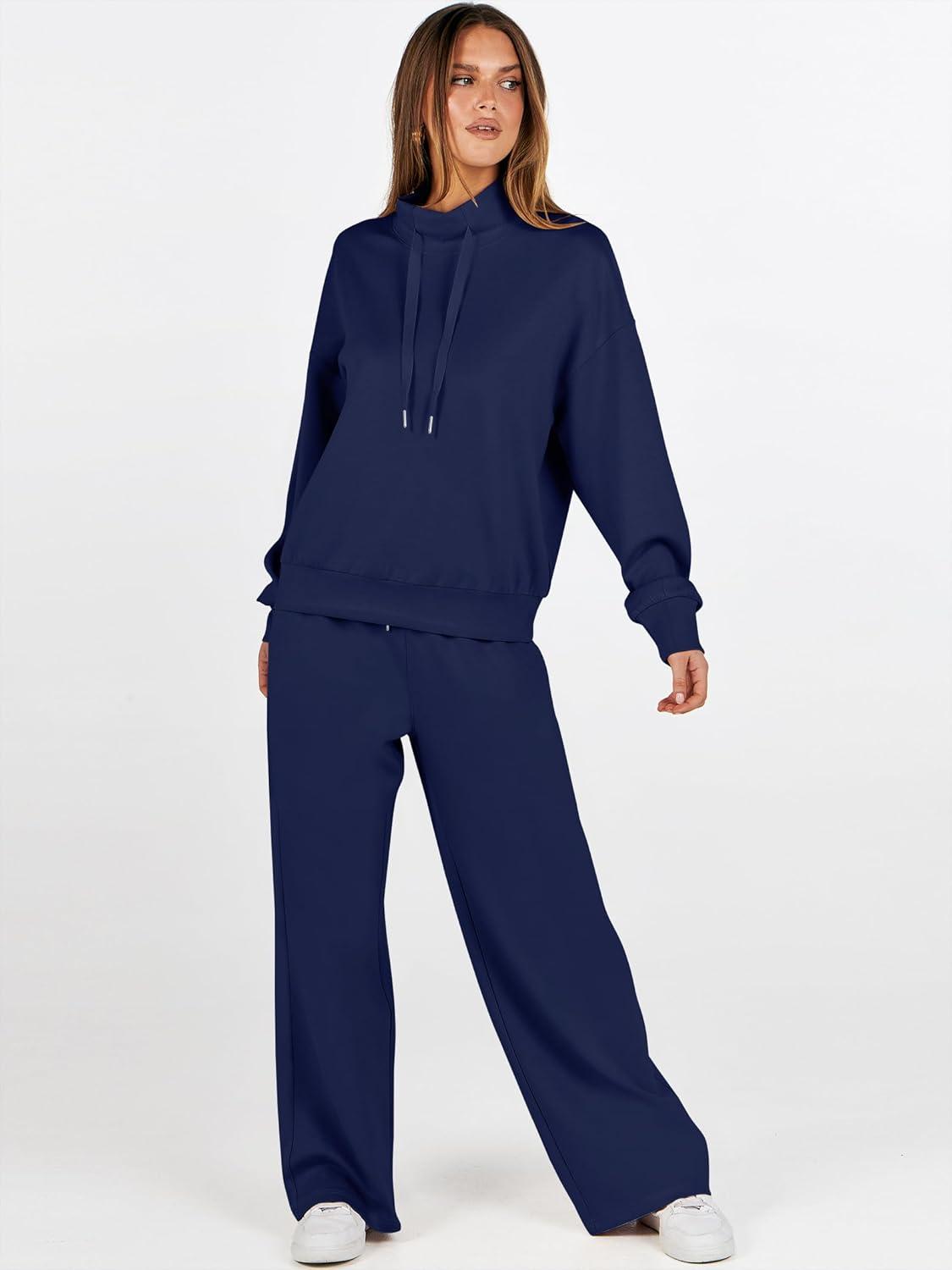 ANRABESS Womens 2 Piece Outfits Sweatsuit Set 2025 Fall Drawstring Sweatshirt Wide Leg Sweatpant Lounge Set Tracksuit(Navy Blue)