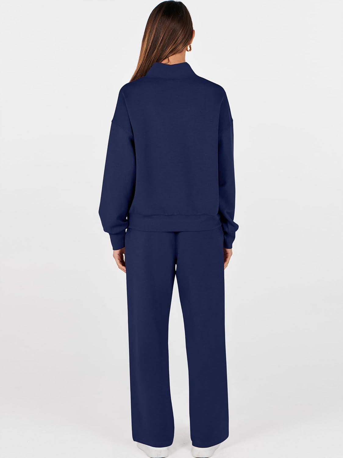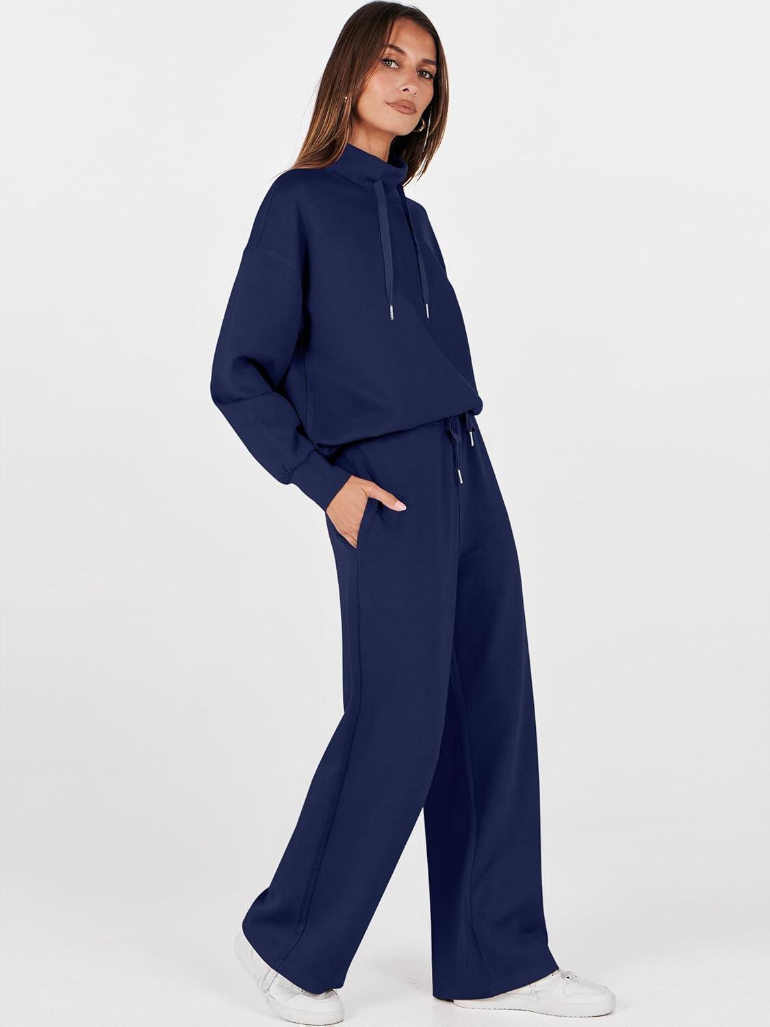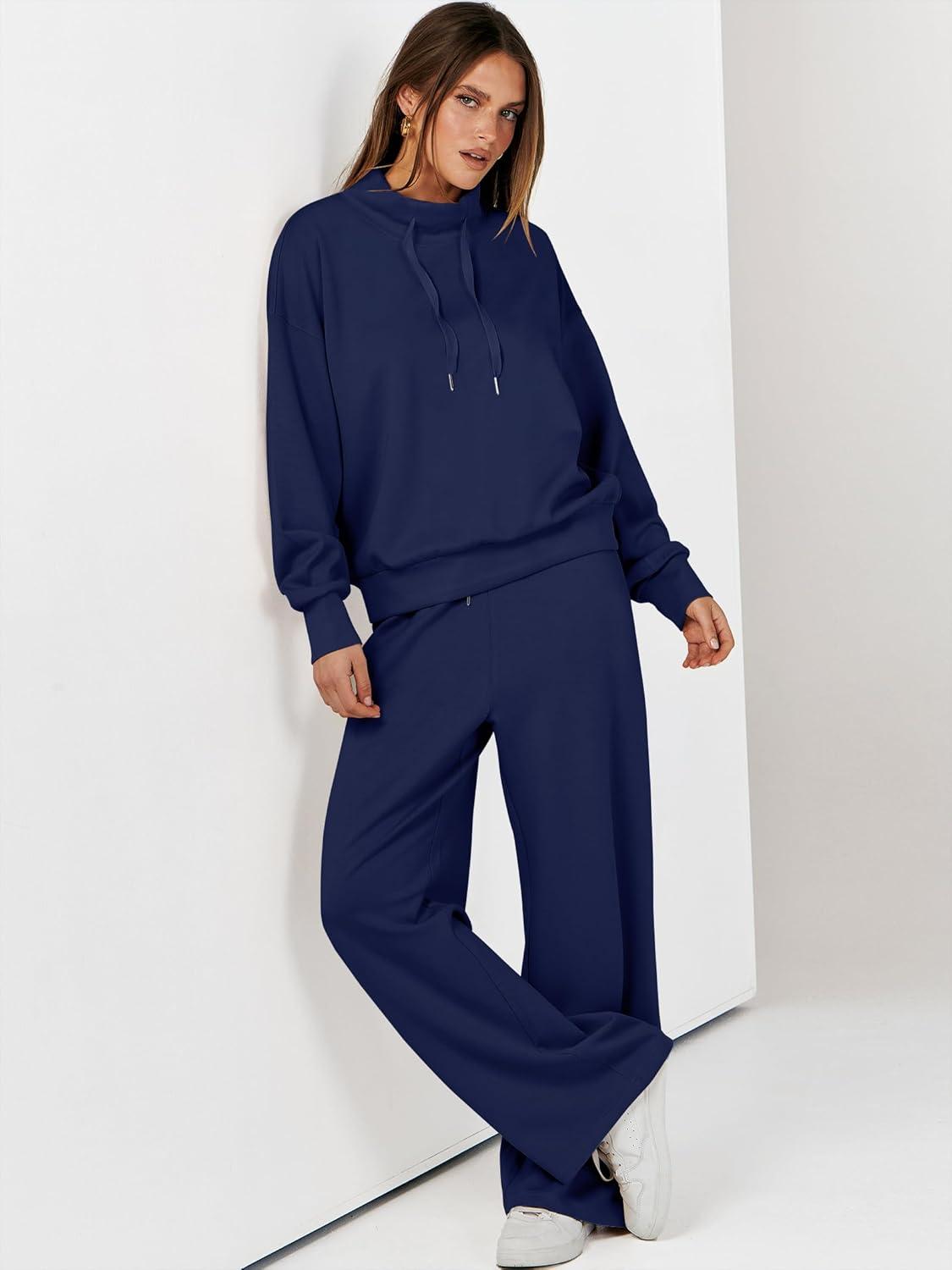 ANRABESS Womens 2 Piece Outfits Sweatsuit Set 2025 Fall Drawstring Sweatshirt Wide Leg Sweatpant Lounge Set Tracksuit(Navy Blue)