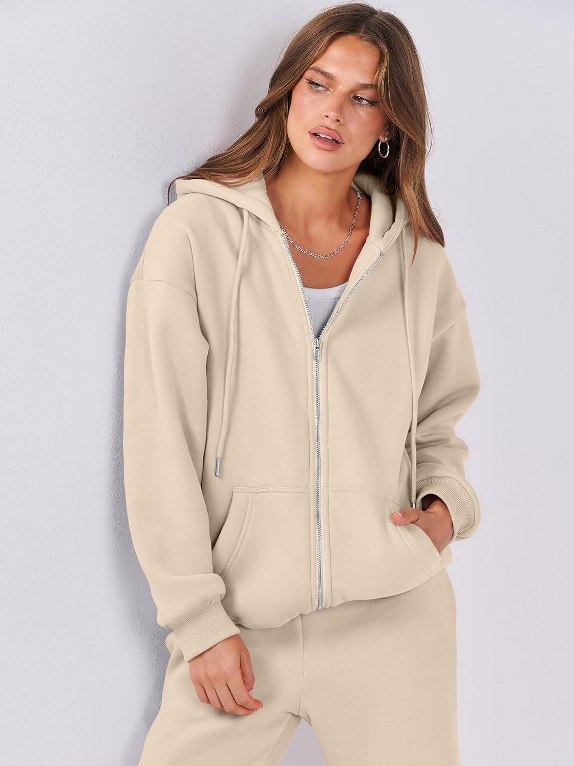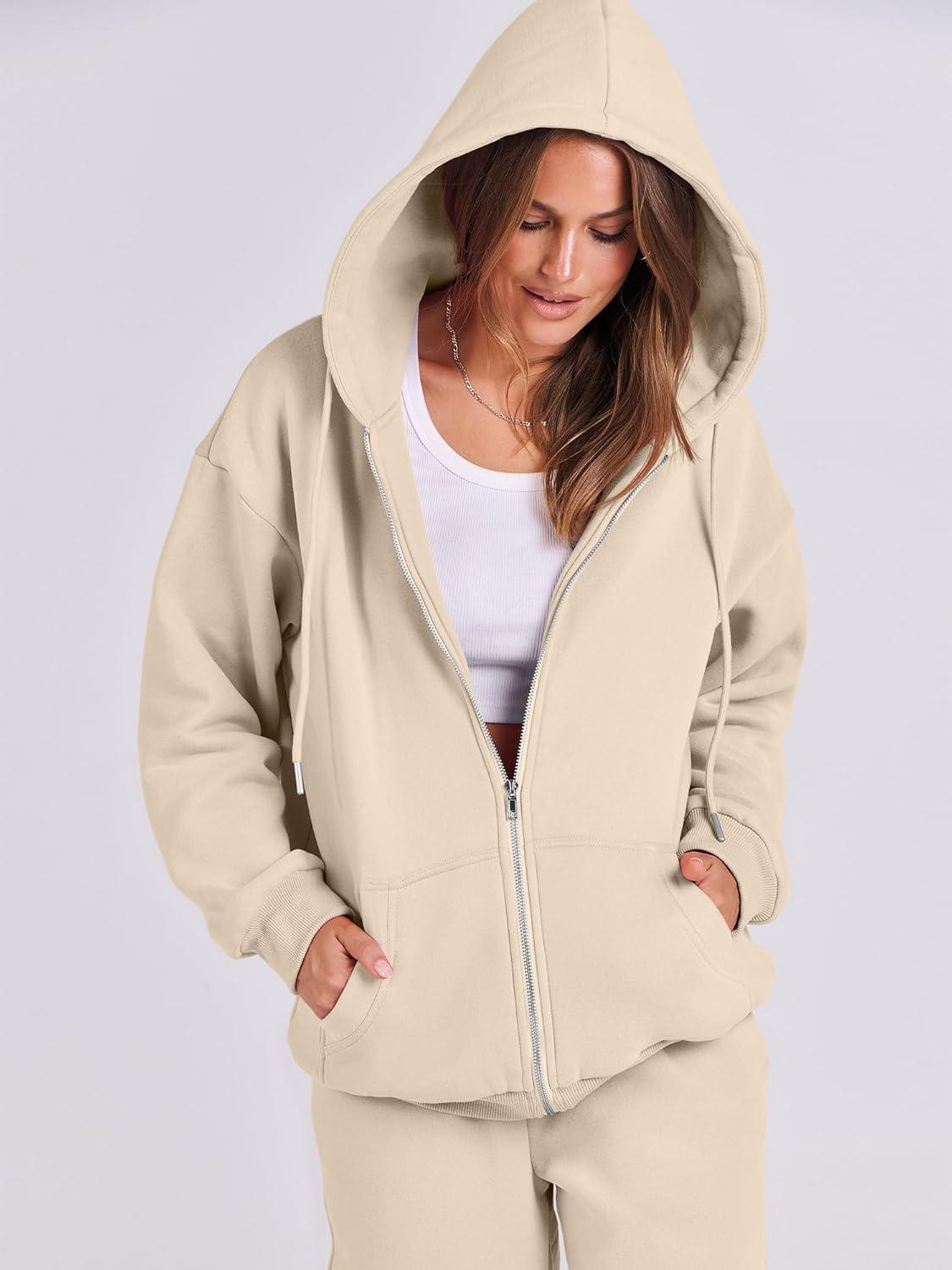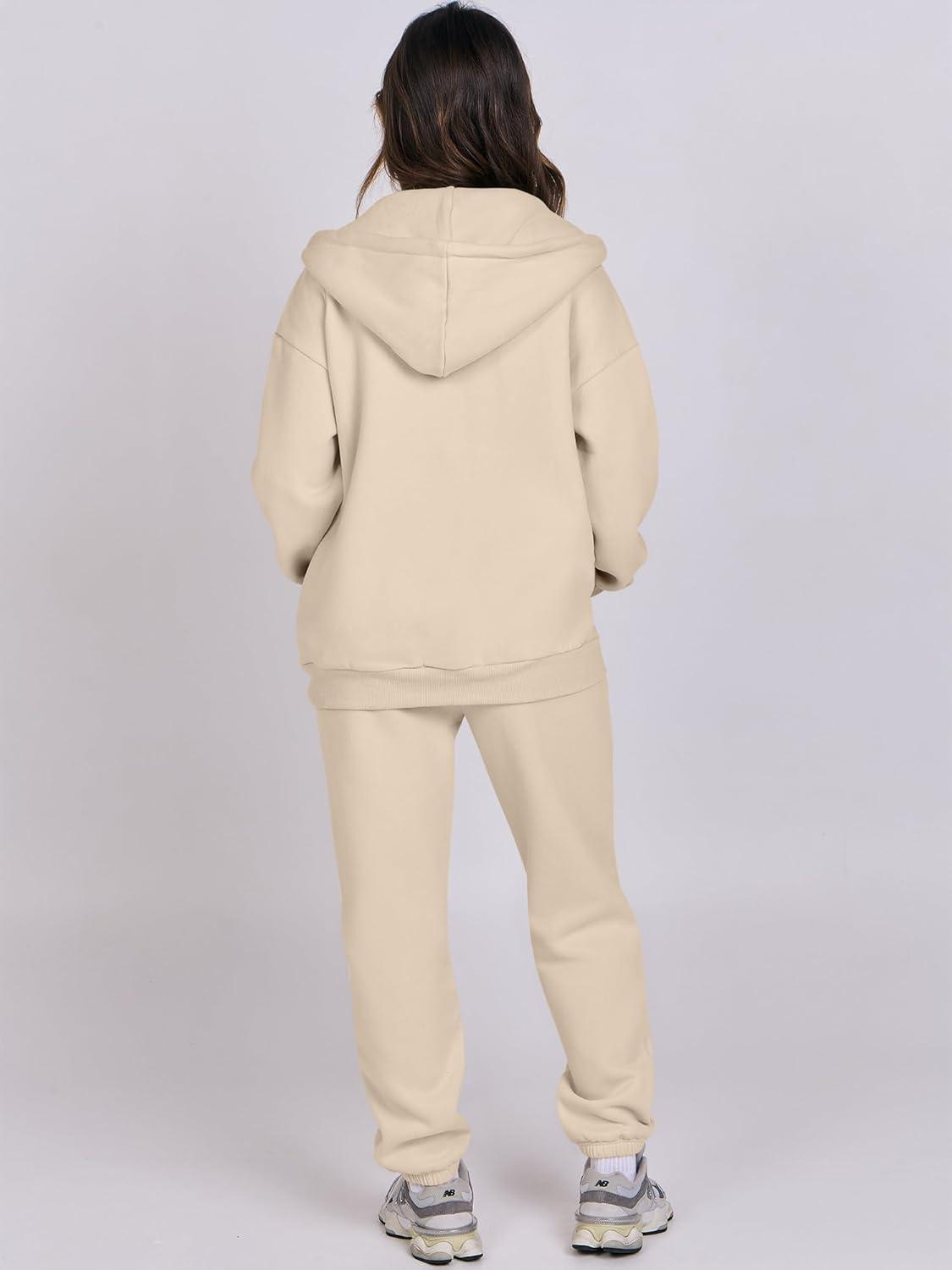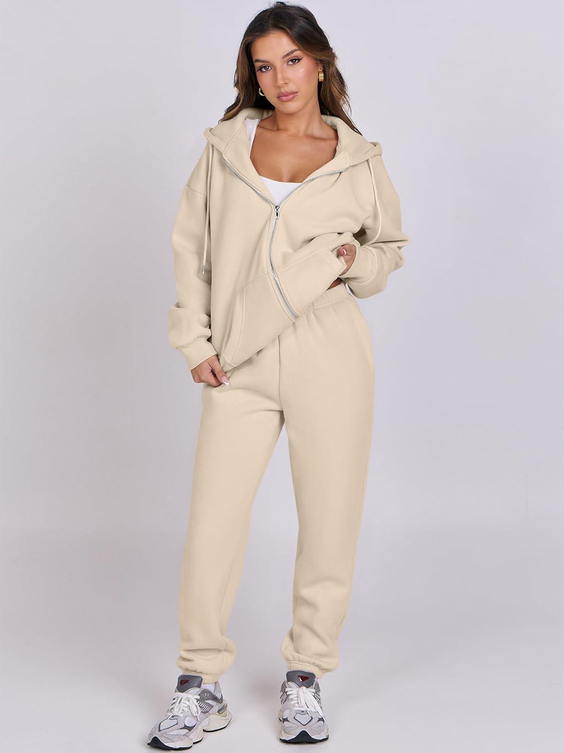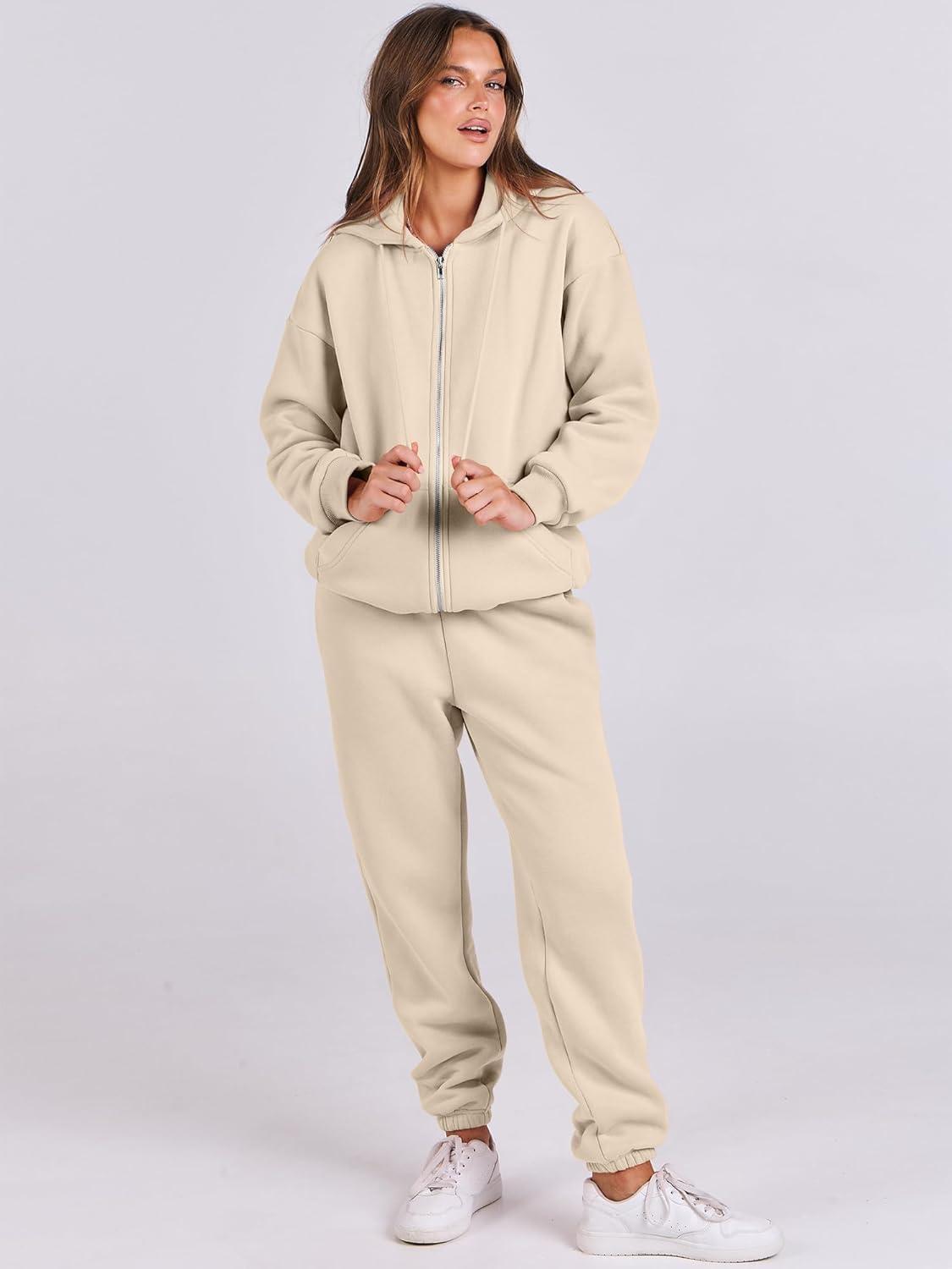 ANRABESS Womens 2 Piece Outfits Sweatsuits Oversized Zip Up Sweatshirt Jogger Sweatpants Tracksuit Sweat Lounge Matching Set(Beige)