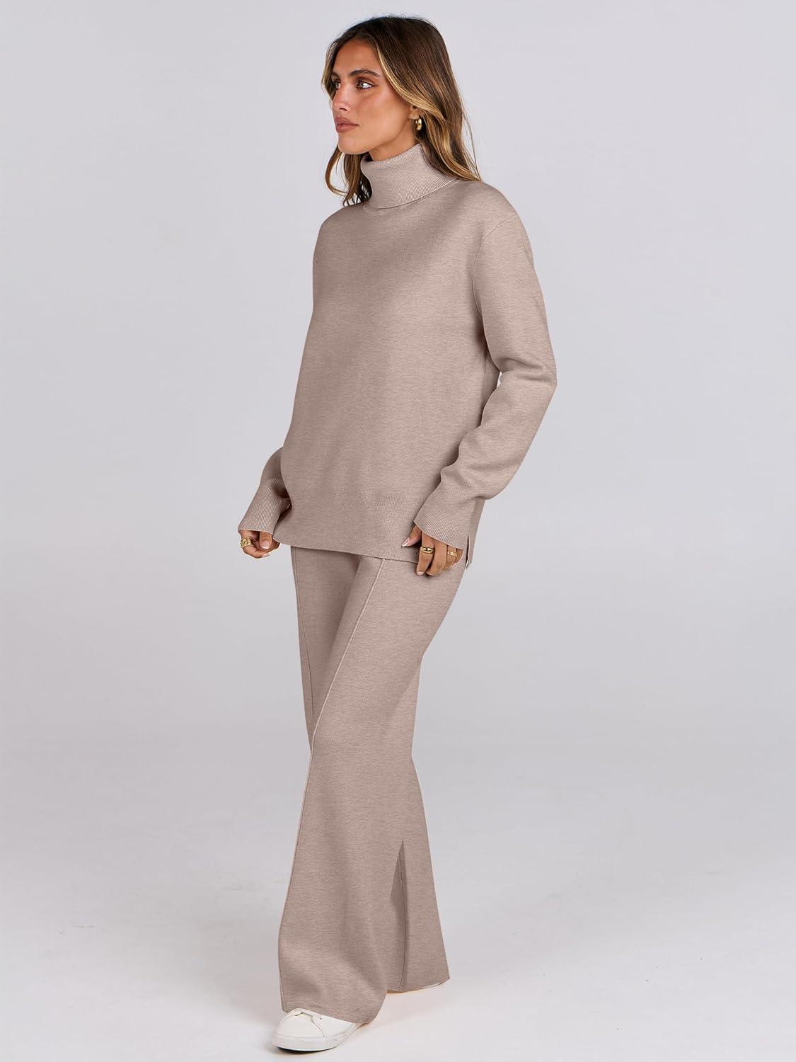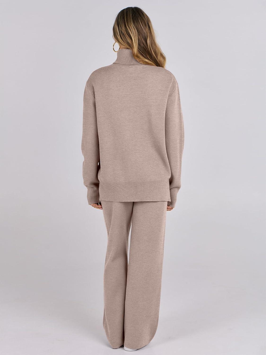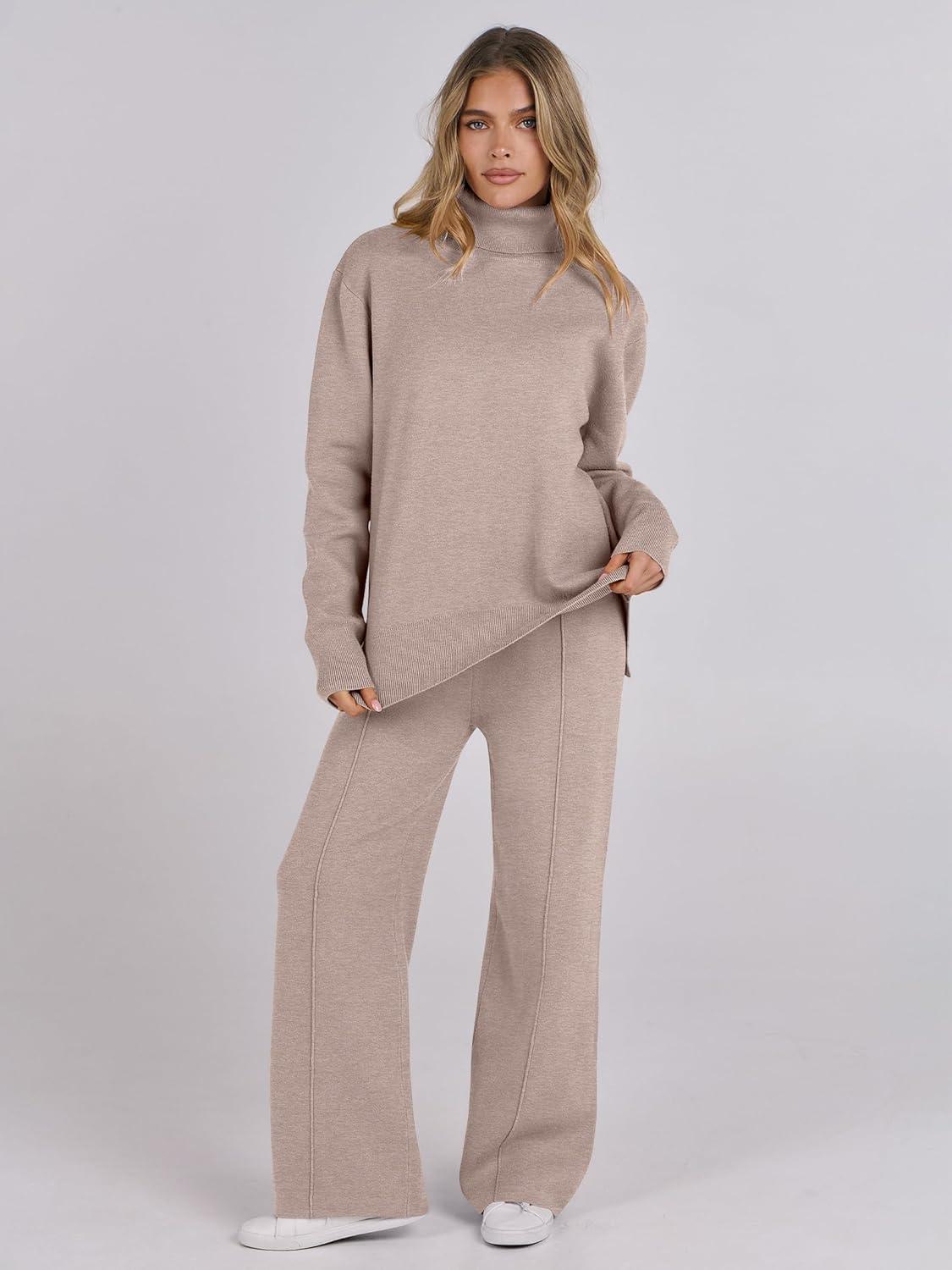 ANRABESS Womens 2 Piece Outfits Turtleneck Matching Lounge Set Sweater Top Wide Leg Pants Fall Cozy Knit Sweatsuit Loungewear(Camel)