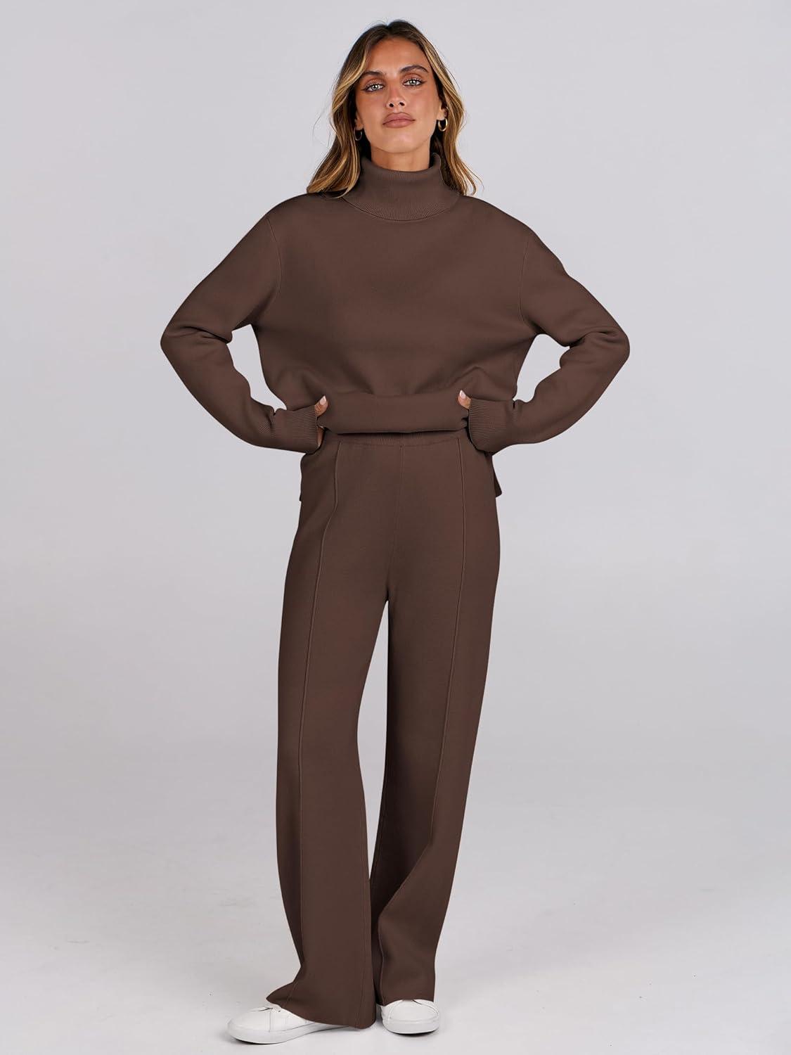 ANRABESS Womens 2 Piece Outfits Turtleneck Matching Lounge Set Sweater Top Wide Leg Pants Fall Cozy Knit Sweatsuit Loungewear(Coffee)