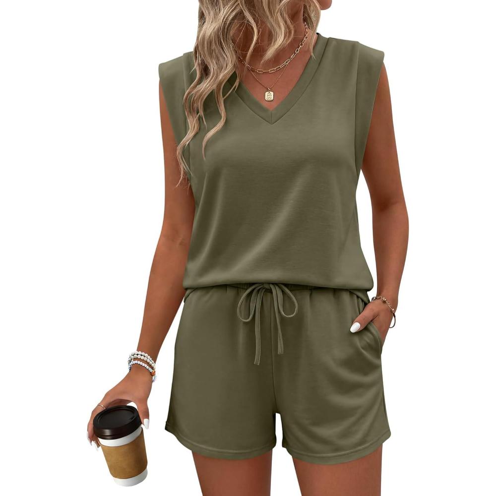 imageANRABESS Womens 2 Piece Shorts Sets 2026 Summer Casual Cap Sleeve Top Matching Lounge Outfits Travel Beach Vacation ClothesArmy Green