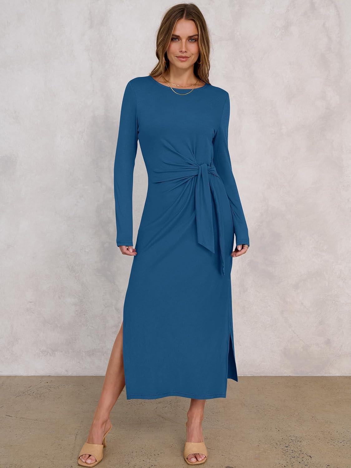 imageANRABESS Womens 2025 Fall Long Sleeve Maxi Dress Crewneck Tie Waist Slit Casual Work Long T Shirt Dresses Trendy OutfitsCyan