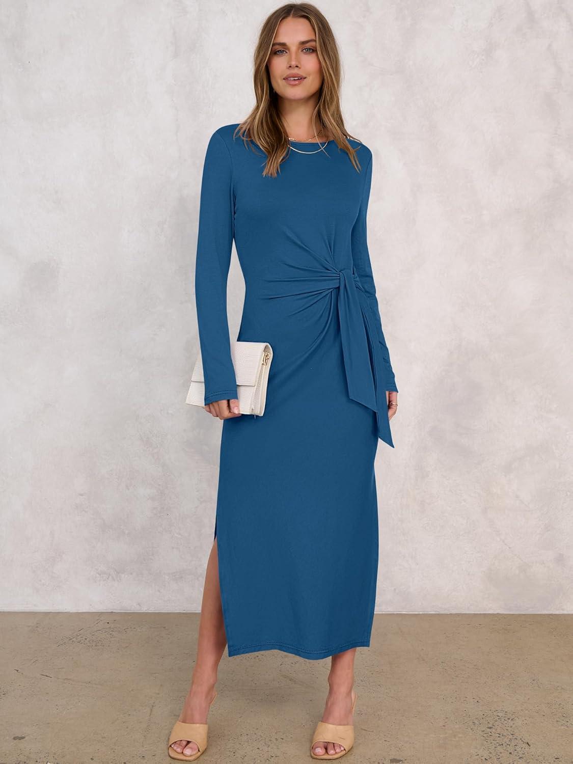 ANRABESS Womens 2025 Fall Long Sleeve Maxi Dress Crewneck Tie Waist Slit Casual Work Long T Shirt Dresses Trendy Outfits(Cyan)