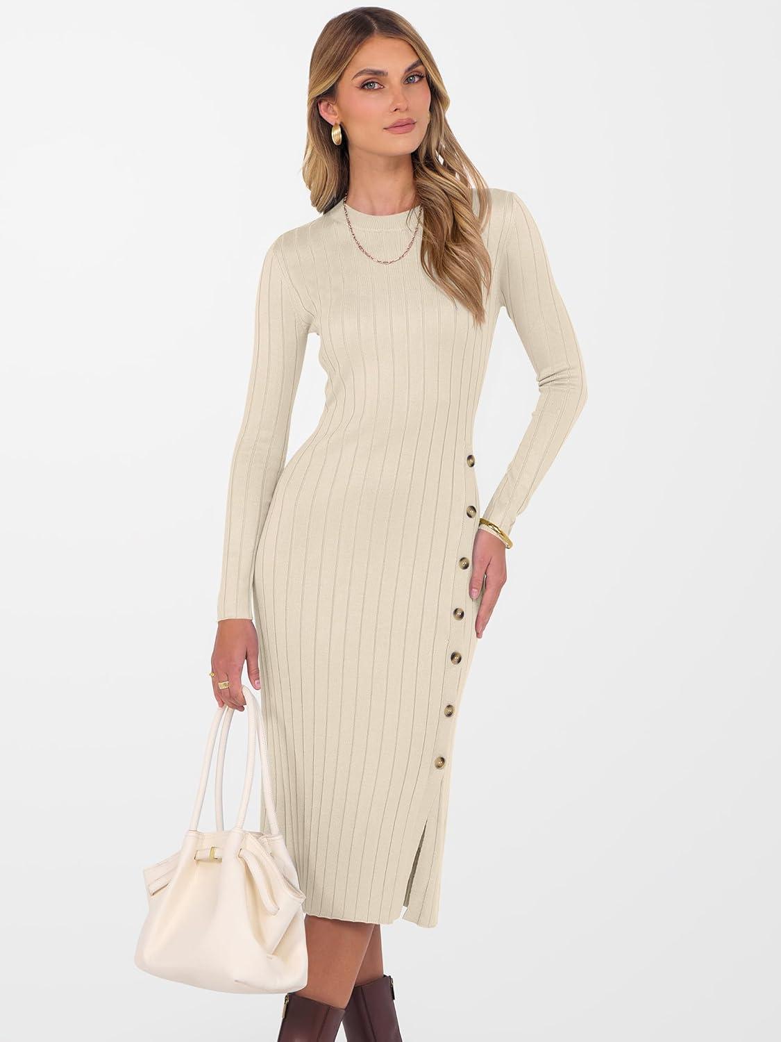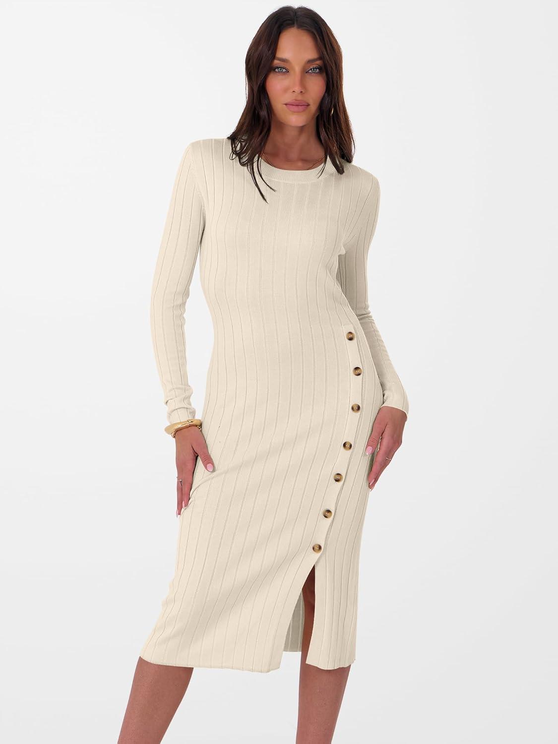 ANRABESS Womens 2025 Fall Long Sleeve Midi Dress Ribbed Knit Bodycon Fitted Button Down Wedding Guest Slit Sweater Dresses(Beige)