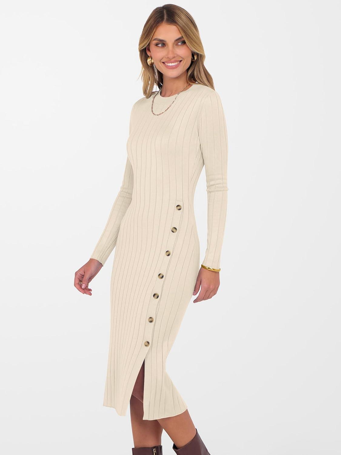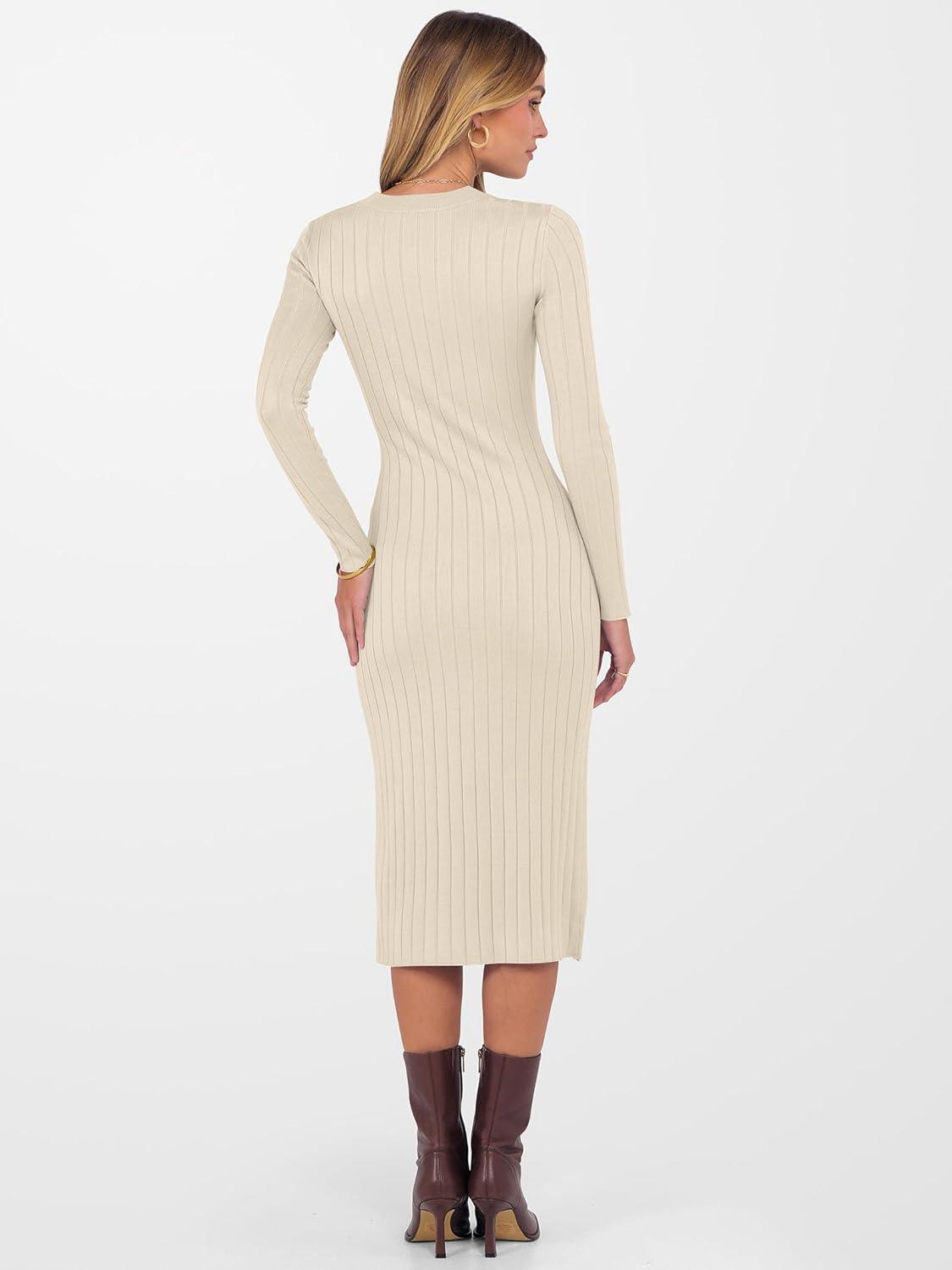imageANRABESS Womens 2025 Fall Long Sleeve Midi Dress Ribbed Knit Bodycon Fitted Button Down Wedding Guest Slit Sweater DressesWhite