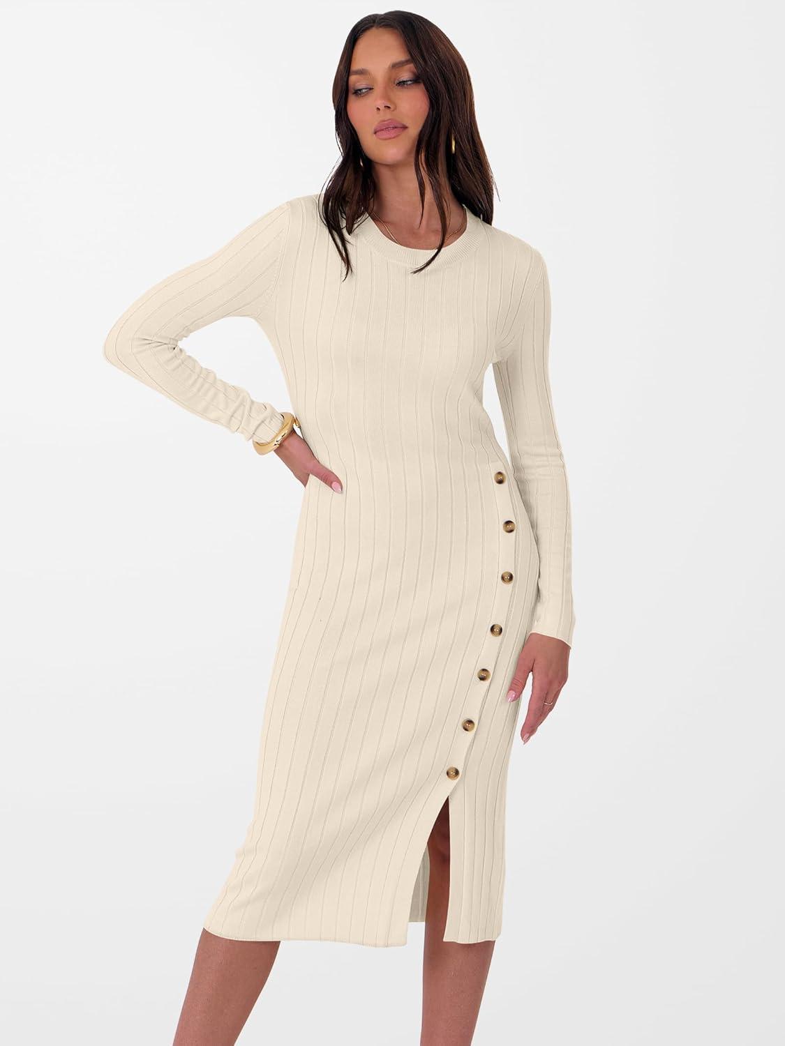 ANRABESS Womens 2025 Fall Long Sleeve Midi Dress Ribbed Knit Bodycon Fitted Button Down Wedding Guest Slit Sweater Dresses(White)