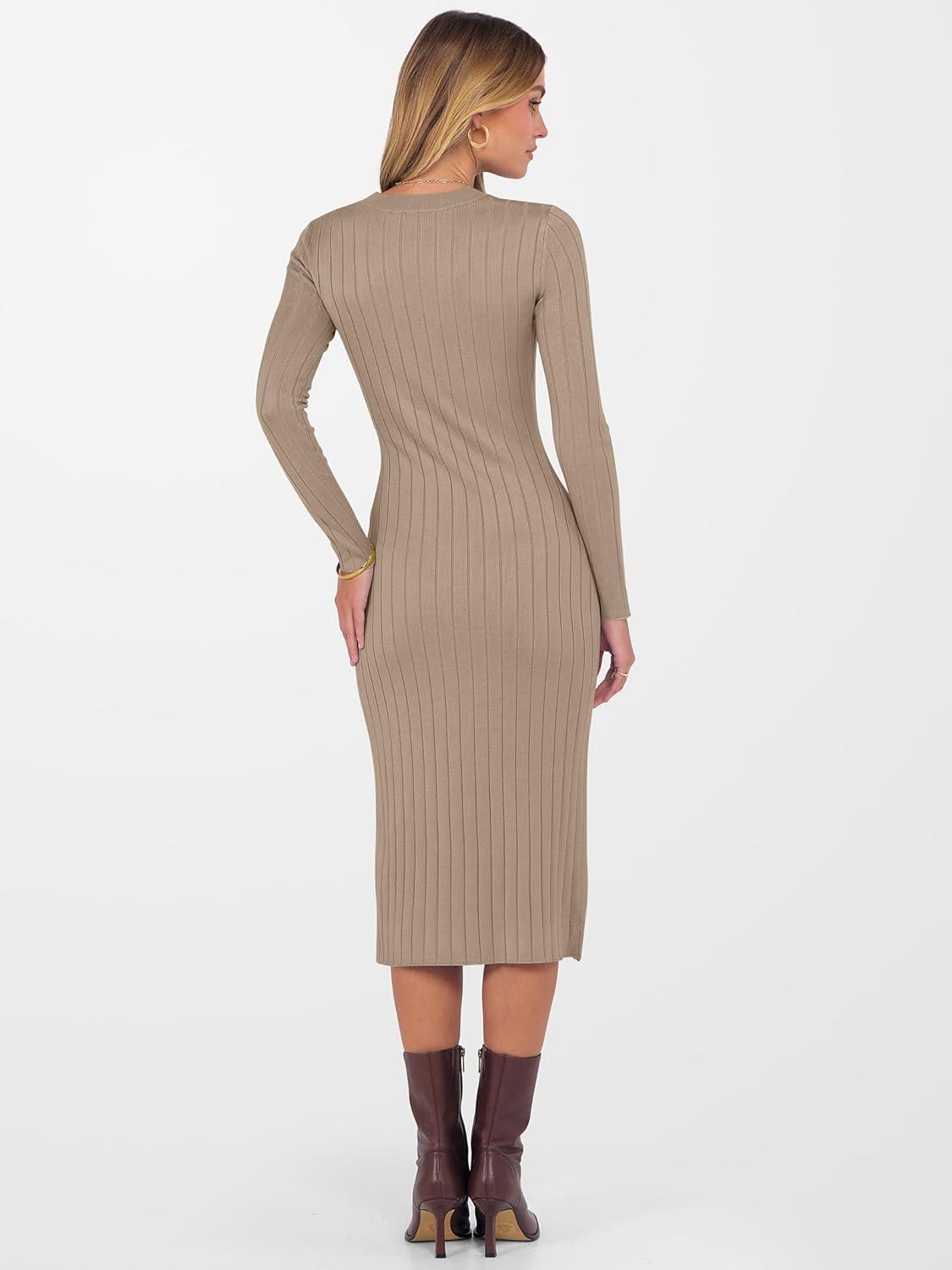 imageANRABESS Womens 2025 Fall Long Sleeve Midi Dress Ribbed Knit Bodycon Fitted Button Down Wedding Guest Slit Sweater DressesTan