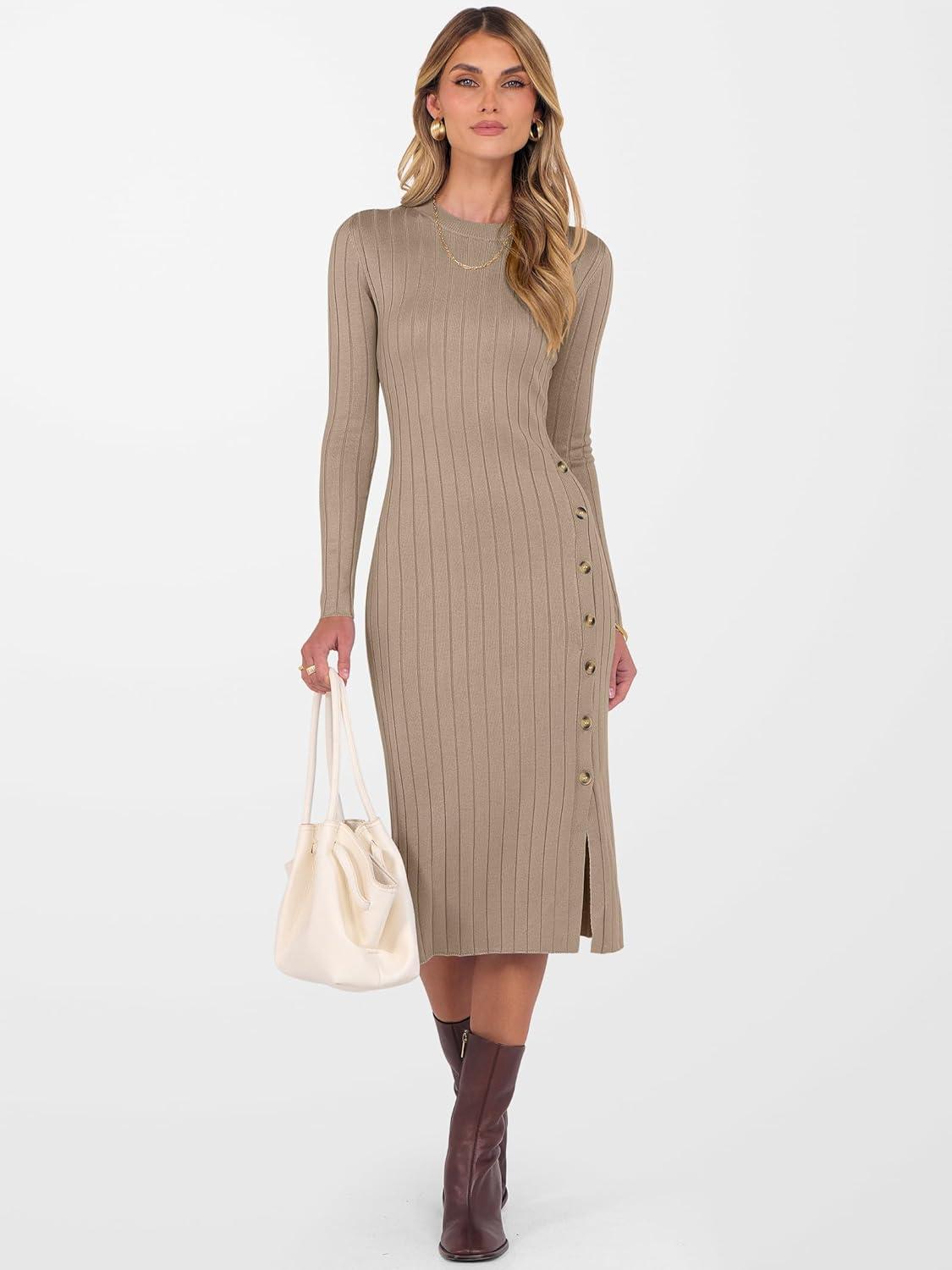 ANRABESS Womens 2025 Fall Long Sleeve Midi Dress Ribbed Knit Bodycon Fitted Button Down Wedding Guest Slit Sweater Dresses(Tan)