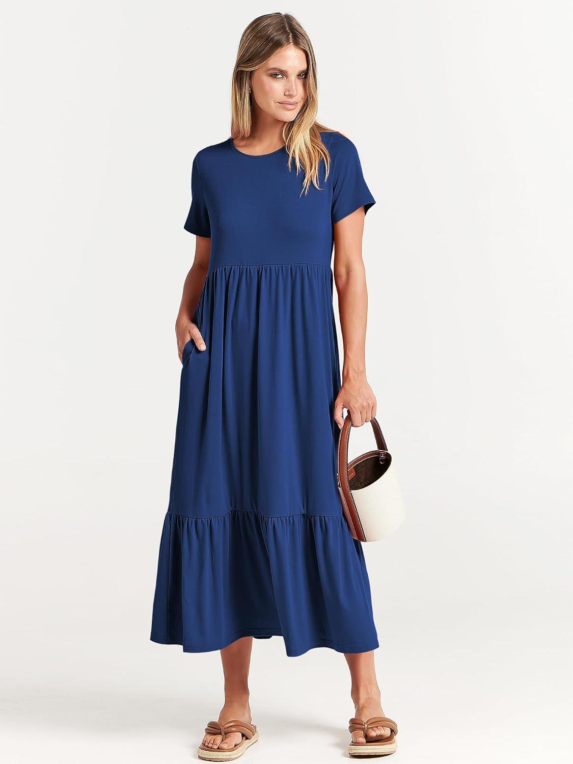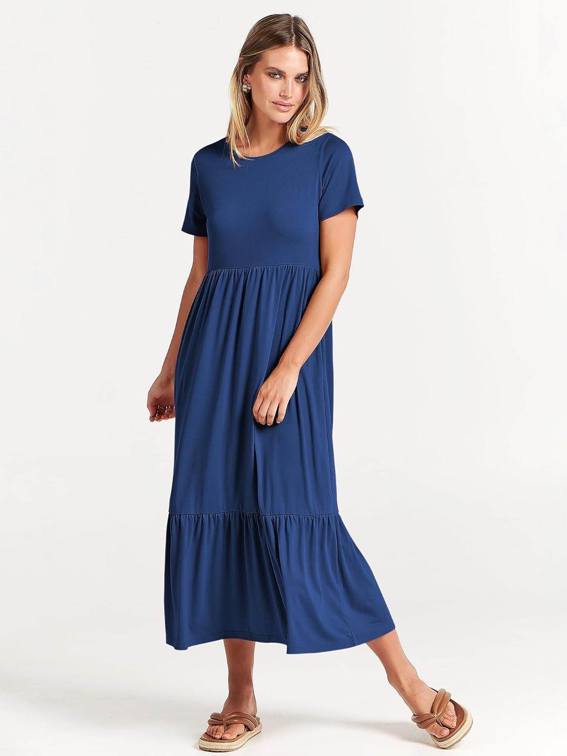 ANRABESS Womens 2025 Summer Casual Maxi Dress A line Tiered Flowy Short Sleeve Crewneck T Shirt Beach Travel Long Dresses(Blue)