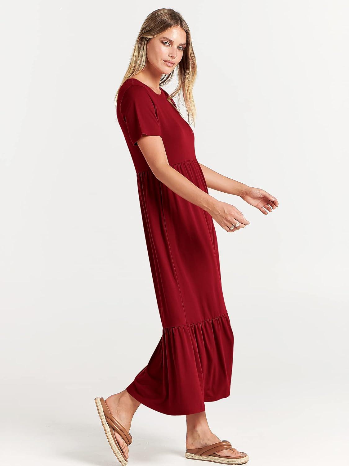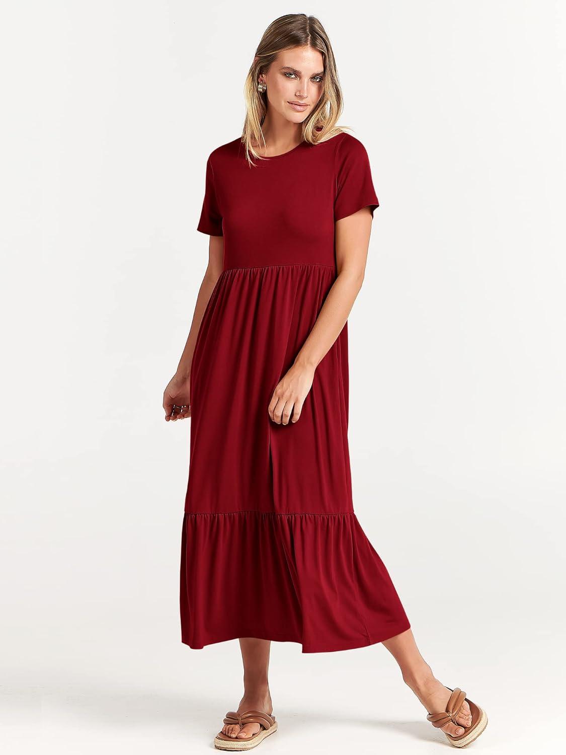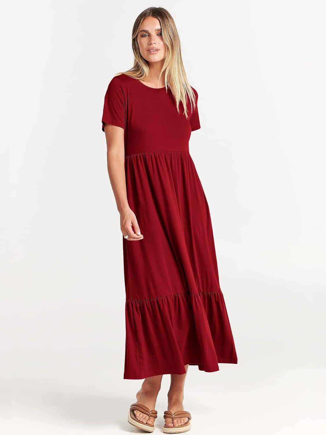 ANRABESS Womens 2025 Summer Casual Maxi Dress A line Tiered Flowy Short Sleeve Crewneck T Shirt Beach Travel Long Dresses(Wine Red)