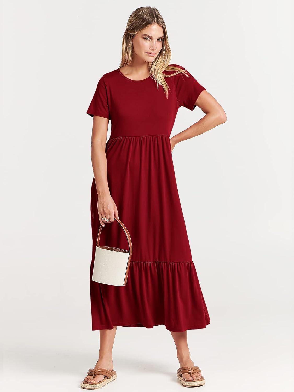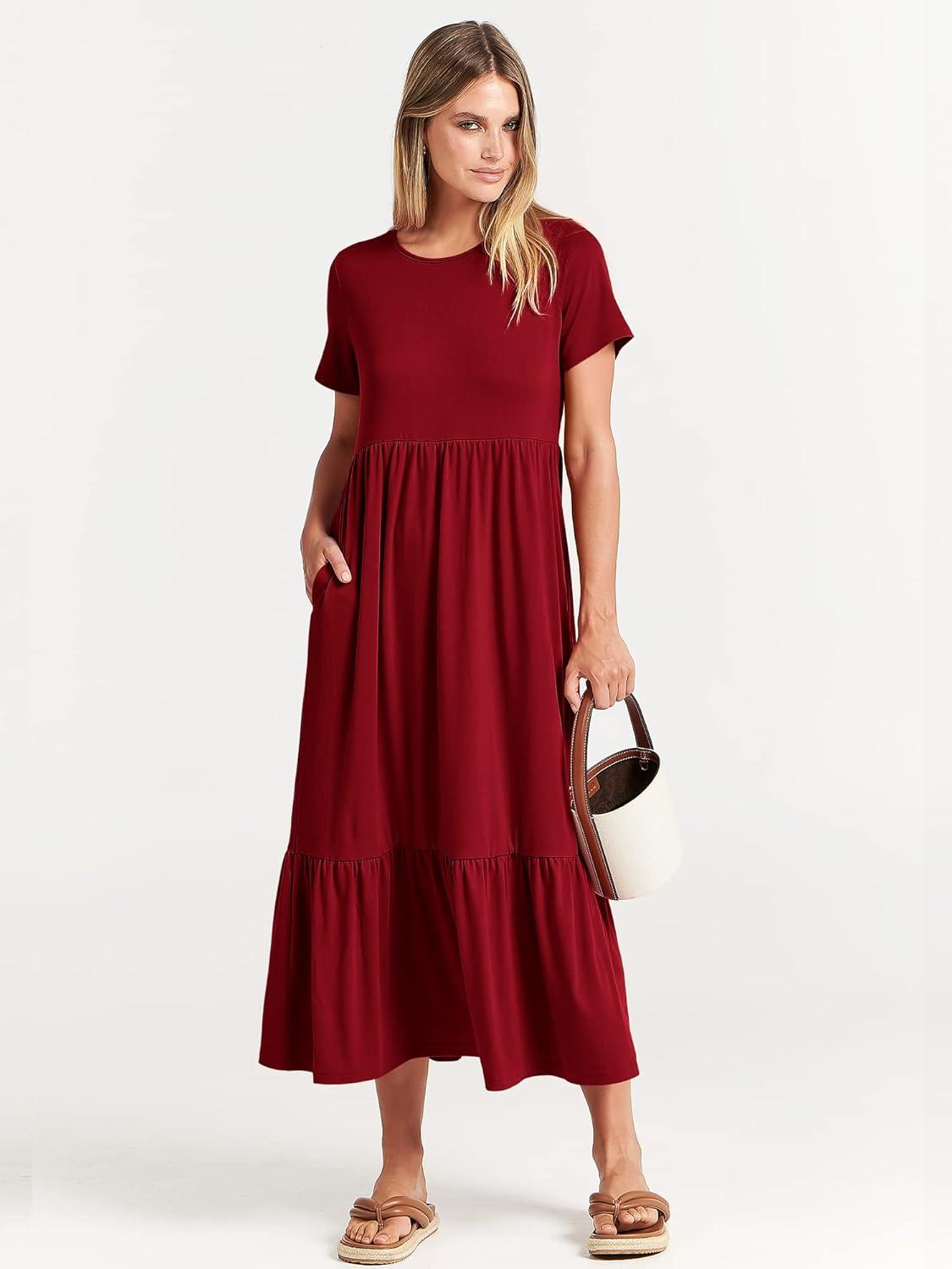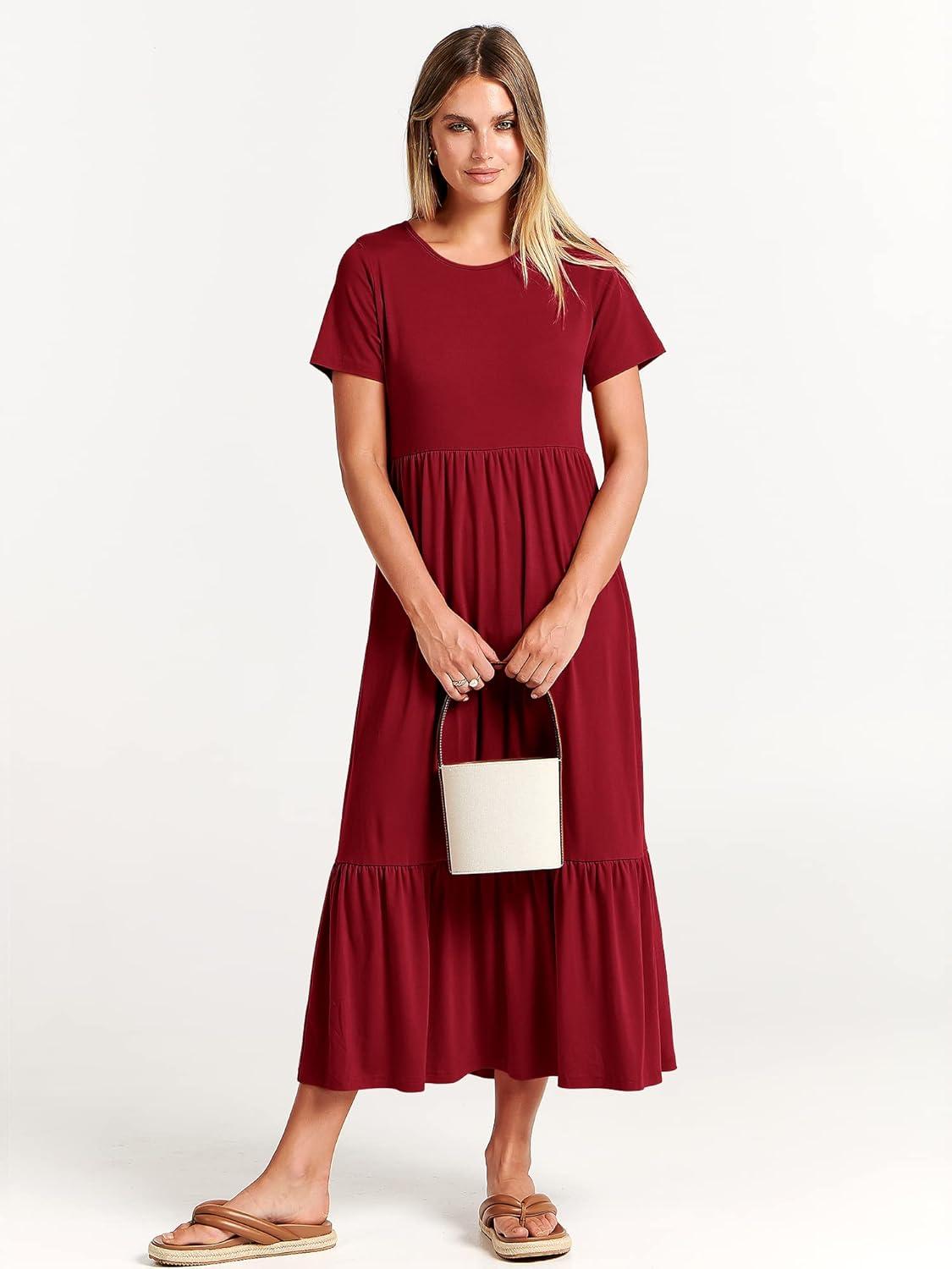ANRABESS Womens 2025 Summer Casual Maxi Dress A line Tiered Flowy Short Sleeve Crewneck T Shirt Beach Travel Long Dresses(Wine Red)