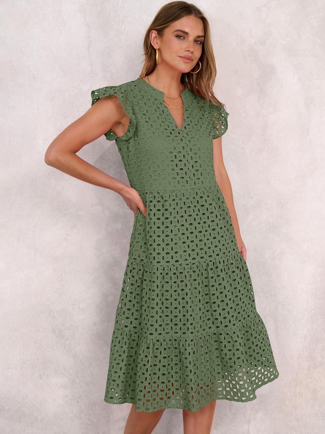 ANRABESS Womens 2025 Summer Midi Dress Hollow Out Eyelet Ruffle Sleeve V Neck Casual Flowy Tiered Beach Vacation Sundress(Army Green)