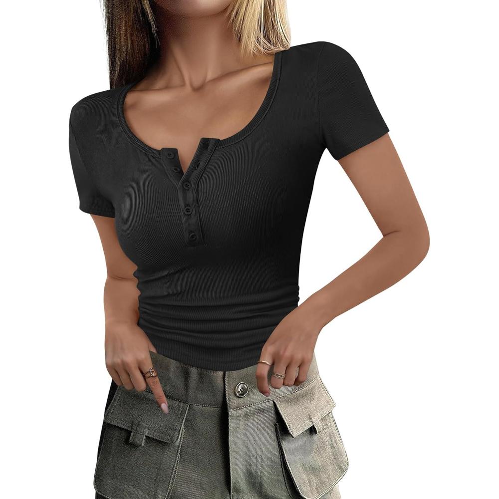 ANRABESS Womens 2025 Summer Short Sleeve Tops Ribbed Knit Henley Button Up Slim Fit Basic Casual T Shirts Blouse Fall Outfits(Black)