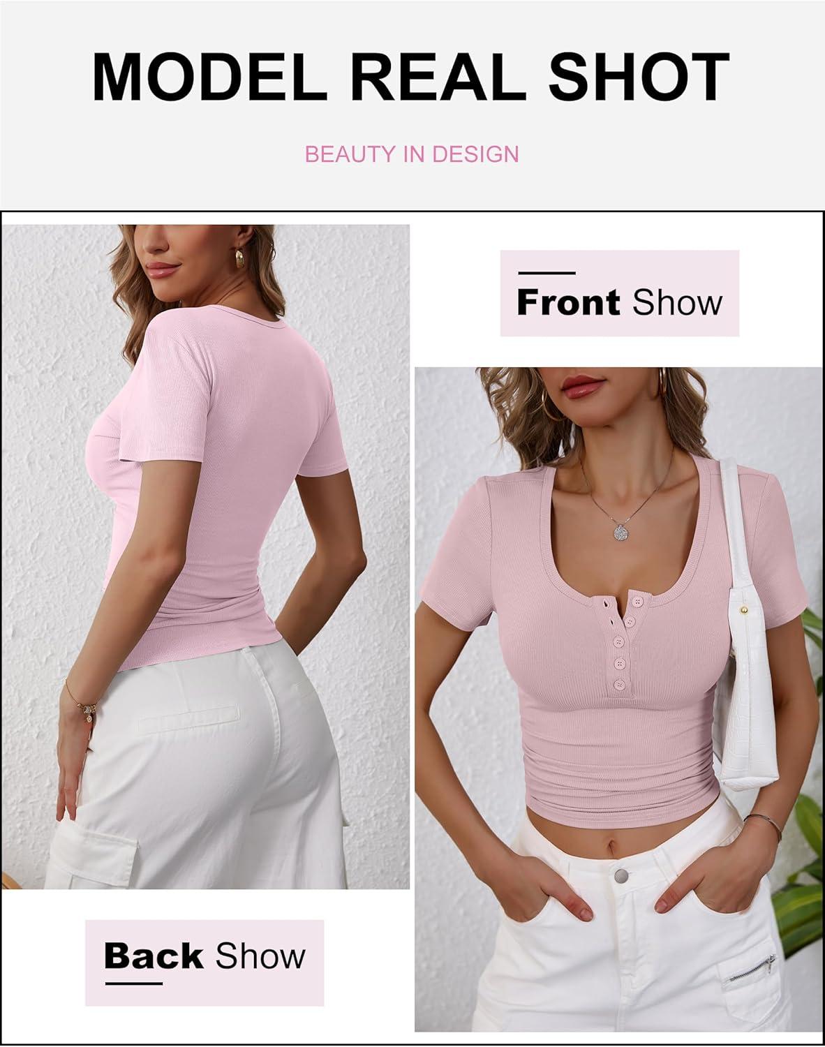 ANRABESS Womens 2025 Summer Short Sleeve Tops Ribbed Knit Henley Button Up Slim Fit Basic Casual T Shirts Blouse Fall Outfits(Pink)