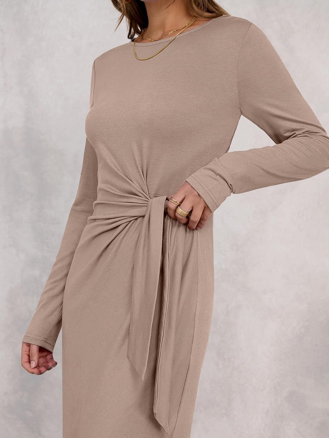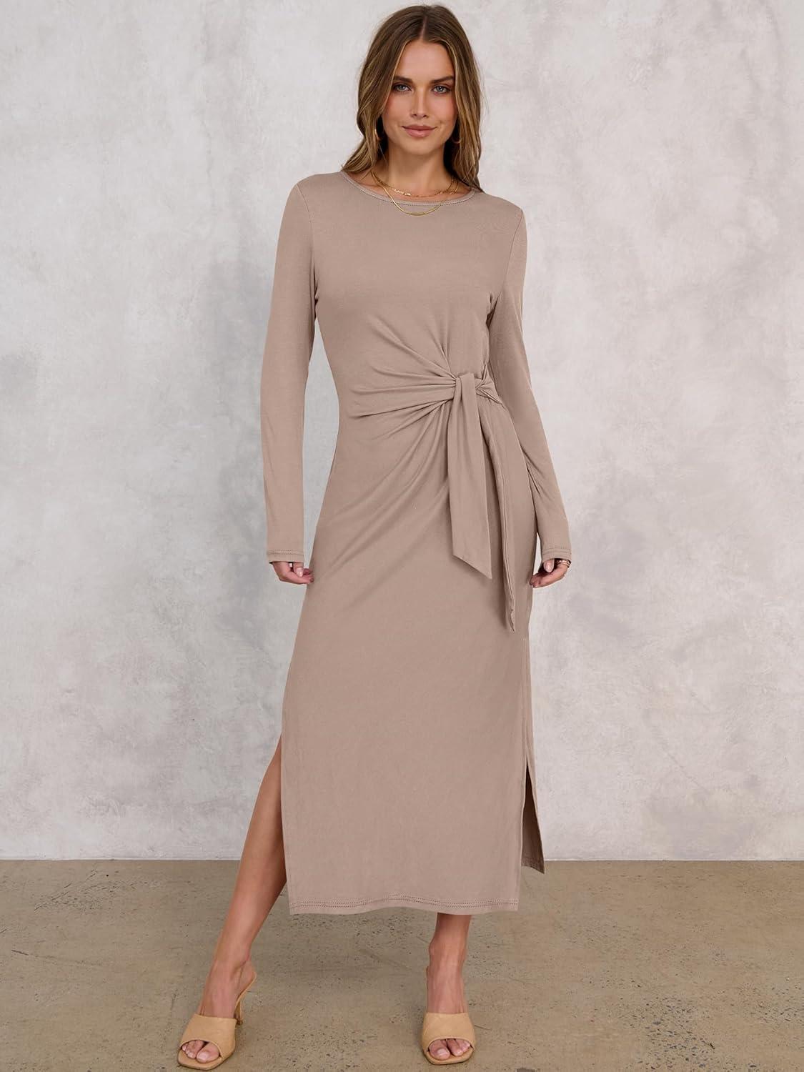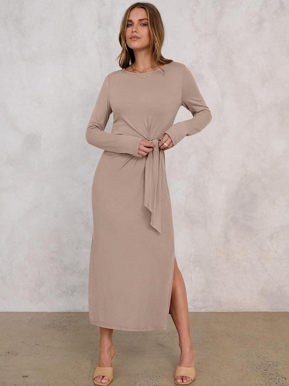 ANRABESS Womens 2026 Spring Long Sleeve Maxi Dress Crewneck Tie Waist Slit Casual Long T Shirt Dresses Winter Trendy Outfits(Khaki)