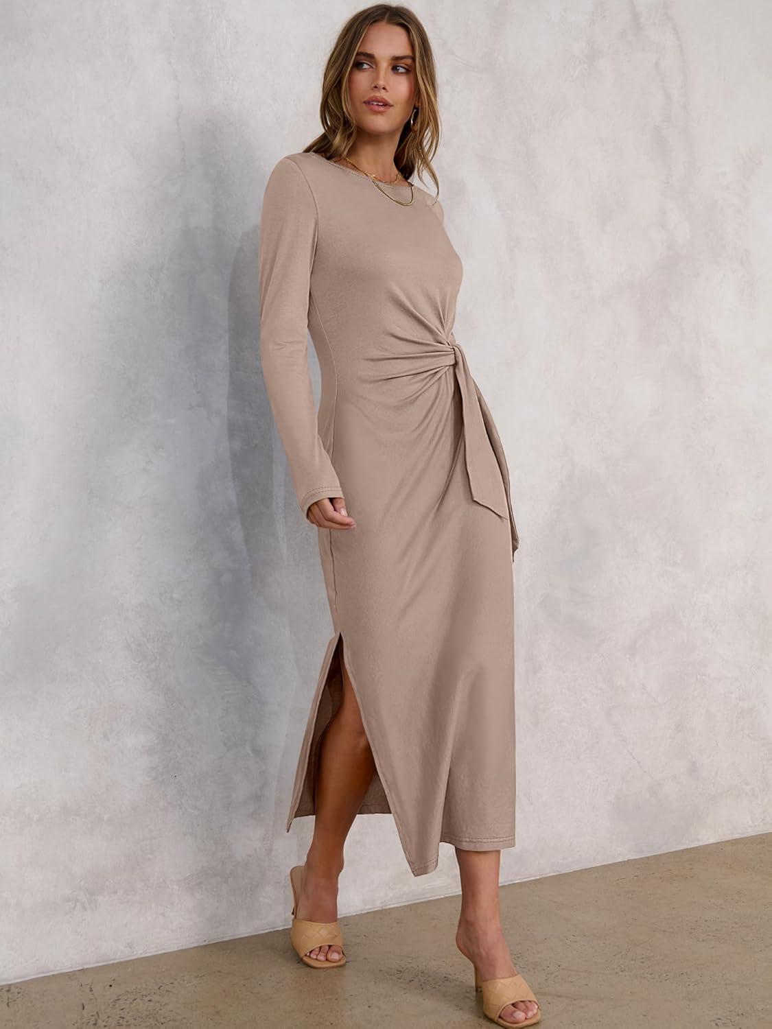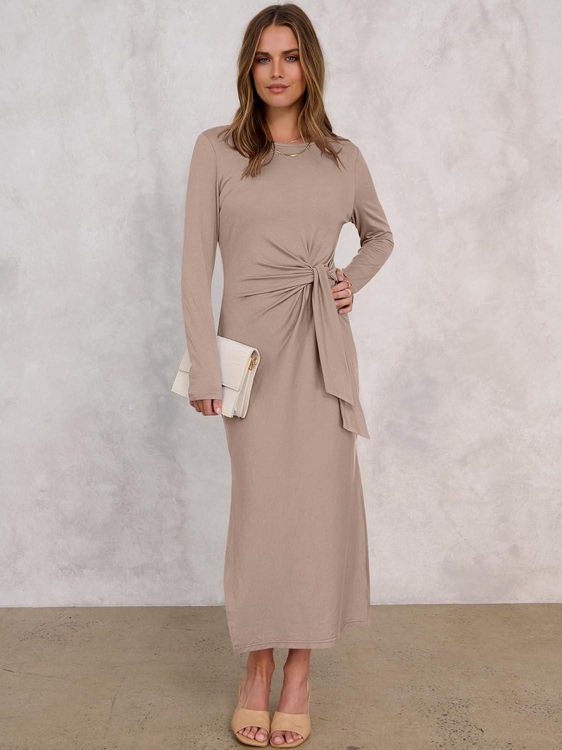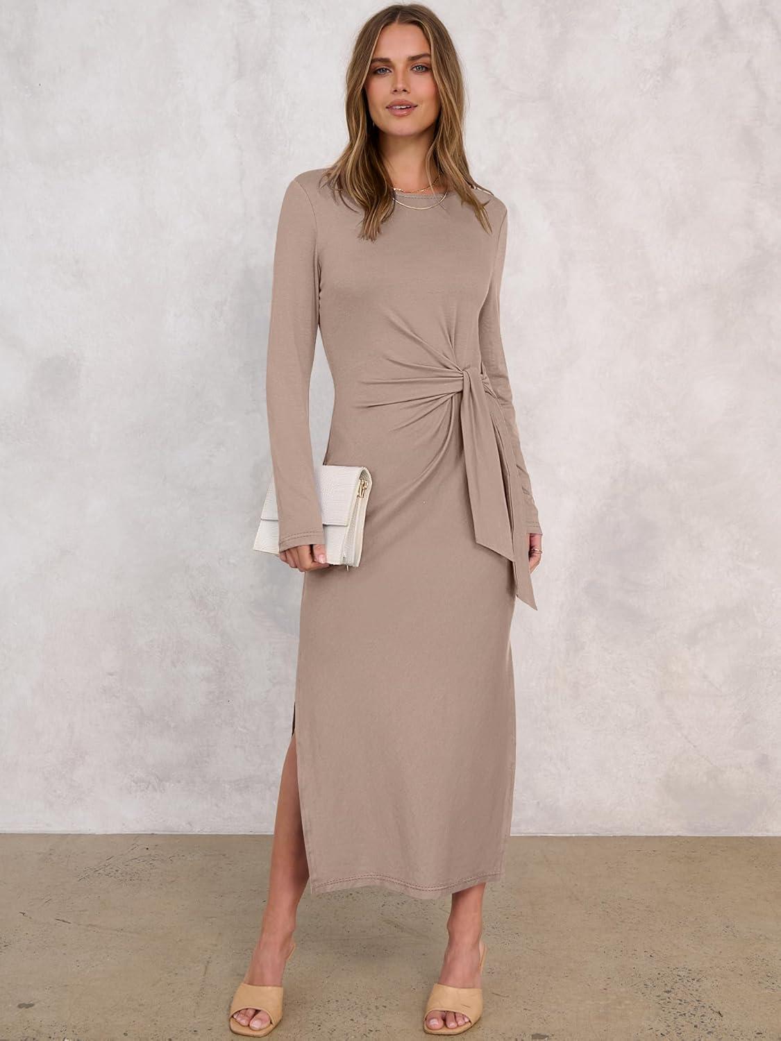 ANRABESS Womens 2026 Spring Long Sleeve Maxi Dress Crewneck Tie Waist Slit Casual Long T Shirt Dresses Winter Trendy Outfits(Khaki)