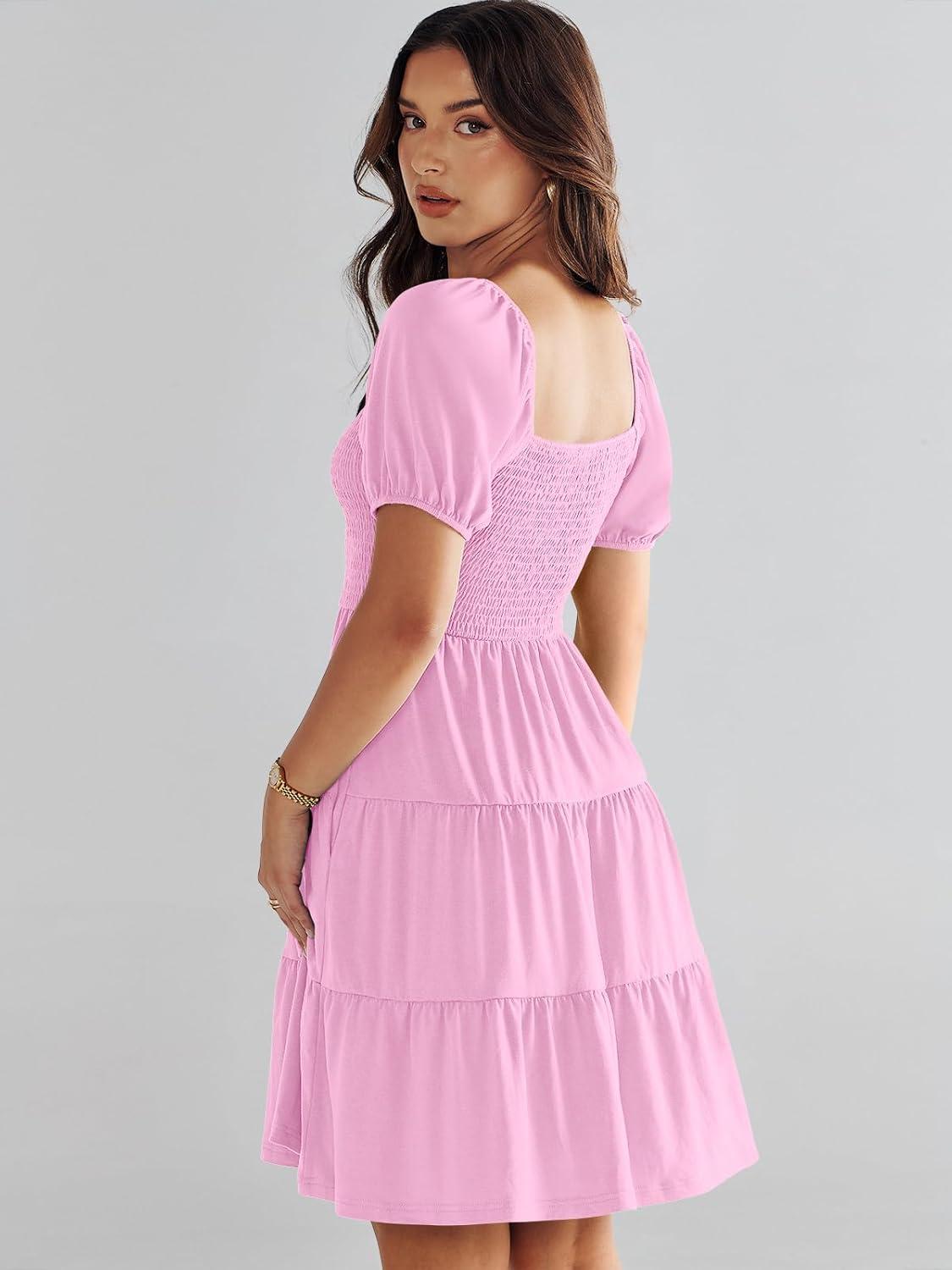 ANRABESS Womens 2026 Summer Casual Dress Square Neck Puff Sleeve Boho Beach Vacation Short Dress(Pink)