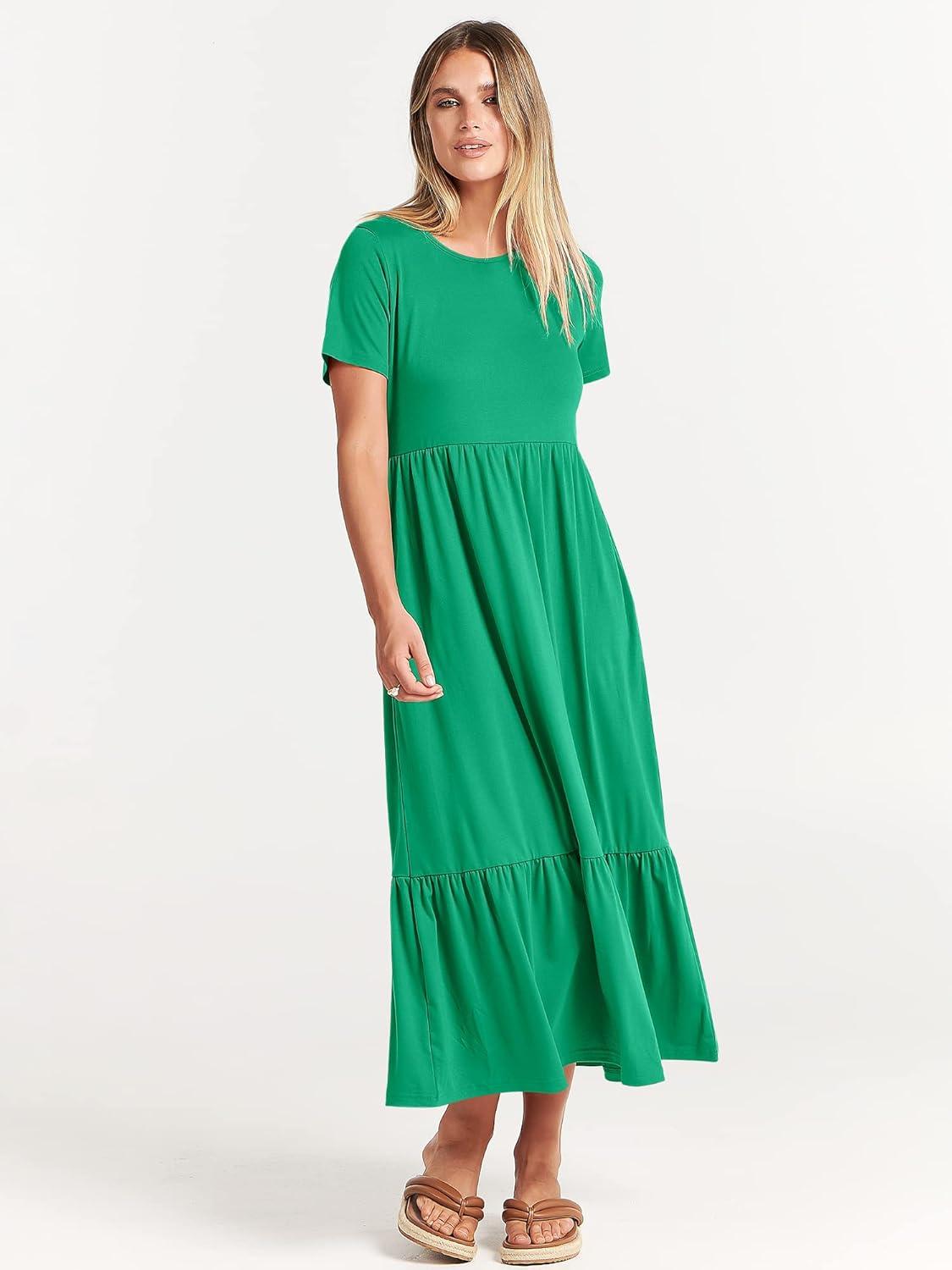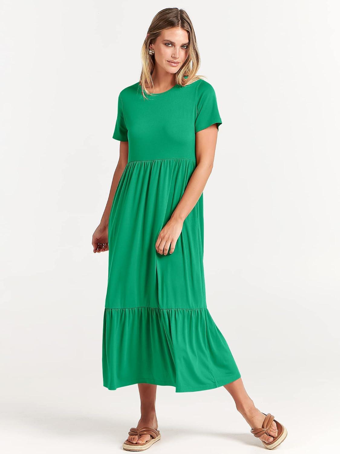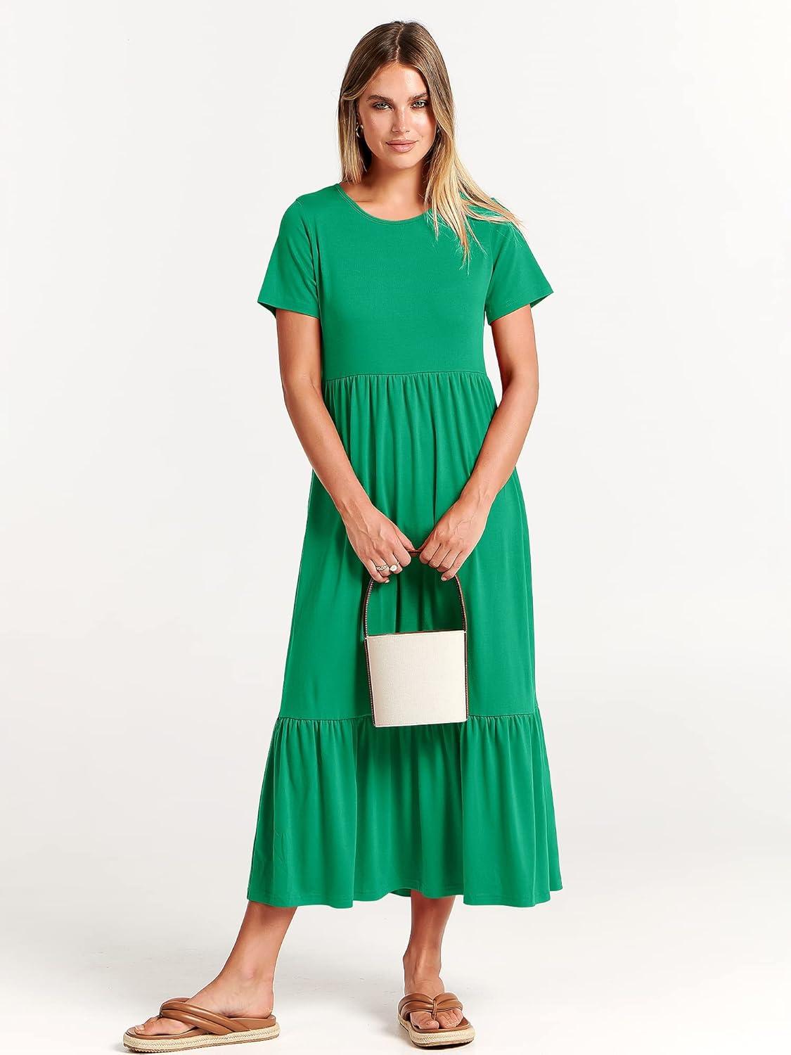 ANRABESS Womens 2026 Summer Casual Maxi Dress A line Tiered Flowy Short Sleeve Crewneck T Shirt Beach Travel Long Dresses(Deep Green)