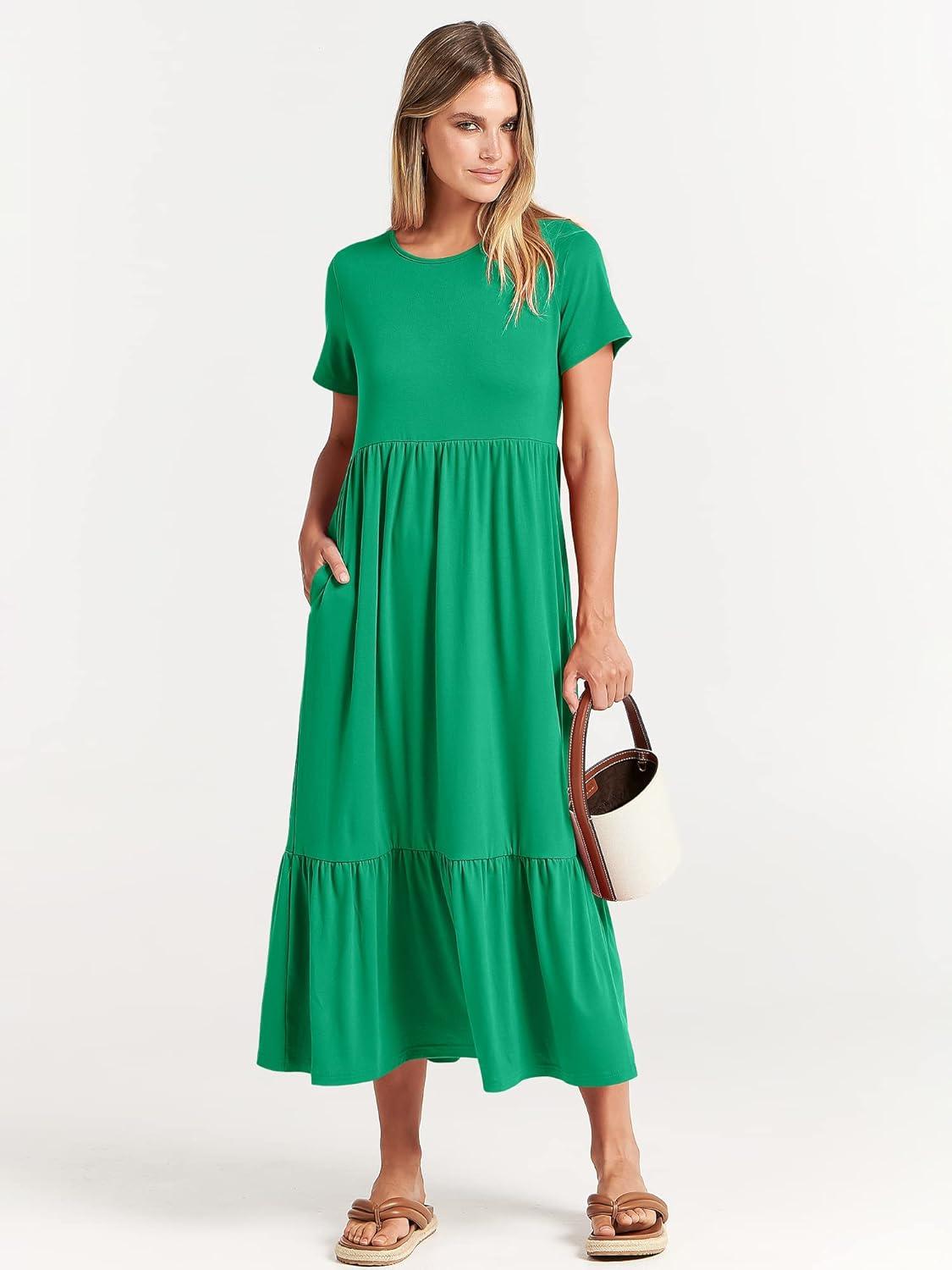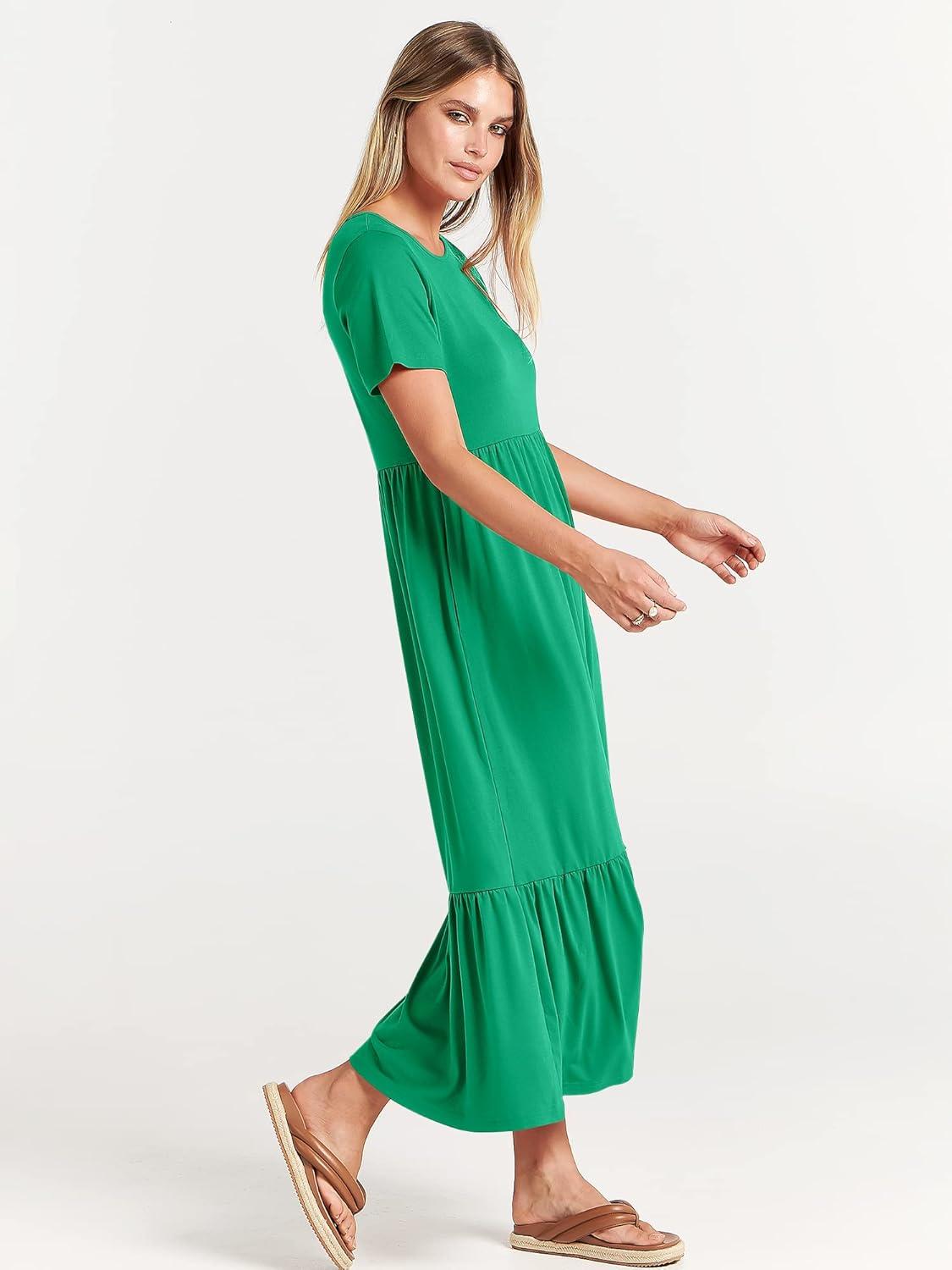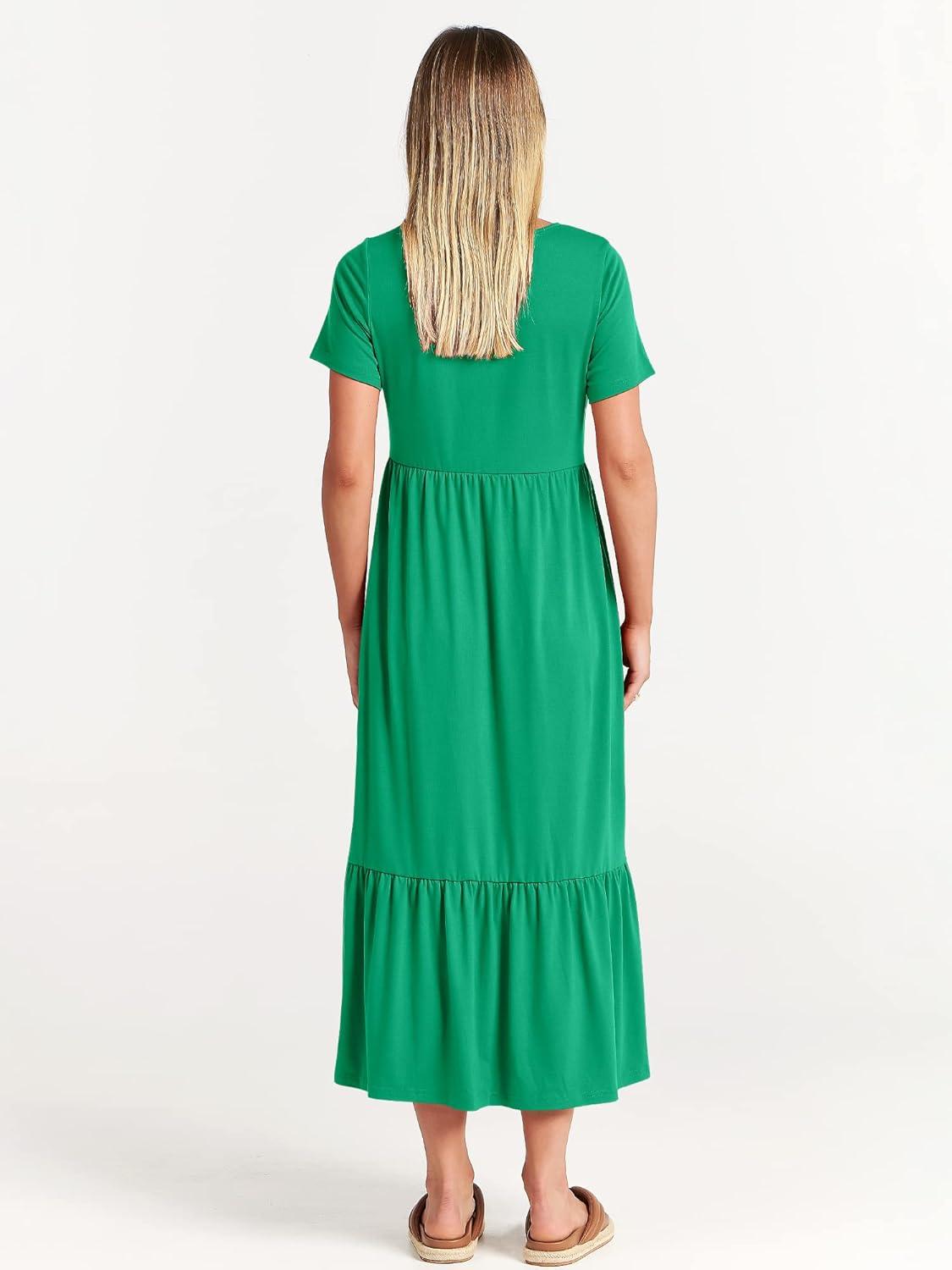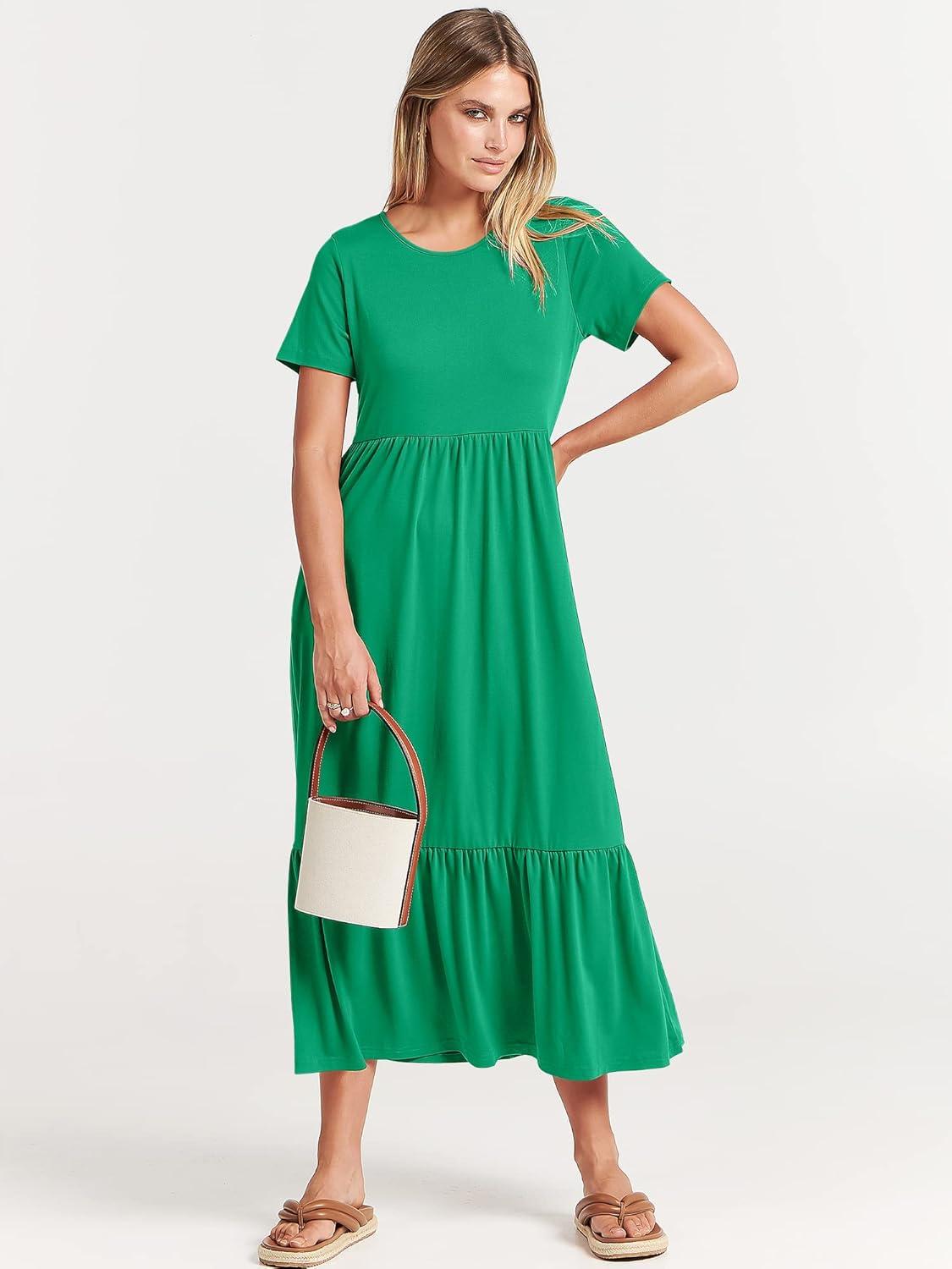 ANRABESS Womens 2026 Summer Casual Maxi Dress A line Tiered Flowy Short Sleeve Crewneck T Shirt Beach Travel Long Dresses(Deep Green)