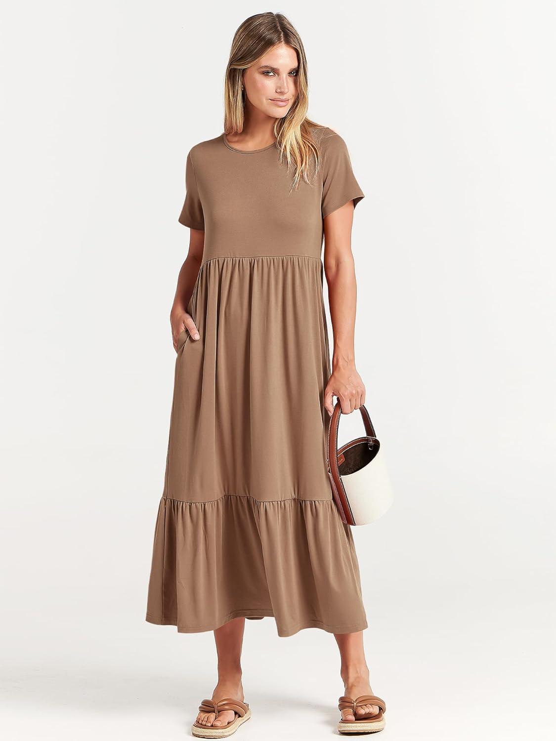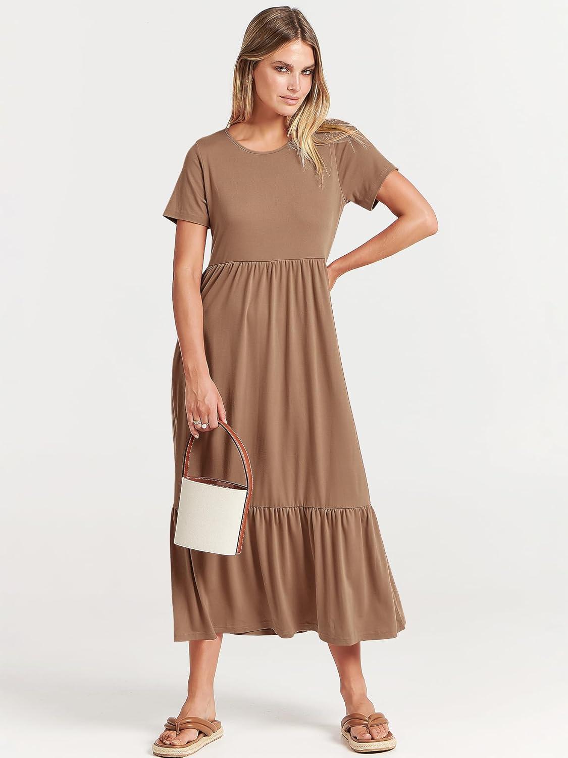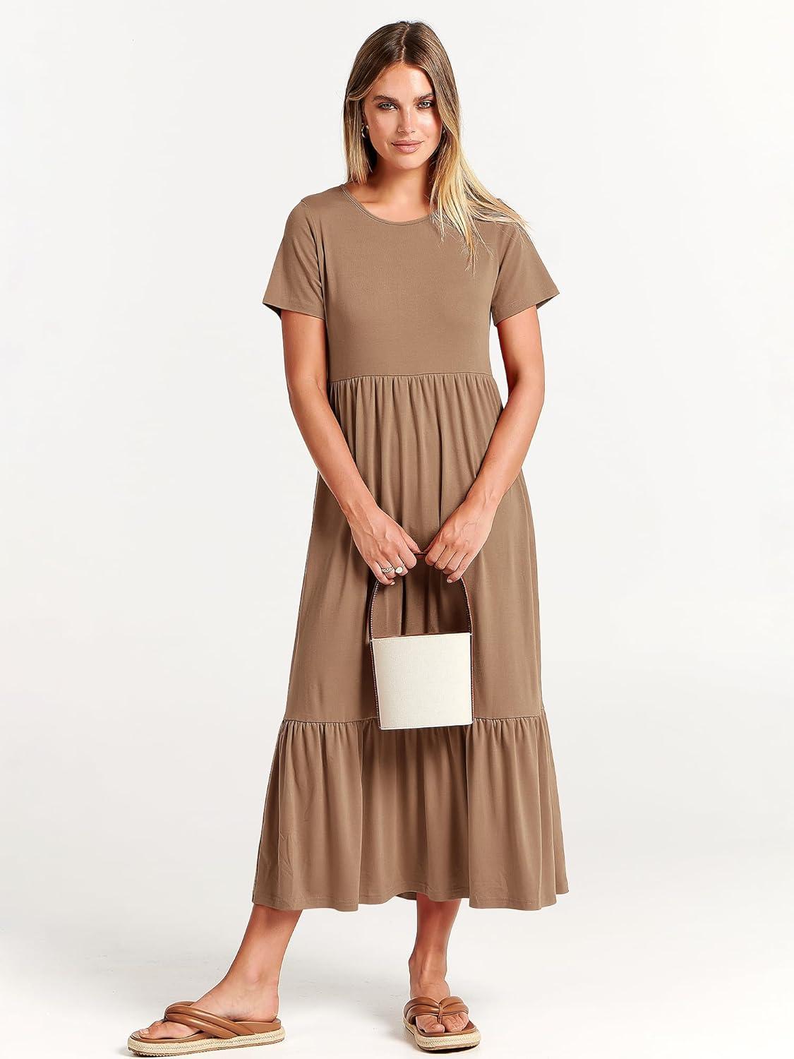 ANRABESS Womens 2026 Summer Casual Maxi Dress A line Tiered Flowy Short Sleeve Crewneck T Shirt Beach Travel Long Dresses(Khaki)