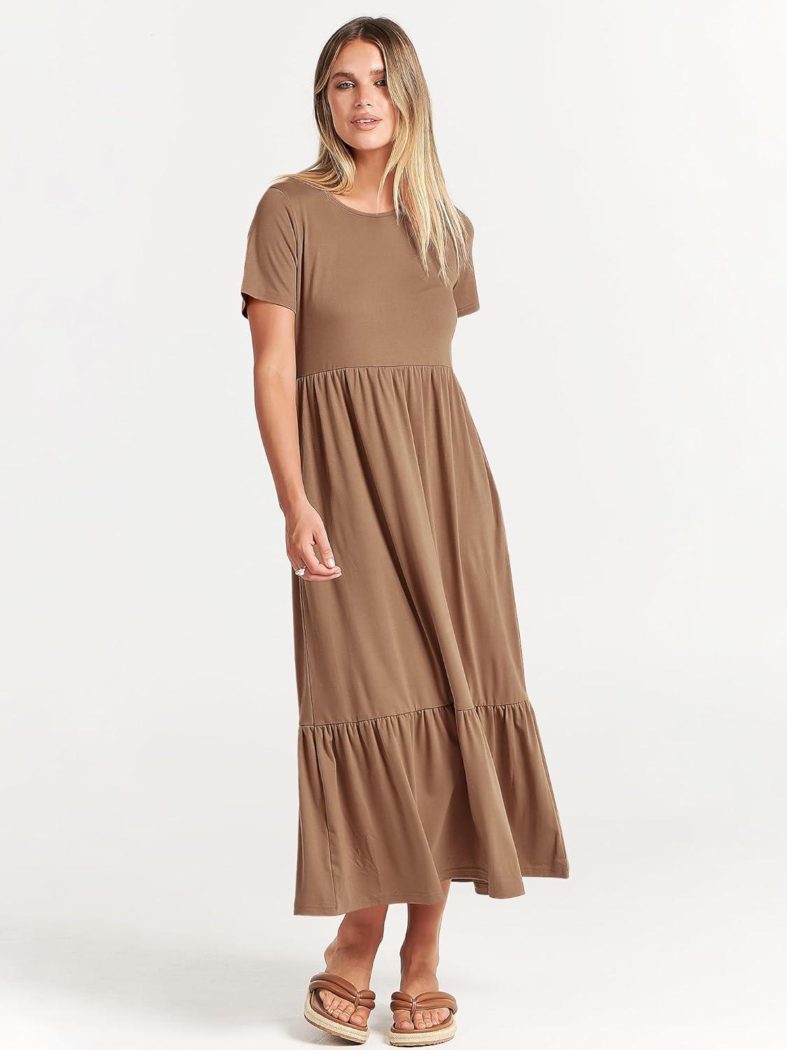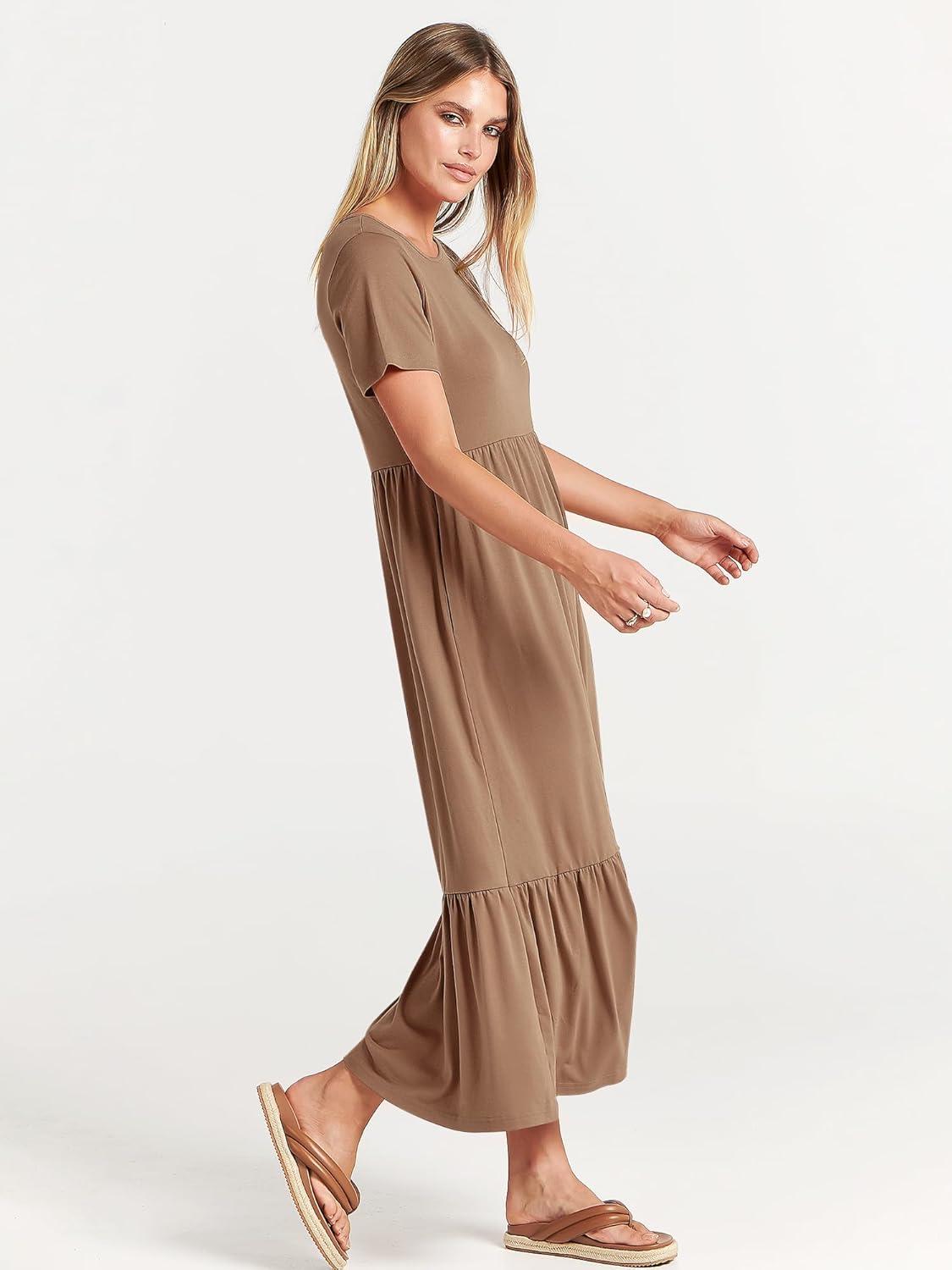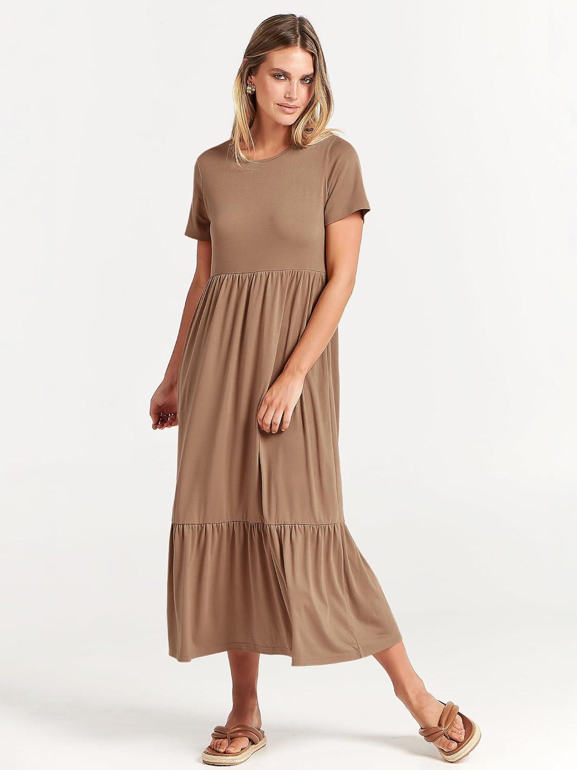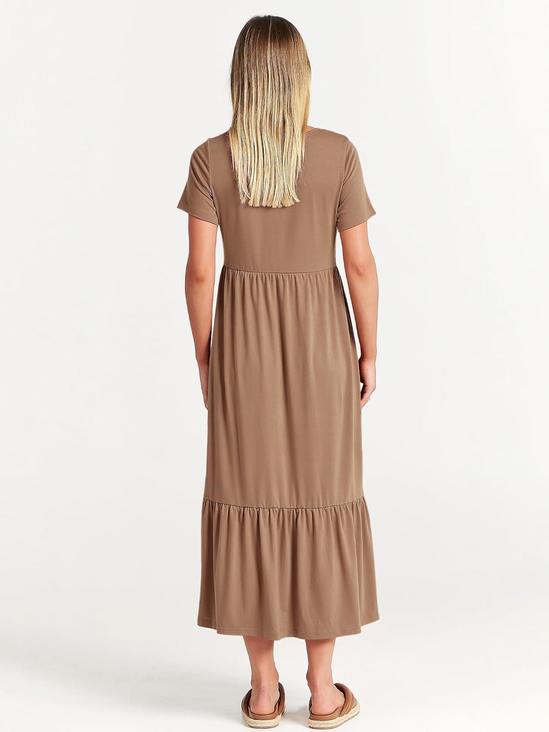 ANRABESS Womens 2026 Summer Casual Maxi Dress A line Tiered Flowy Short Sleeve Crewneck T Shirt Beach Travel Long Dresses(Khaki)