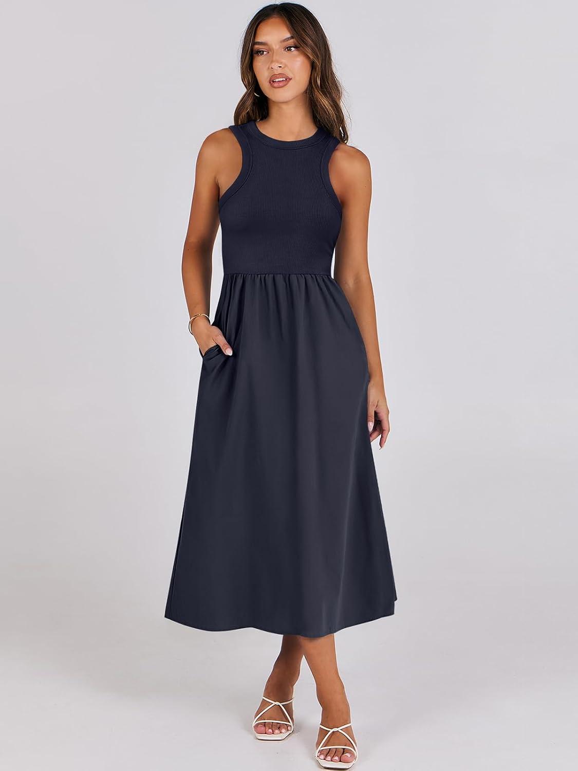 ANRABESS Womens 2026 Summer Casual Maxi Dress A line Tiered Flowy Short Sleeve Crewneck T Shirt Beach Travel Long Dresses(Navy Blue)