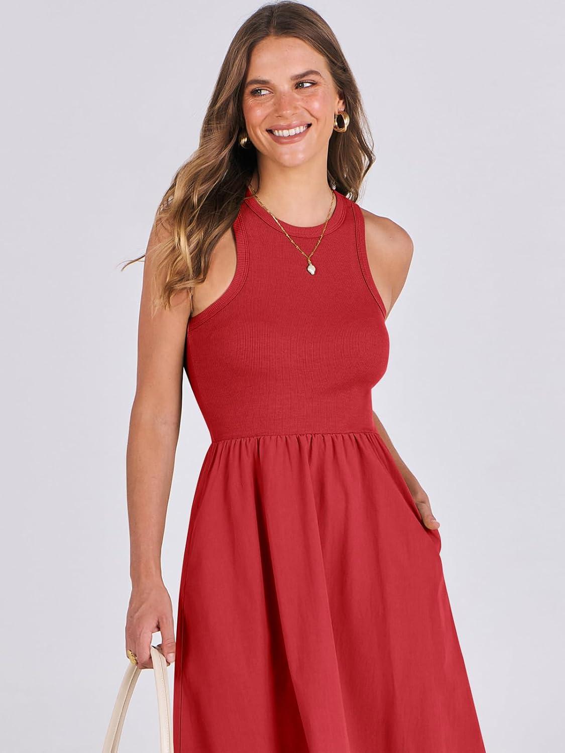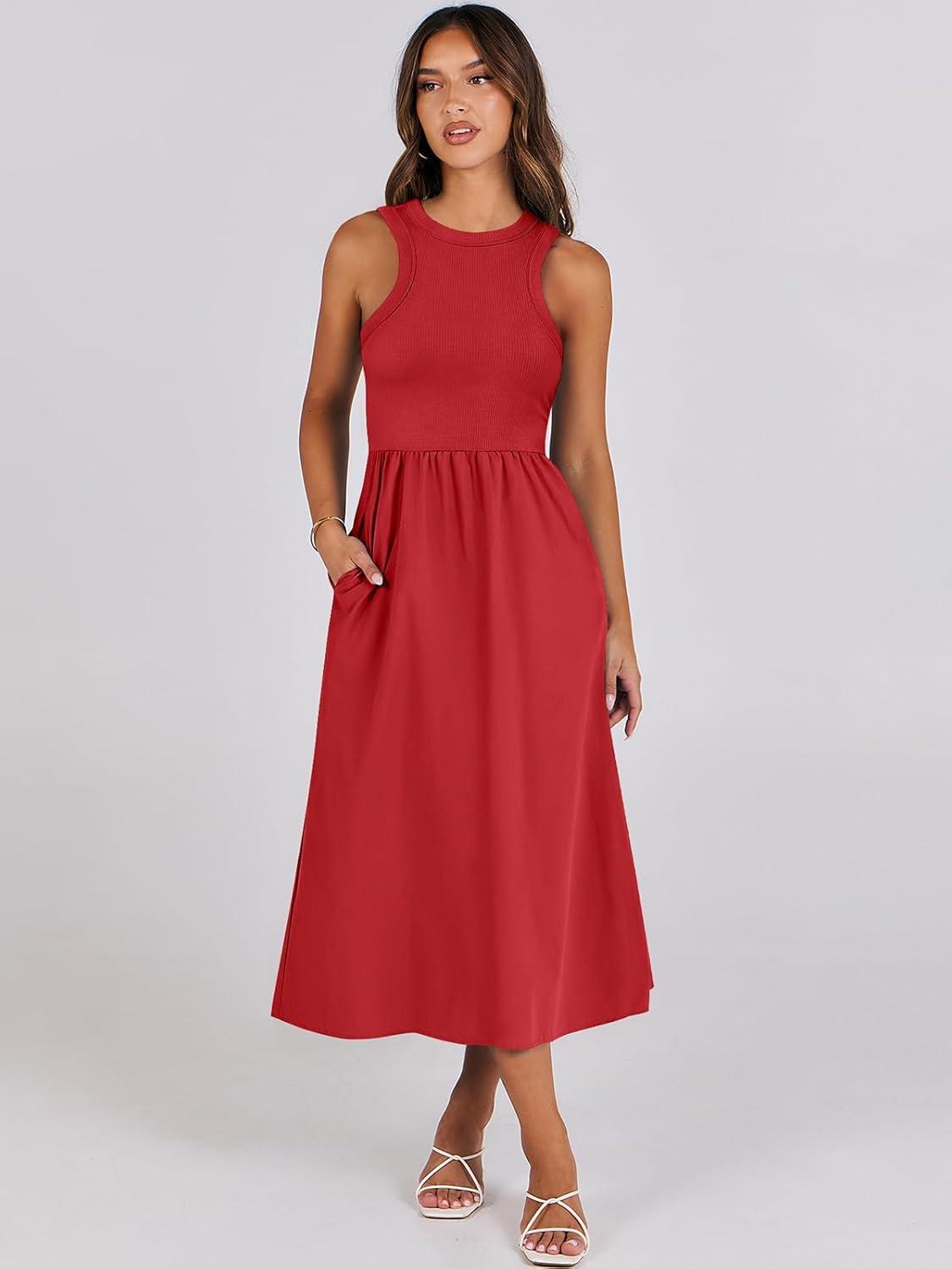 ANRABESS Womens 2026 Summer Casual Maxi Dress A line Tiered Flowy Short Sleeve Crewneck T Shirt Beach Travel Long Dresses(Red)
