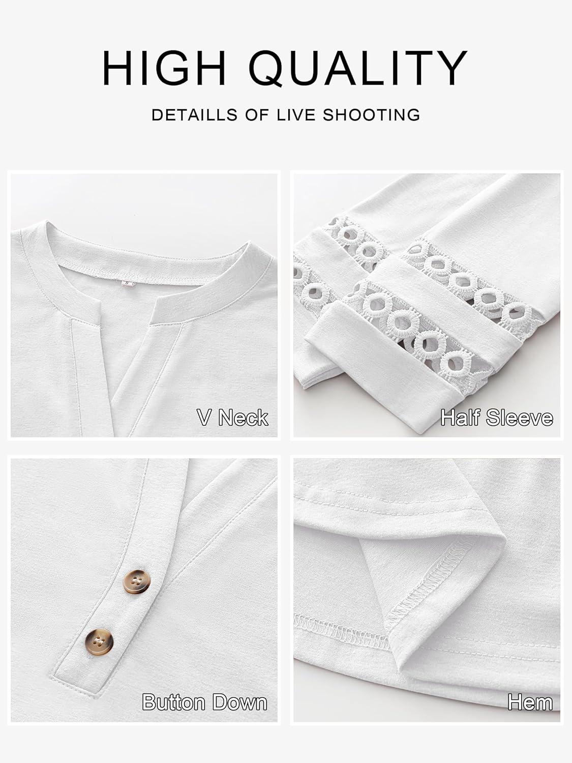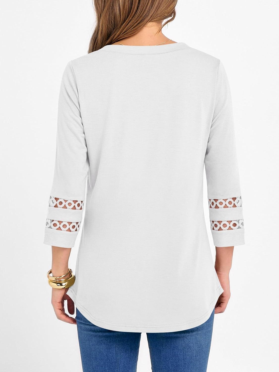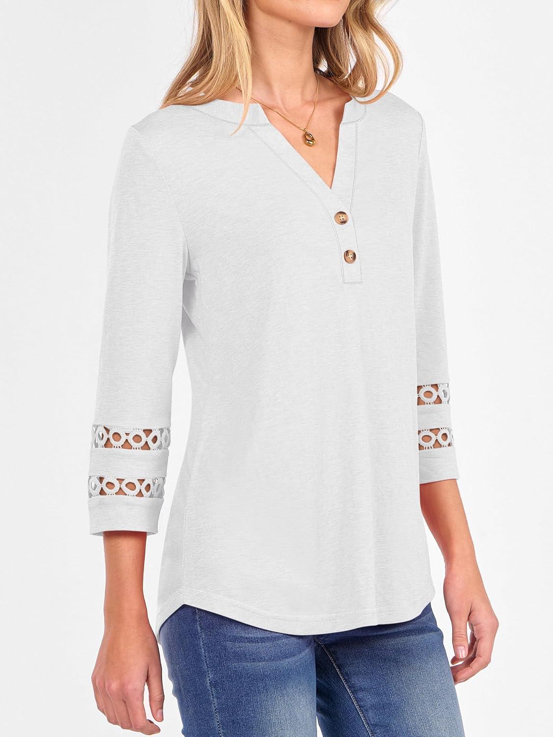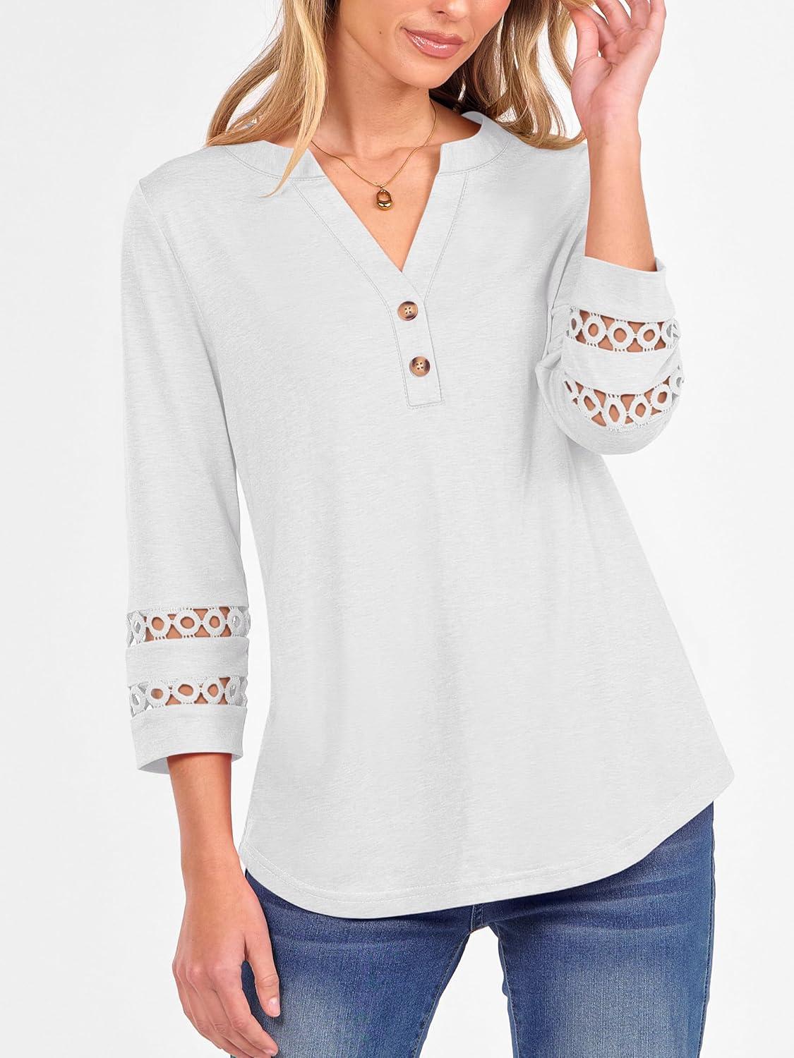 ANRABESS Womens 3/4 Length Lace Sleeve Tops Henley V Neck Shirts Dressy Casual Business Blouses 2026 Spring T-Shirts Outfits(White)