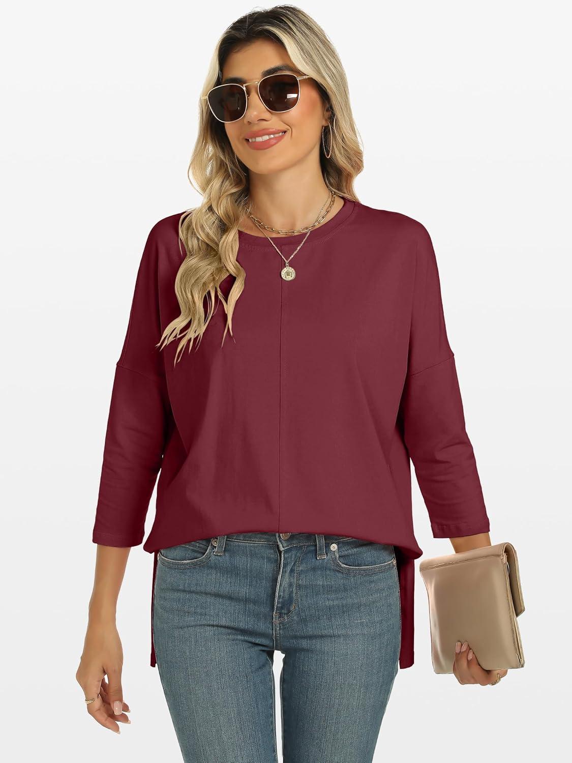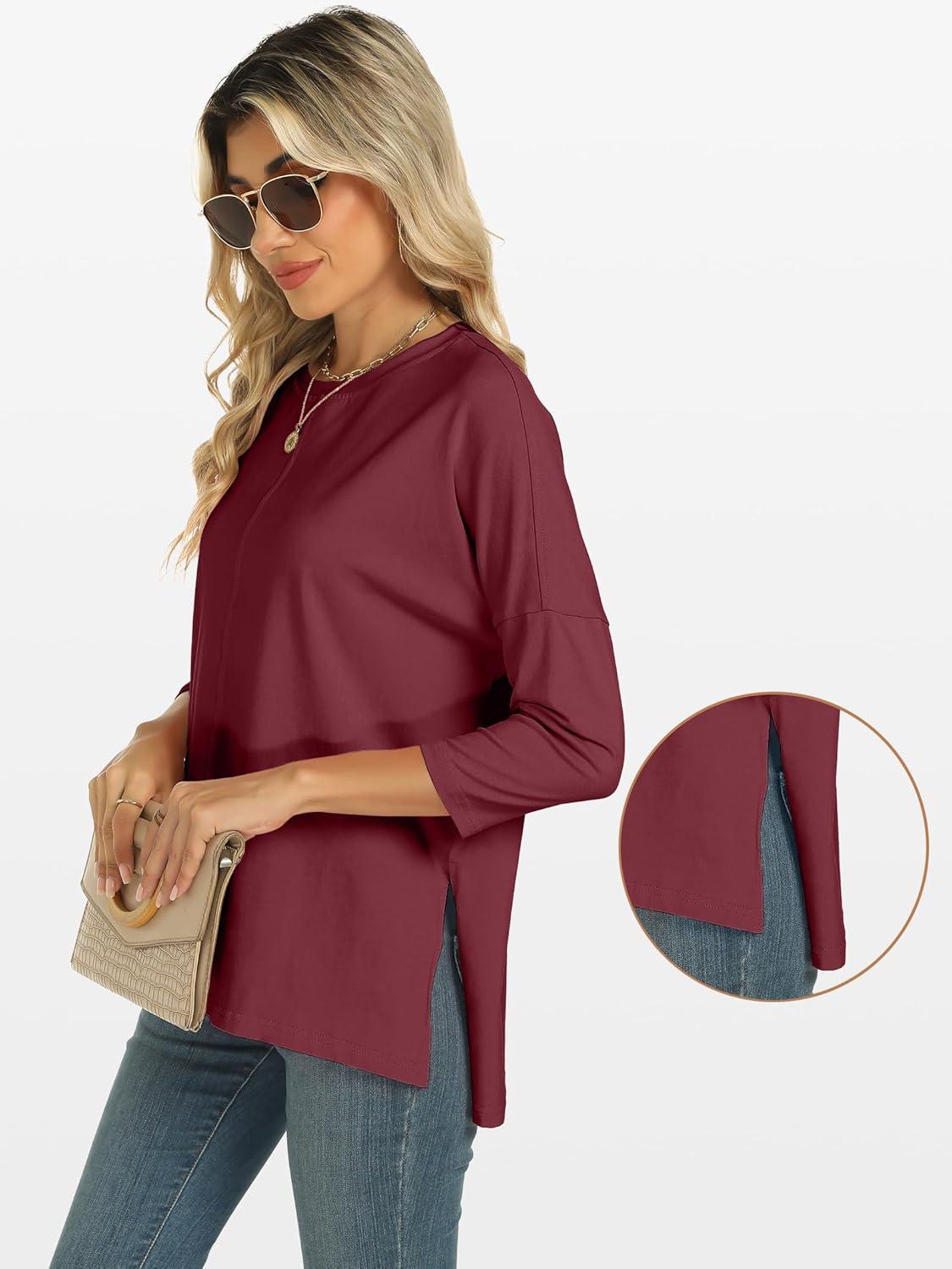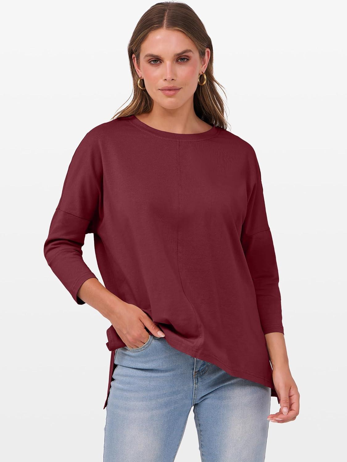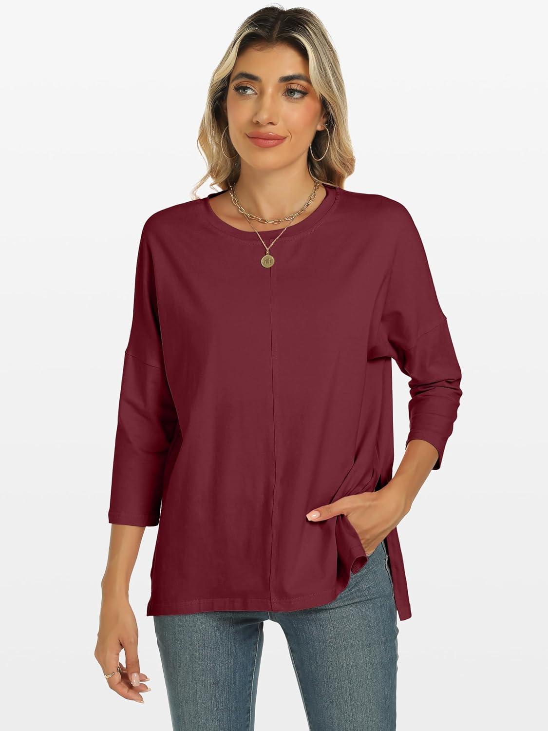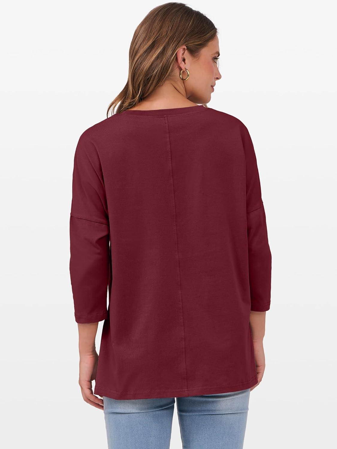 ANRABESS Womens 3/4 Length Sleeve Tops Loose Fit Tunic Shirts Oversized Spring Summer Casual Crew Neck Basic Boxy Tee(Burgundy)