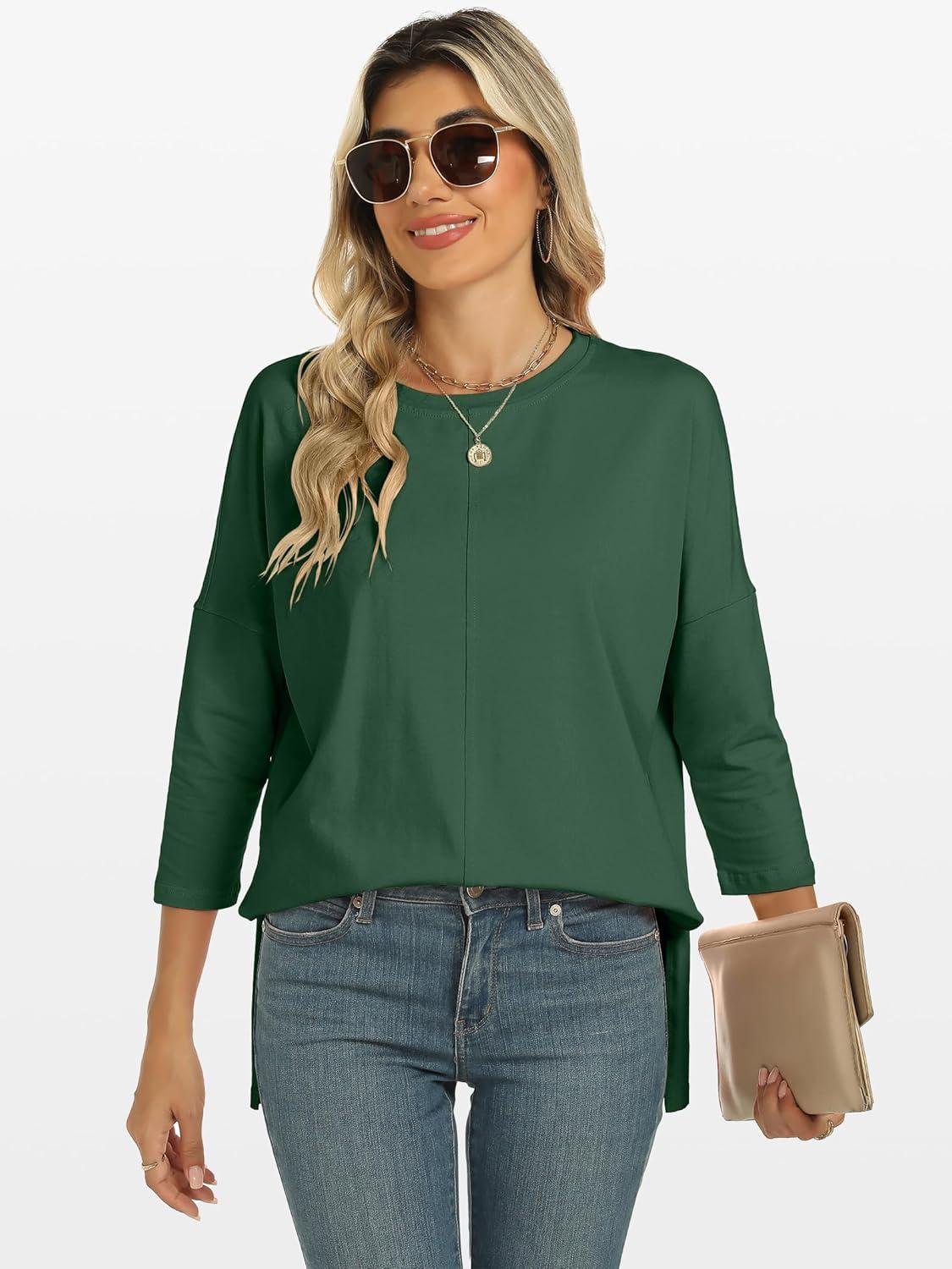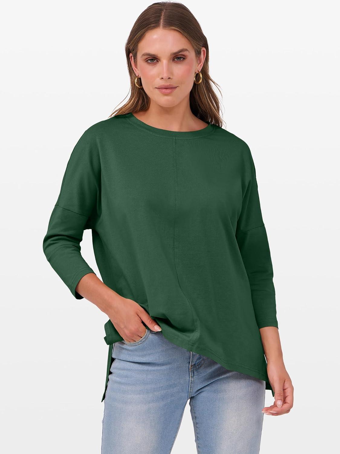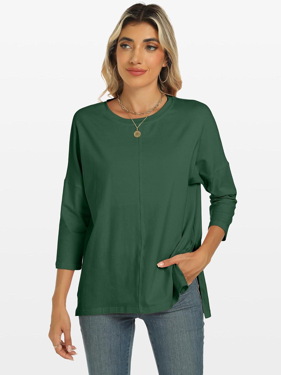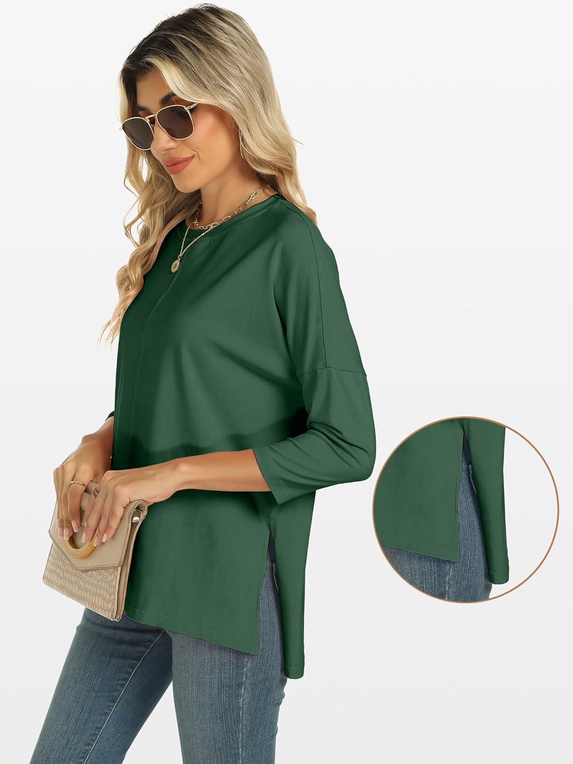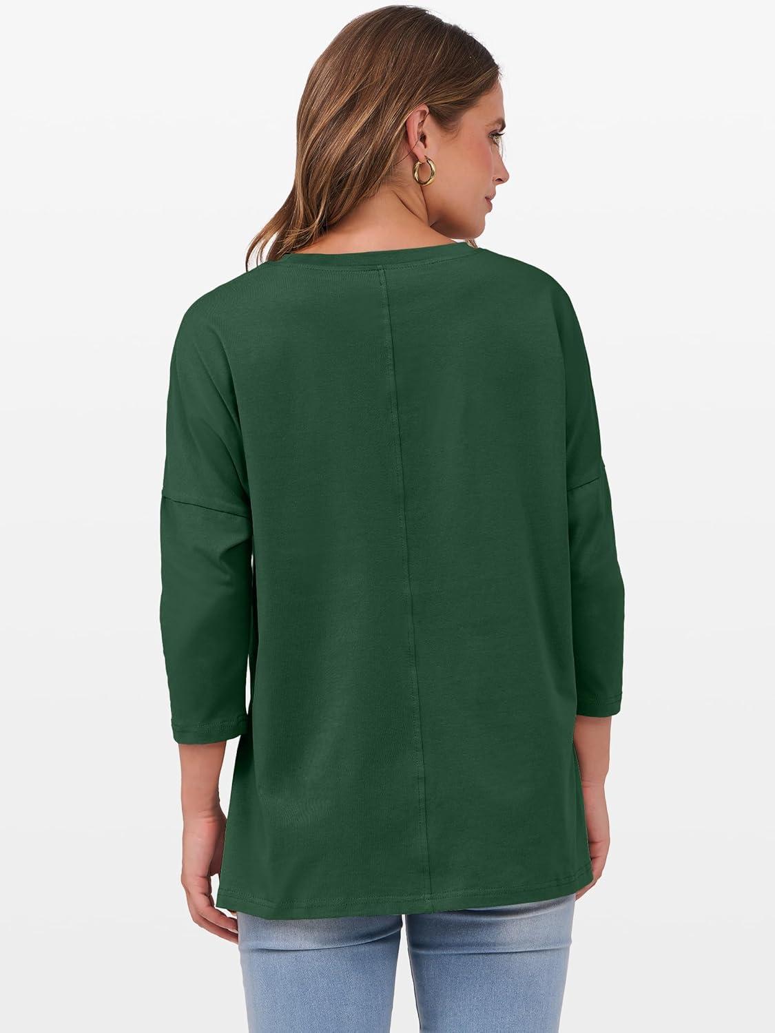 ANRABESS Womens 3/4 Length Sleeve Tops Loose Fit Tunic Shirts Oversized Spring Summer Casual Crew Neck Basic Boxy Tee(Deep Green)