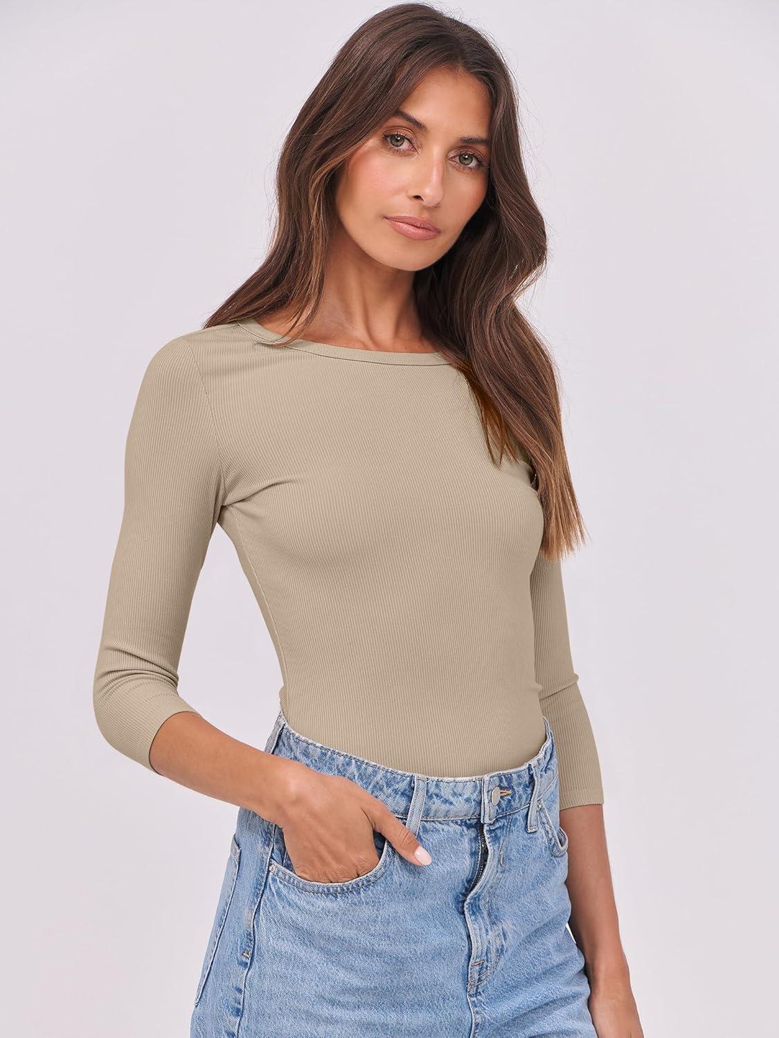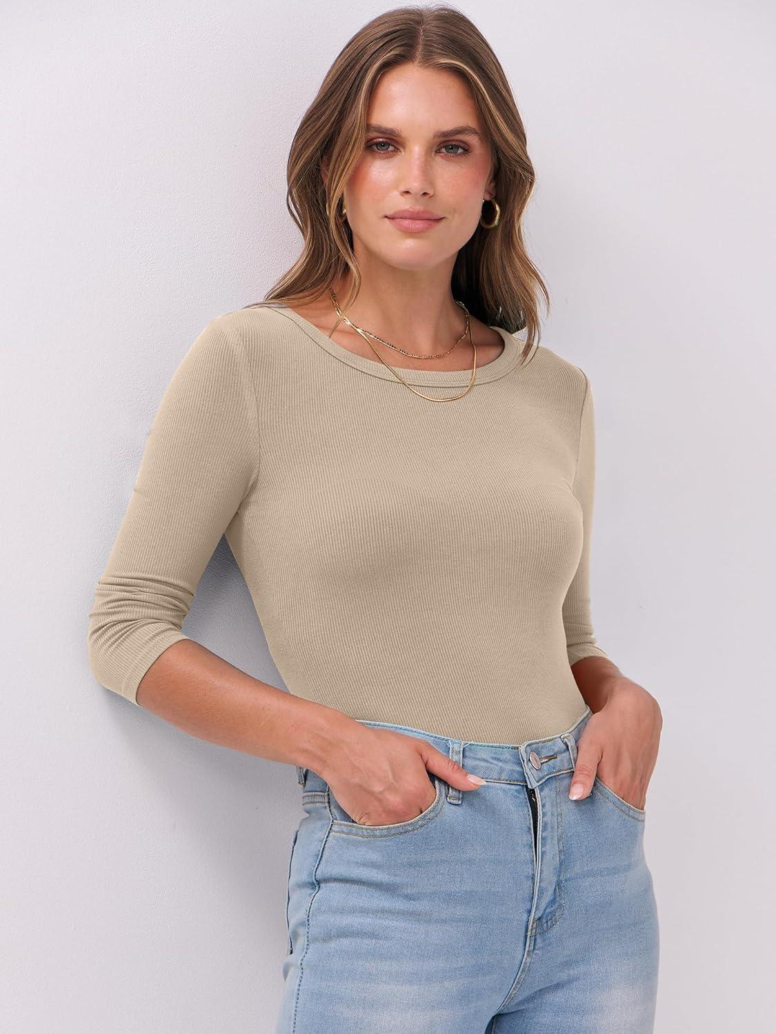 ANRABESS Womens 3/4 Long Sleeve Tops Ribbed Knit Slim Fitted Shirts Basic Tee Fall Outfits 2025 Fashion Y2K Clothes(Light Khaki)