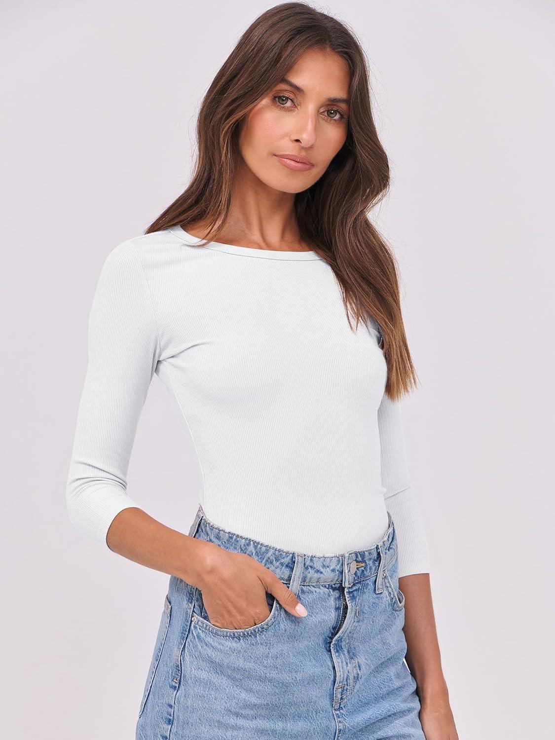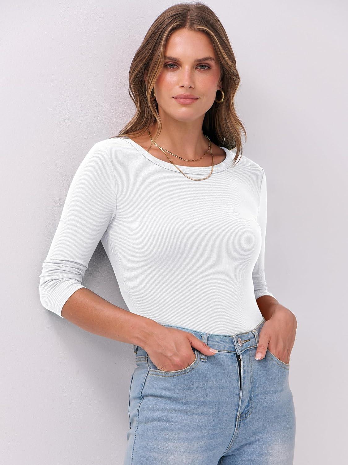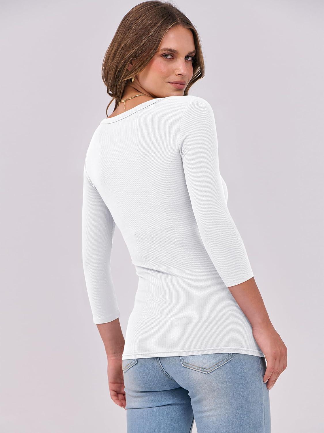 ANRABESS Womens 3/4 Long Sleeve Tops Ribbed Knit Slim Fitted Shirts Basic Tee Fall Outfits 2025 Fashion Y2K Clothes(White)