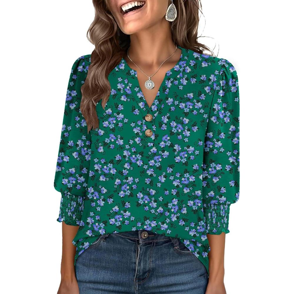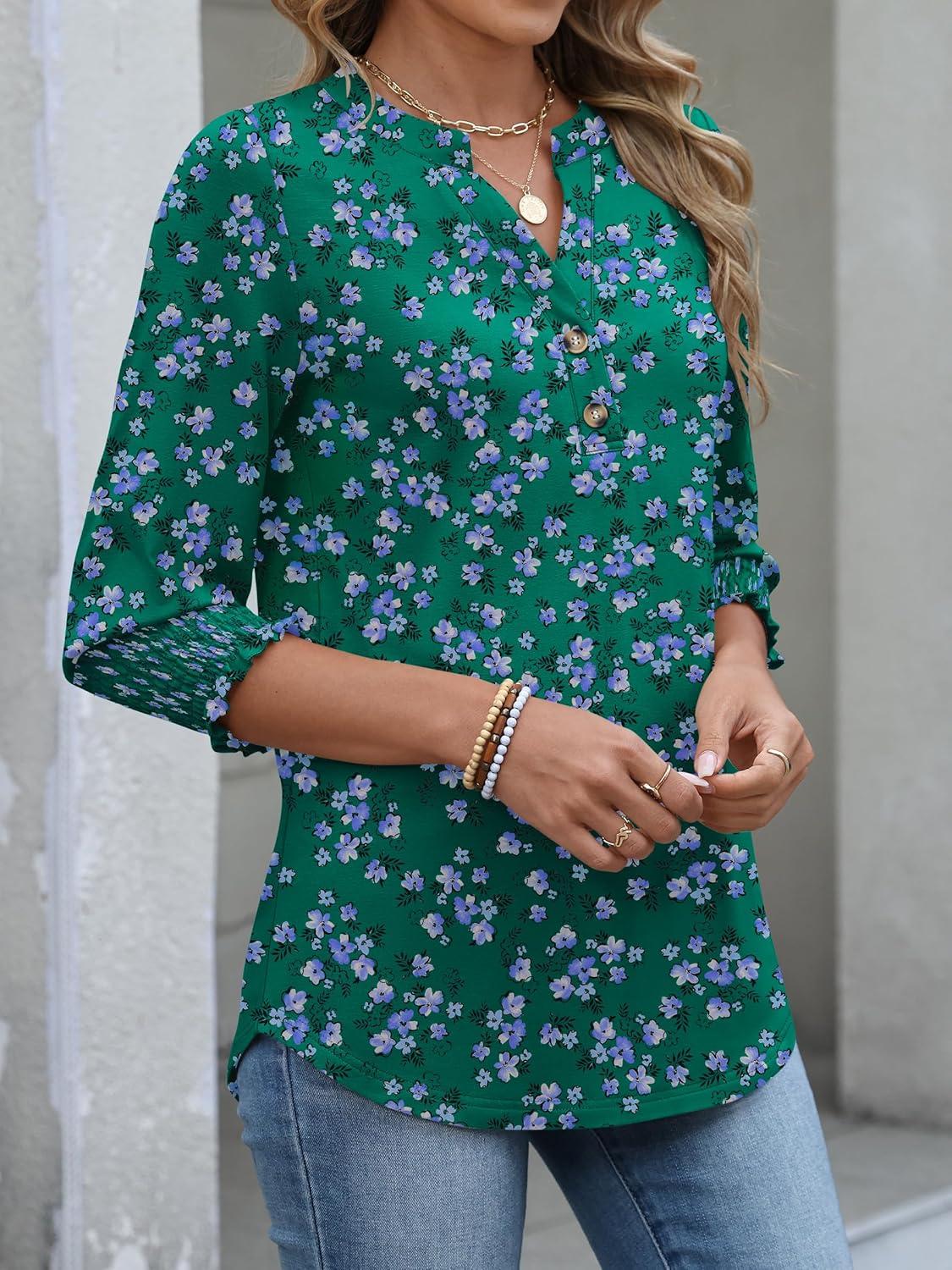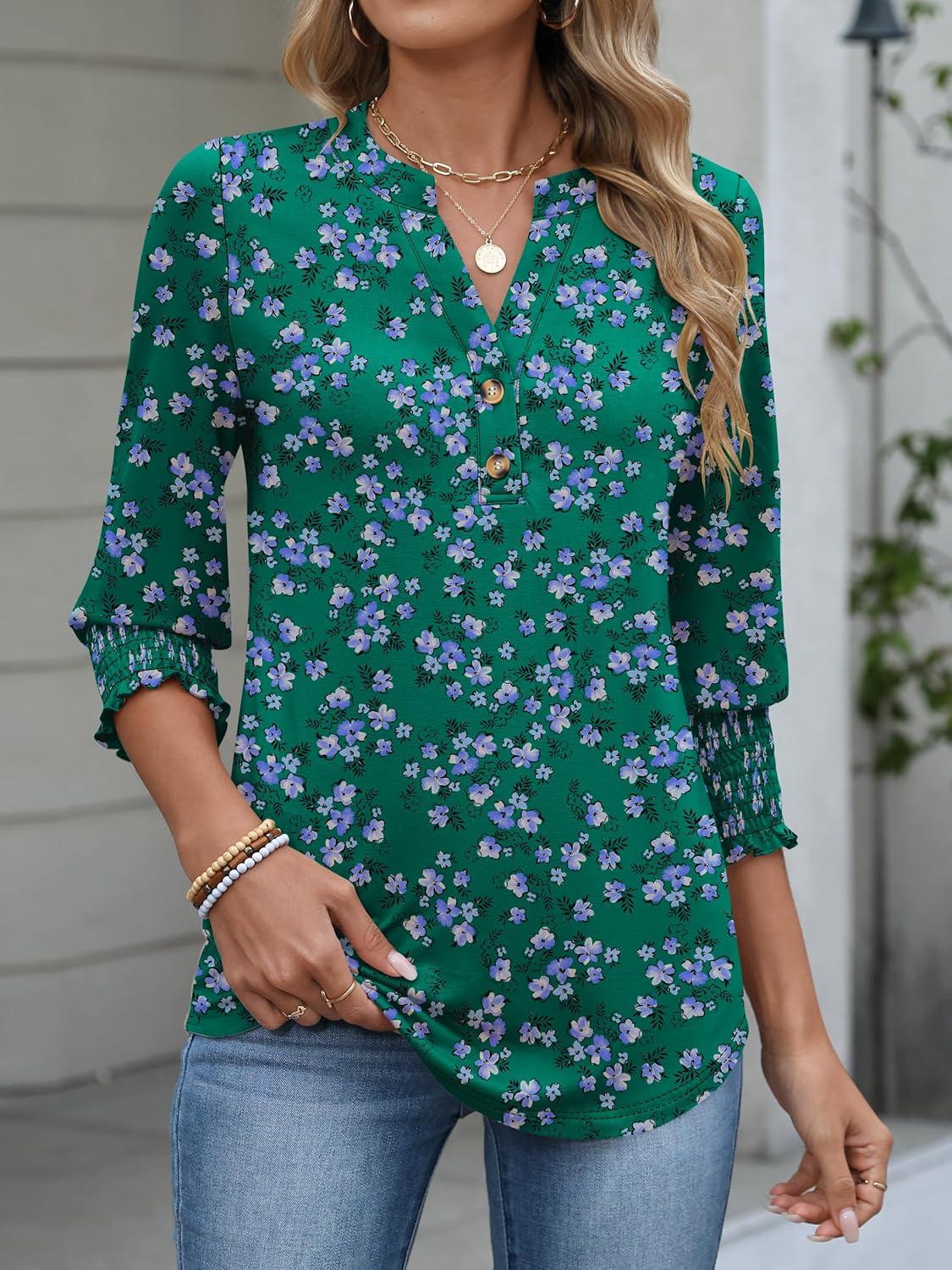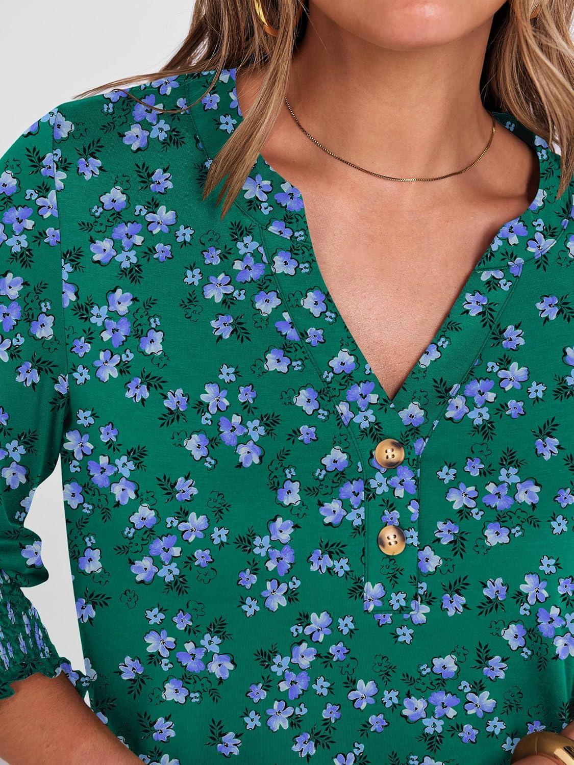 ANRABESS Womens 3/4 Sleeve Blouses Dressy Casual Henley Shirts V Neck Work Business Tee Tops 2025 Fashion Vacation Clothes(Green Purple Floral)