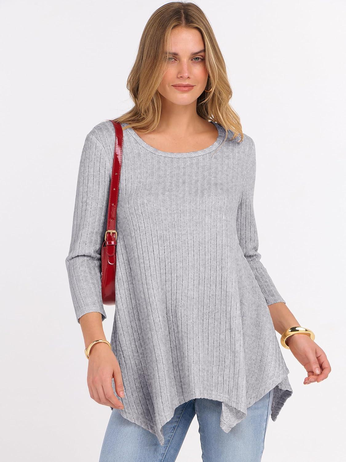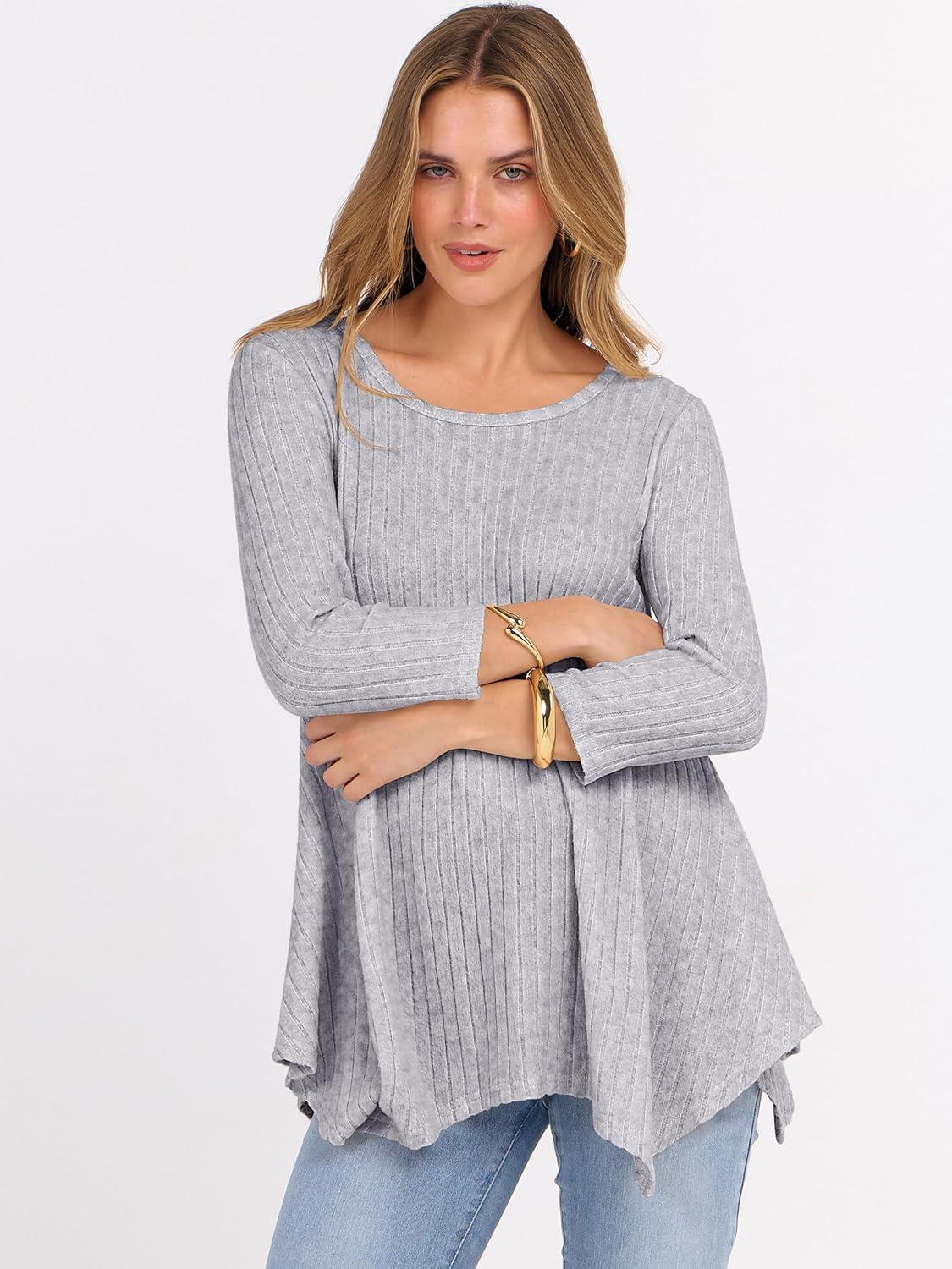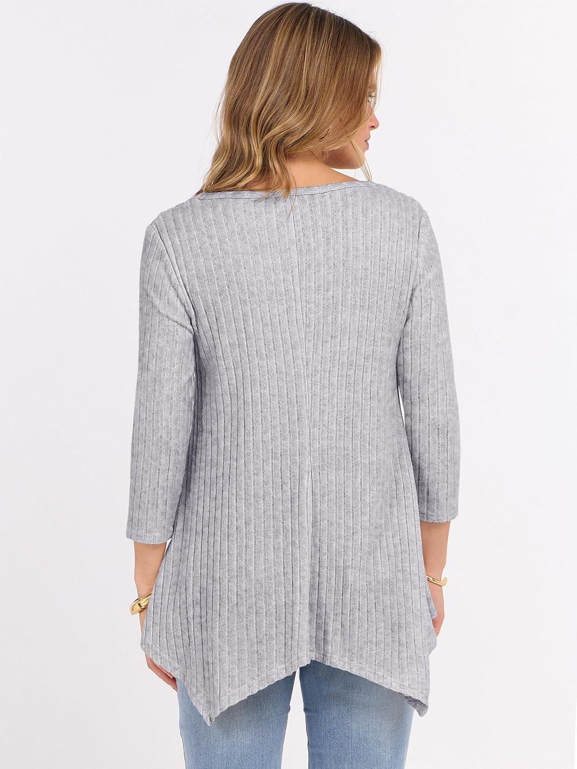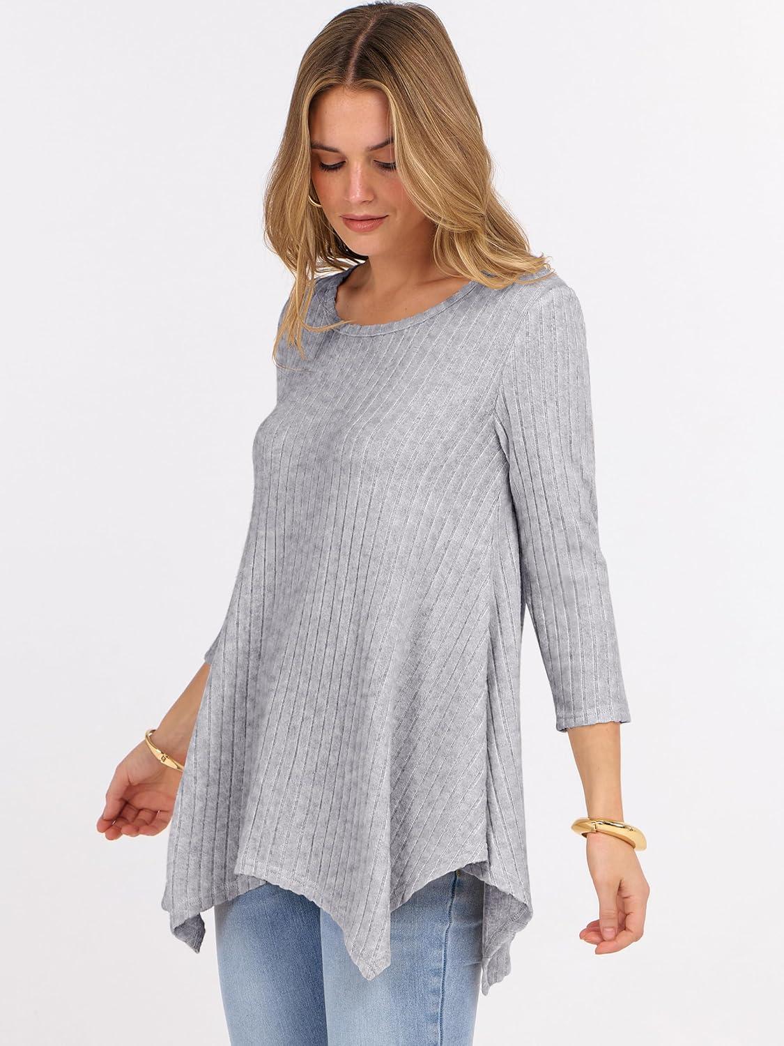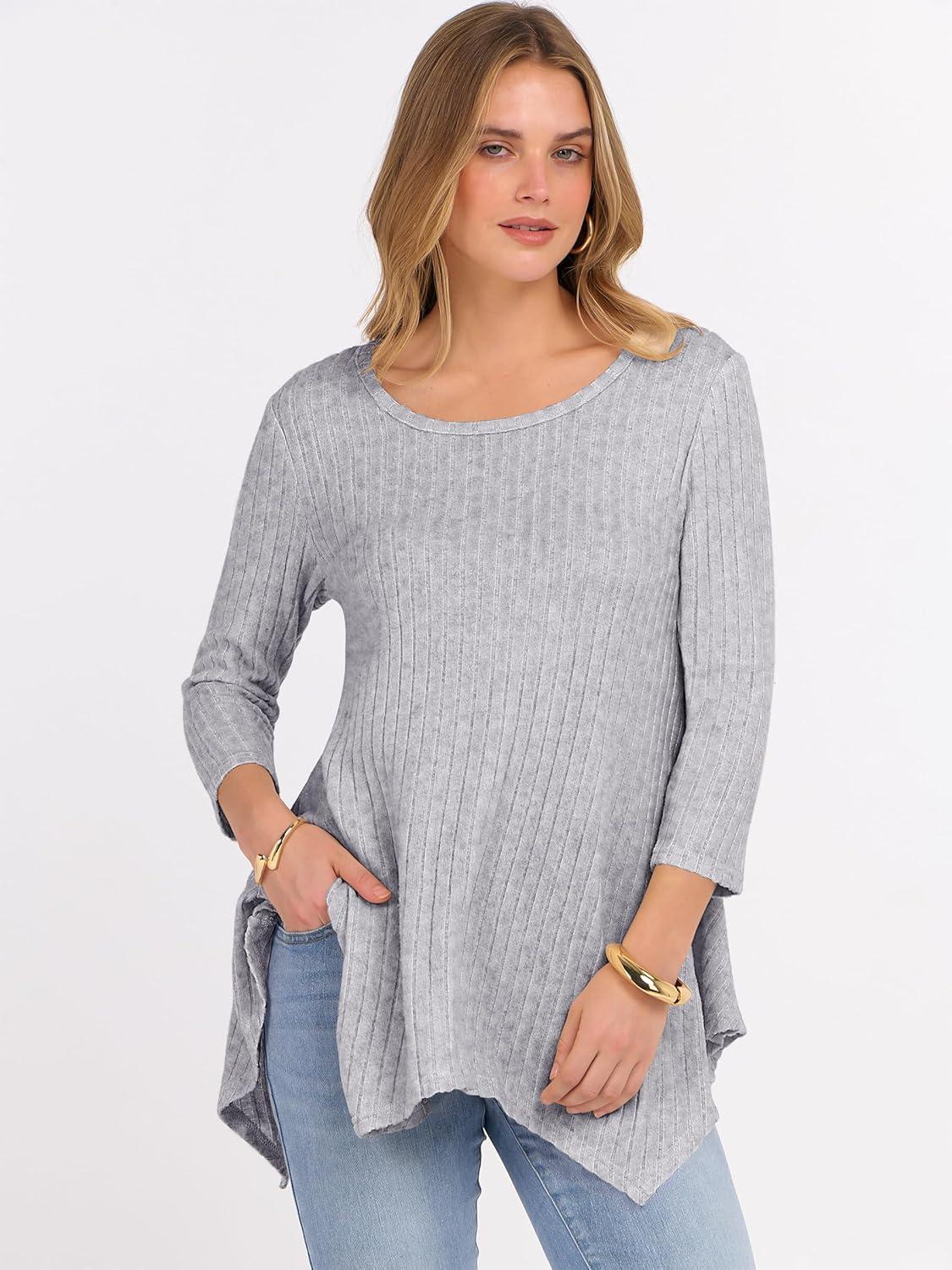 ANRABESS Womens 3/4 Sleeve Flowy Tunic Tops Crew Neck Ribbed Loose Fit Side Slit Shirts Casual Blouses 2025 Fall Clothes(Grey)