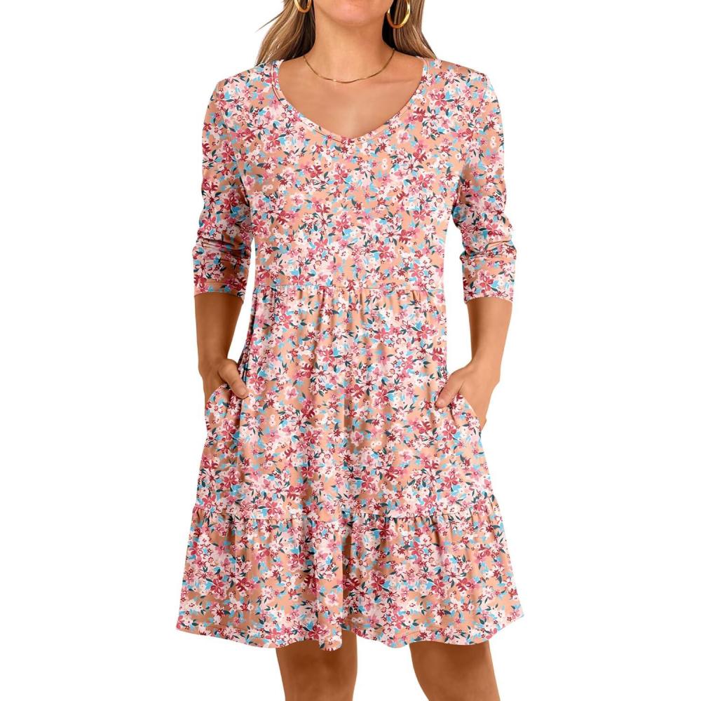 ANRABESS Women’s 3/4 Sleeve Mini Dresses Summer Casual V Neck Flowy Tiered Floral Boho A-line 2026 Beach Vacation Short Dress(Floral Pink)