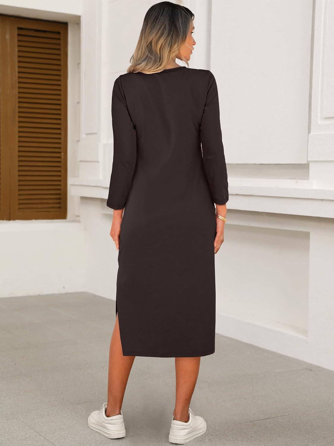 ANRABESS Womens 3/4 Sleeve Striped Slit Midi T Shirt Dresses 2026 Summer Casual Beach Vacation Clothes Spring Travel Sundress(Coffee)