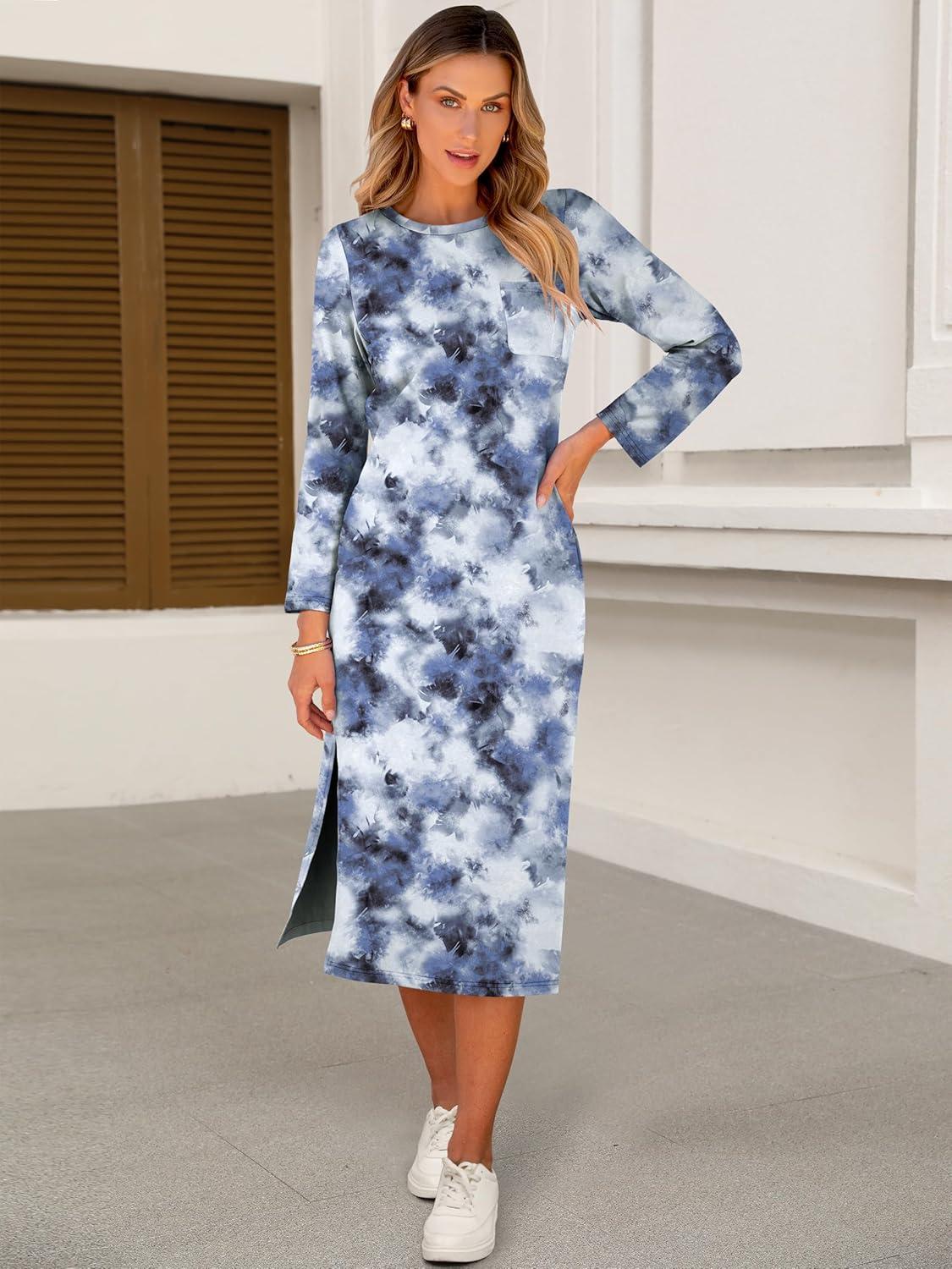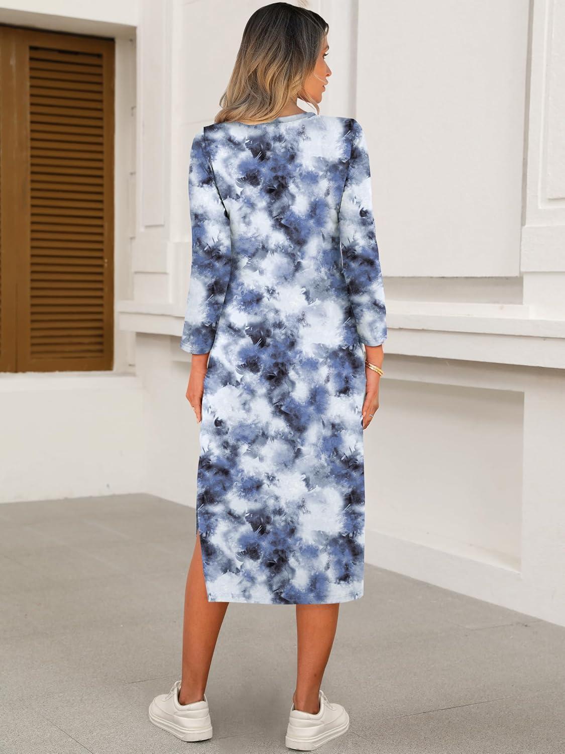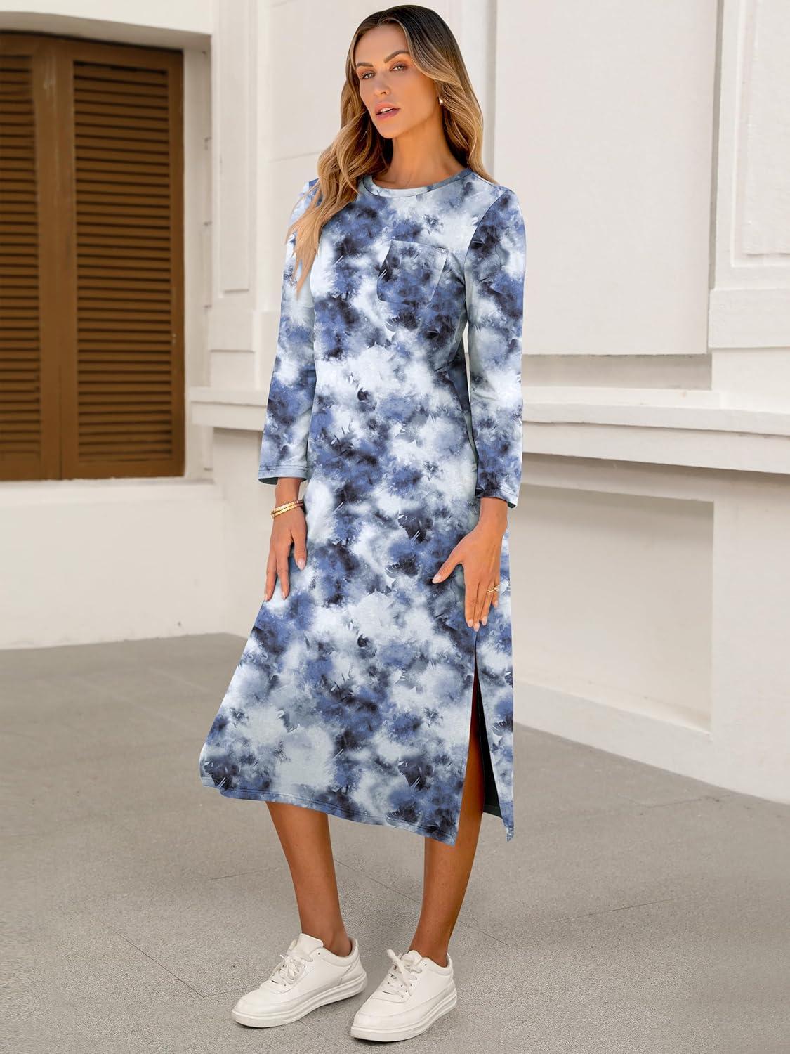 ANRABESS Womens 3/4 Sleeve Striped Slit Midi T Shirt Dresses 2026 Summer Casual Beach Vacation Clothes Spring Travel Sundress(Print Lake Blue)