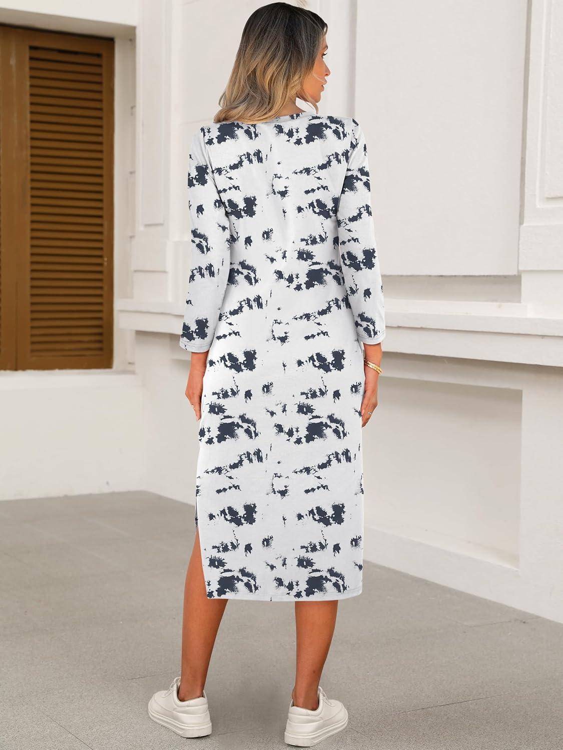 ANRABESS Womens 3/4 Sleeve Striped Slit Midi T Shirt Dresses 2026 Summer Casual Beach Vacation Clothes Spring Travel Sundress(Print Lake Blue)