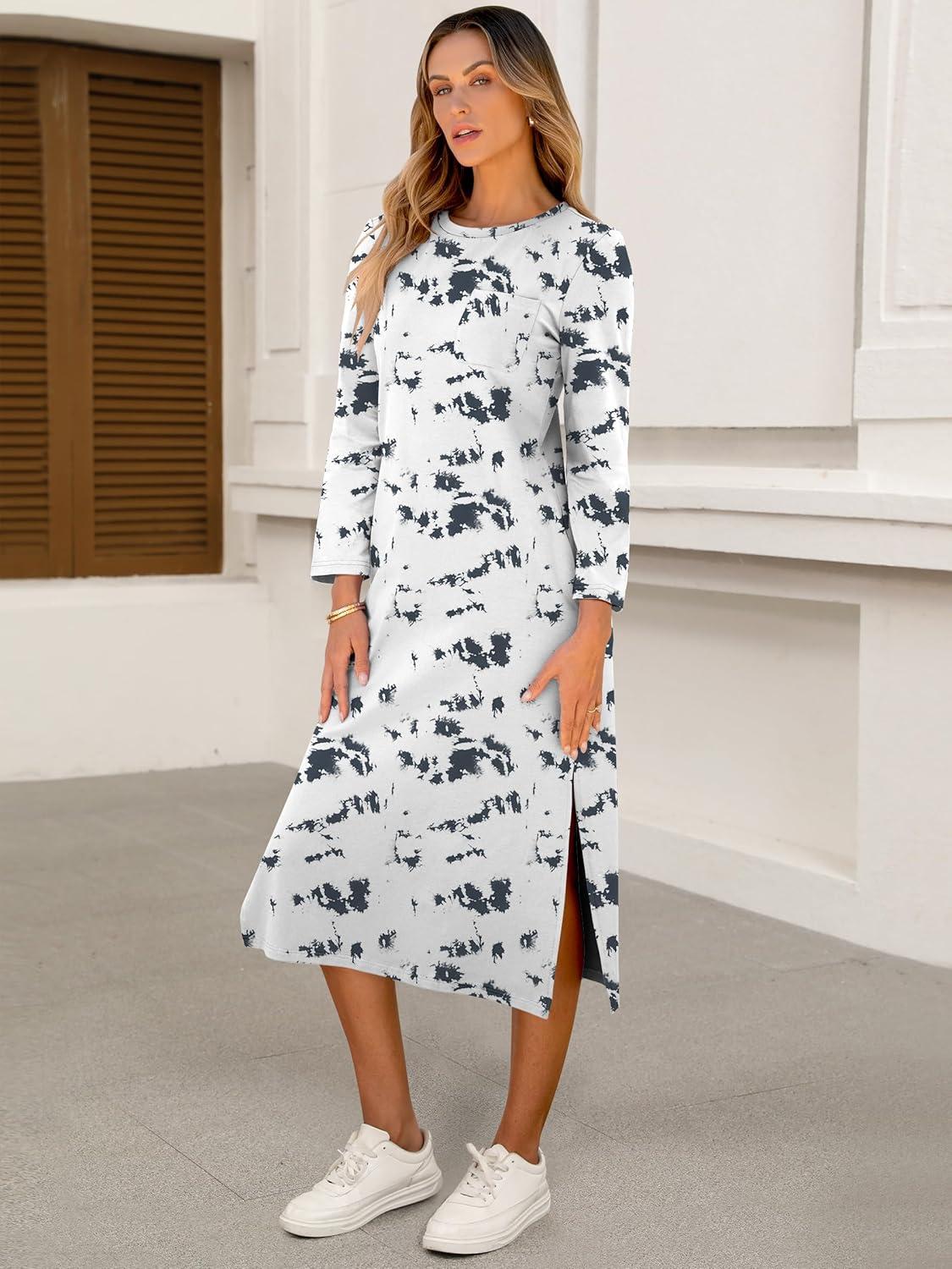 ANRABESS Womens 3/4 Sleeve Striped Slit Midi T Shirt Dresses 2026 Summer Casual Beach Vacation Clothes Spring Travel Sundress(Print White)