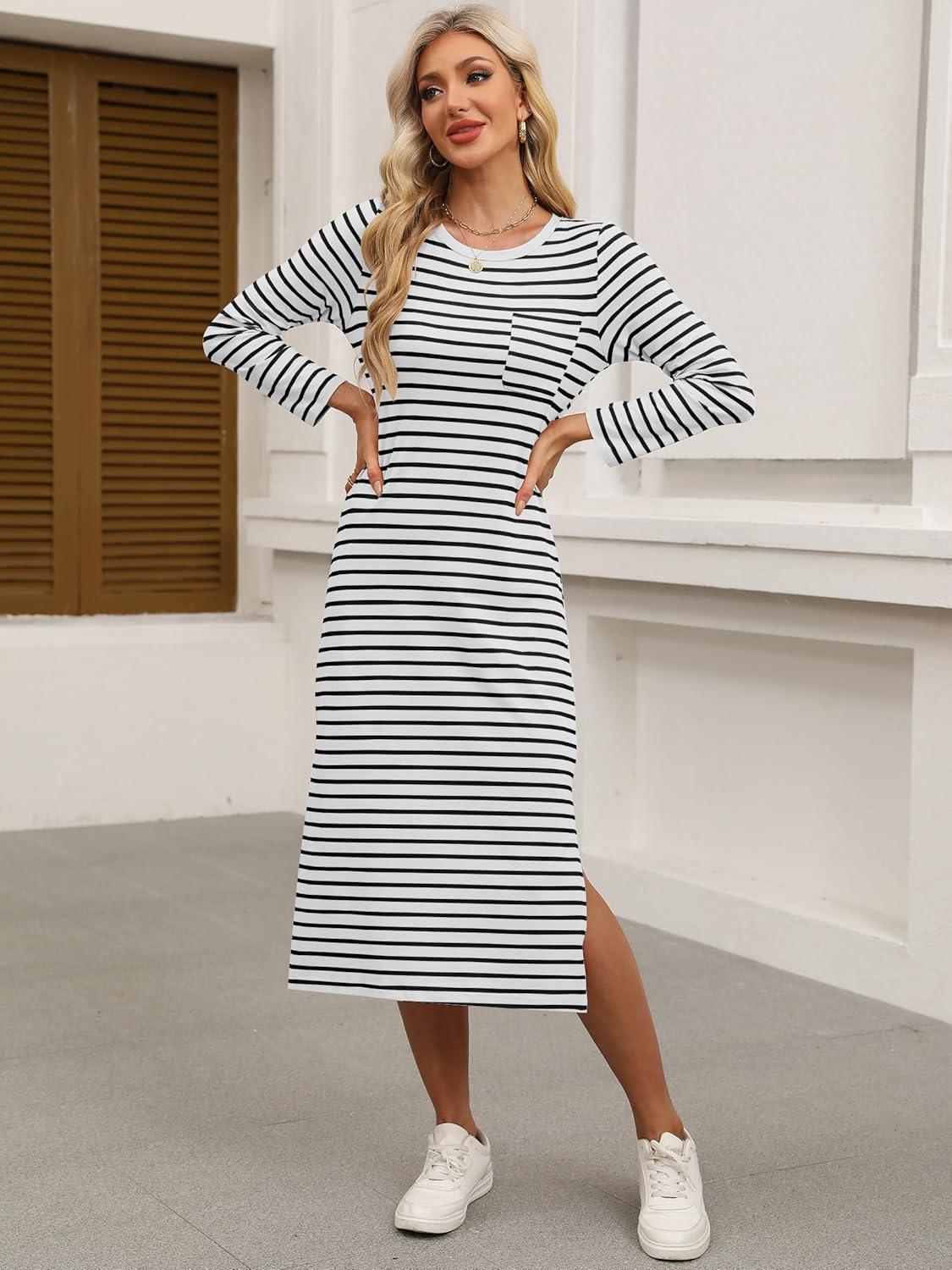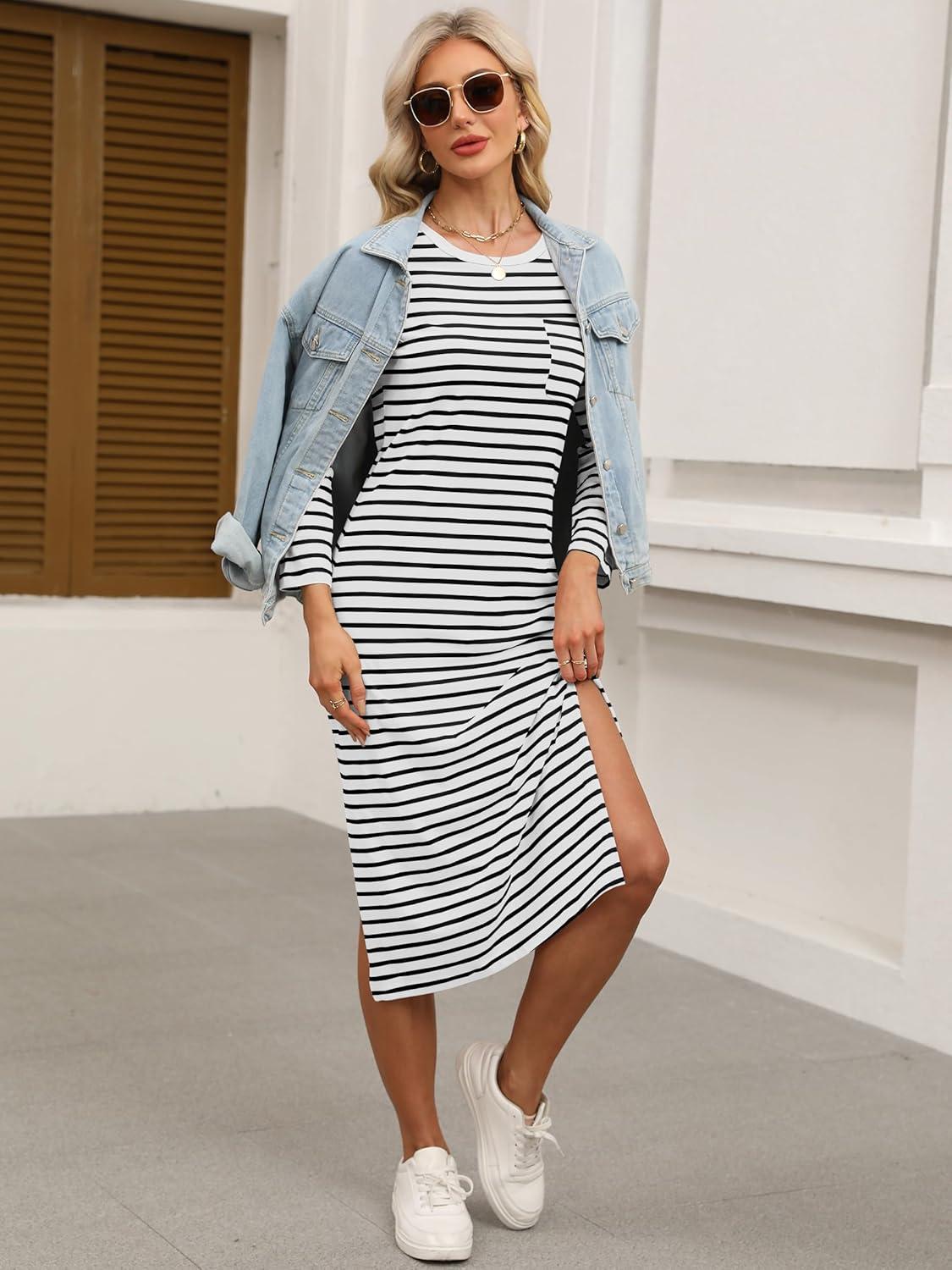 ANRABESS Womens 3/4 Sleeve Striped Slit Midi T Shirt Dresses 2026 Summer Casual Beach Vacation Clothes Spring Travel Sundress(White Black Stripe)
