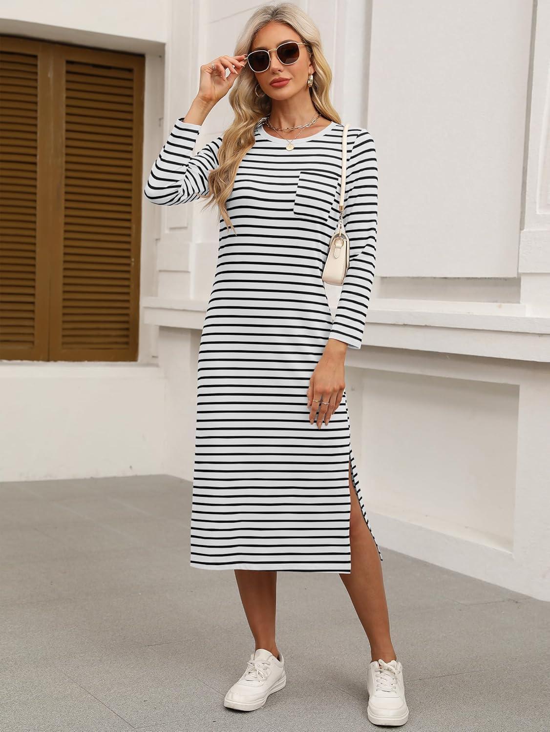 ANRABESS Womens 3/4 Sleeve Striped Slit Midi T Shirt Dresses 2026 Summer Casual Beach Vacation Clothes Spring Travel Sundress(Print White)