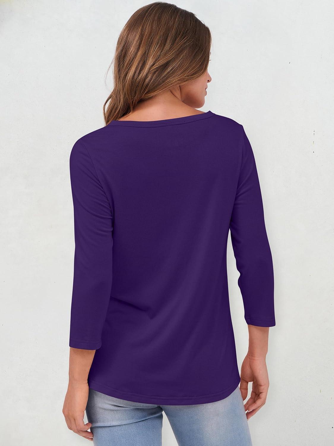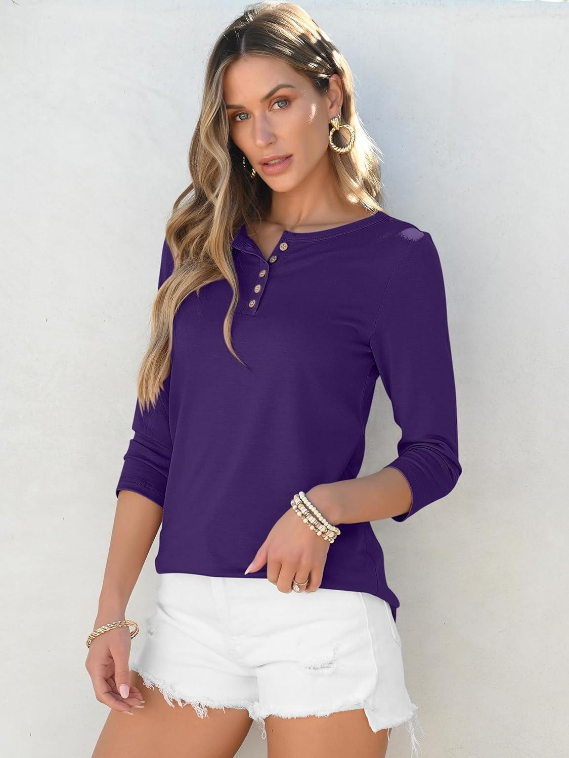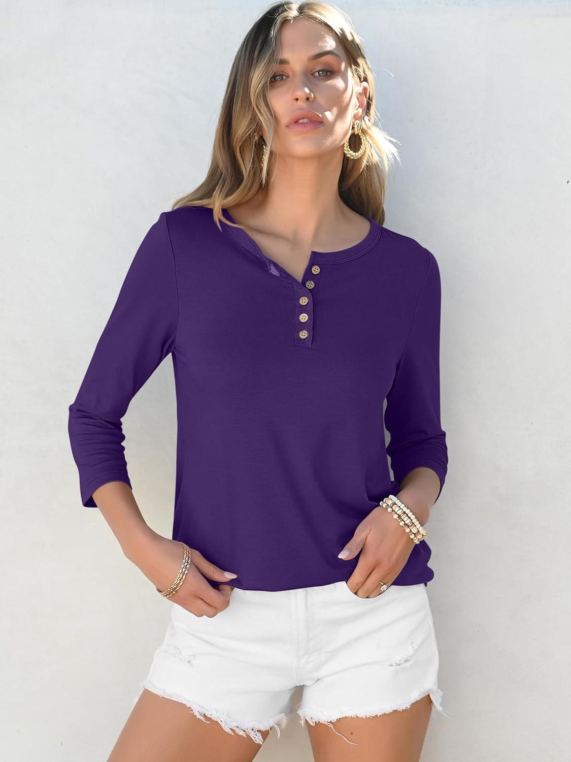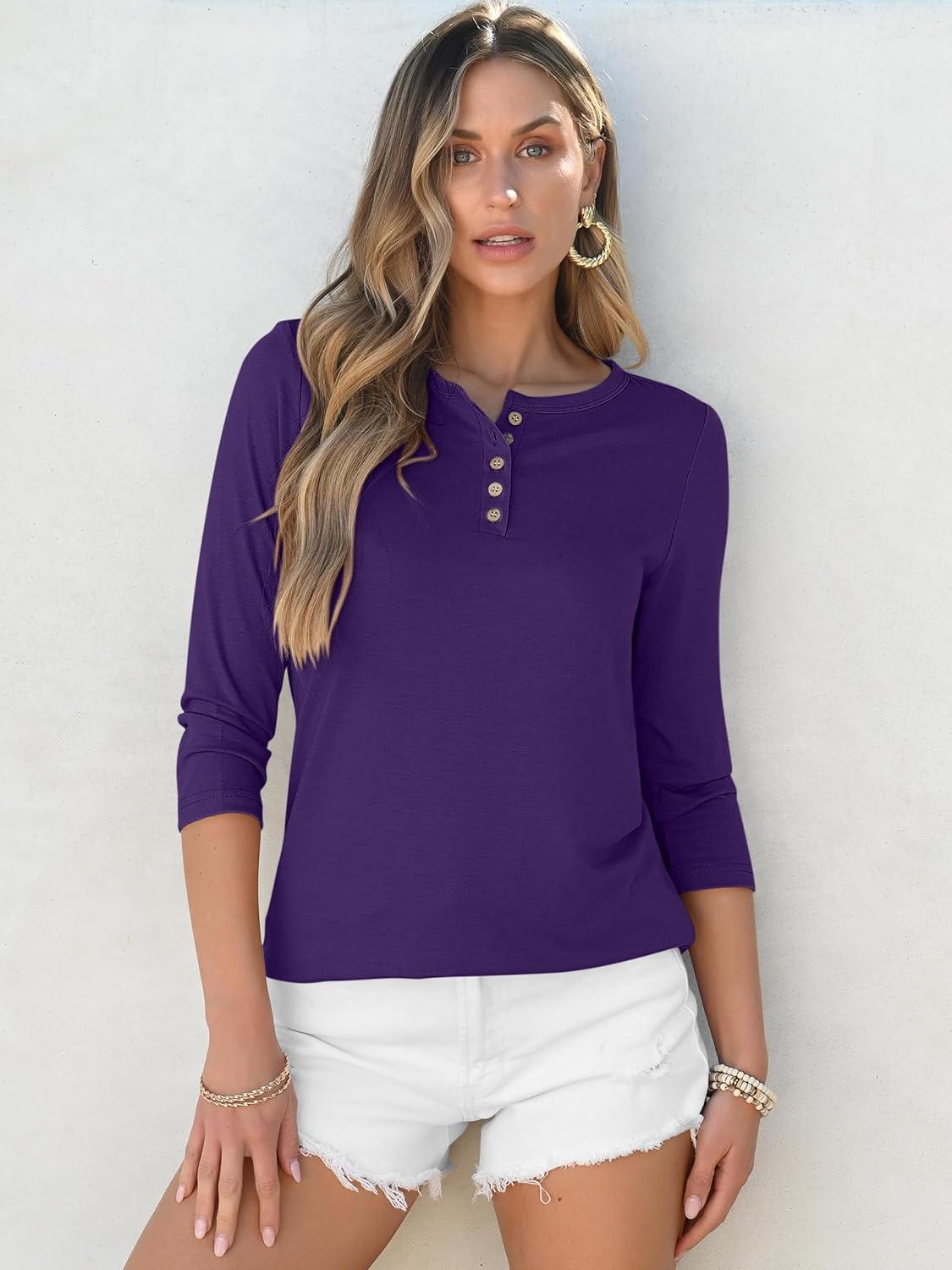 ANRABESS Womens 3/4 Sleeve Tops Henley Shirts Casual Trendy Button T Shirts 2025 Summer Basic Tunic(Purple)