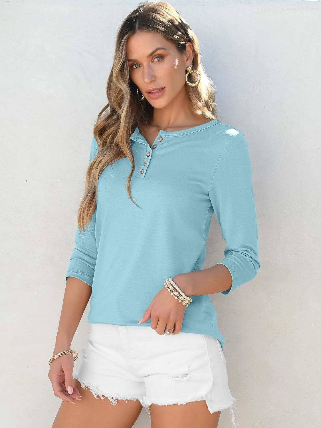ANRABESS Womens 3/4 Sleeve Tops Henley Shirts Casual Trendy Button T Shirts 2026 Summer Basic Tunic(Sky Blue)