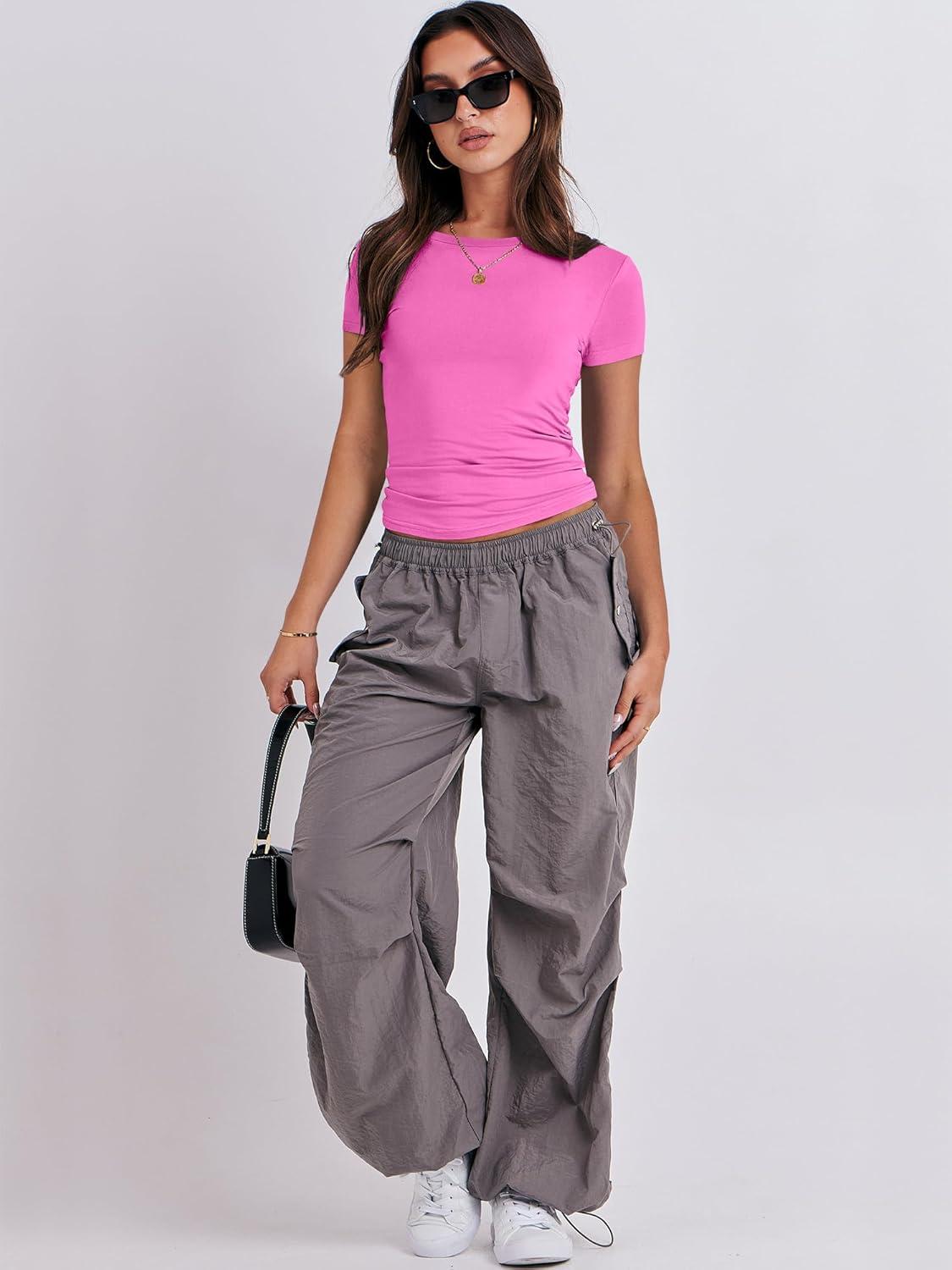 ANRABESS Women’s 3 Pack Short Sleeve Shirts 2025 Crop Tops Tight Fitted Basic Tees Workout T Shirts Y2k Clothes Summer Outfit(Black&white&hot Pink)
