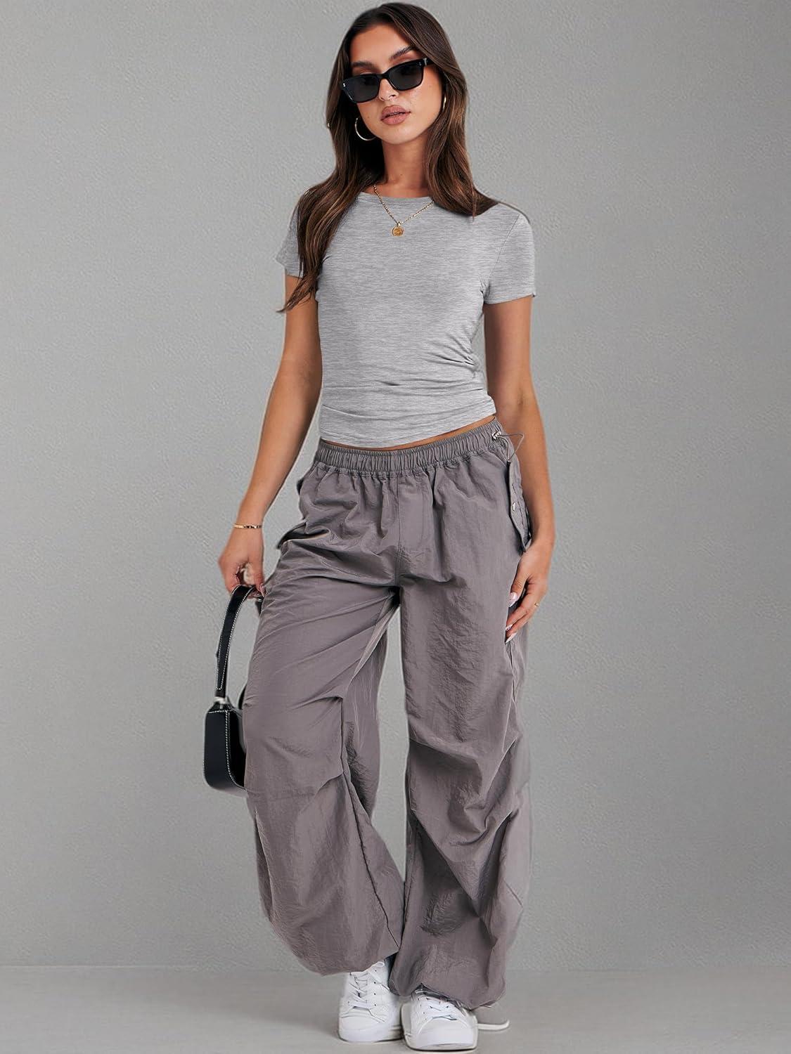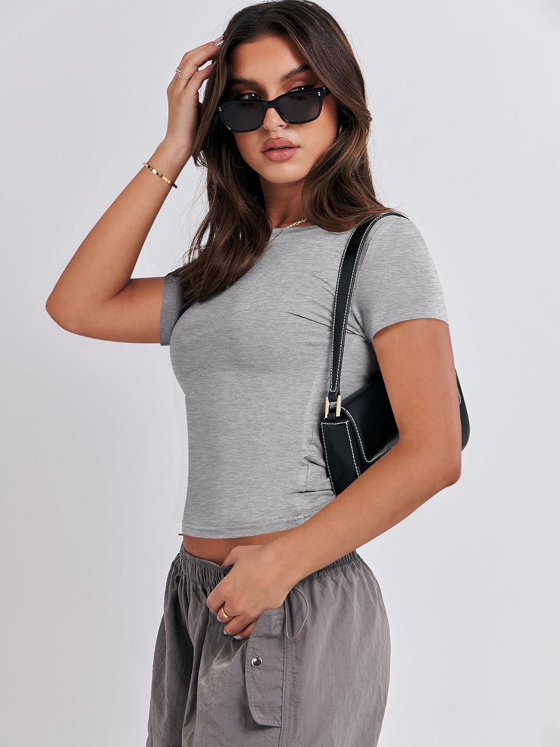 ANRABESS Women’s 3 Pack Short Sleeve Shirts 2026 Crop Tops Tight Fitted Basic Tees Workout T Shirts Y2k Clothes Summer Outfit(Black&white&light Grey)