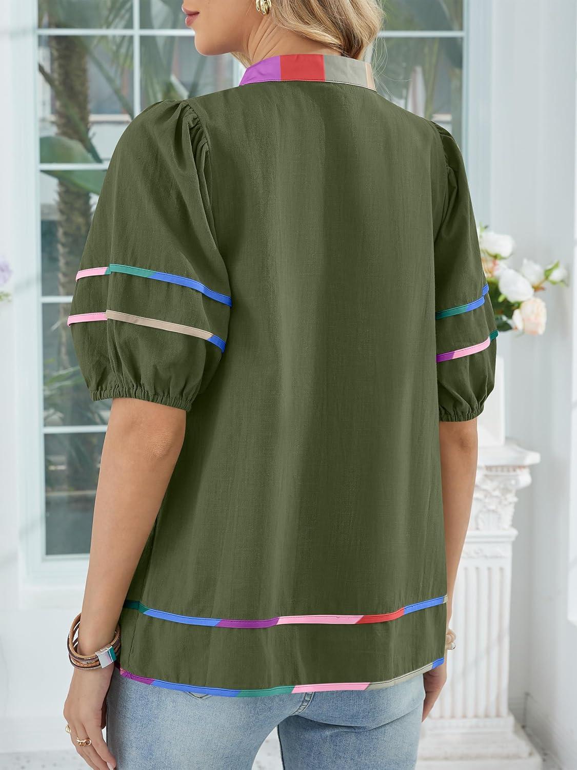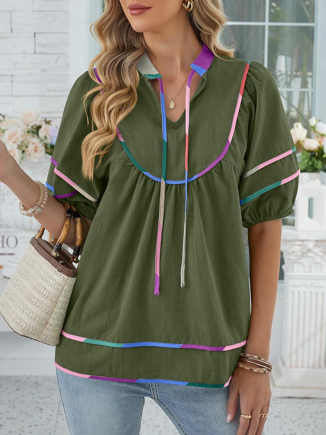 ANRABESS Womens Babydoll Tops 2026 Summer V Neck Boho Blouse Short Lantern Sleeve Dressy Casual Shirts Flowy Peplum T Shirt(Army Green)